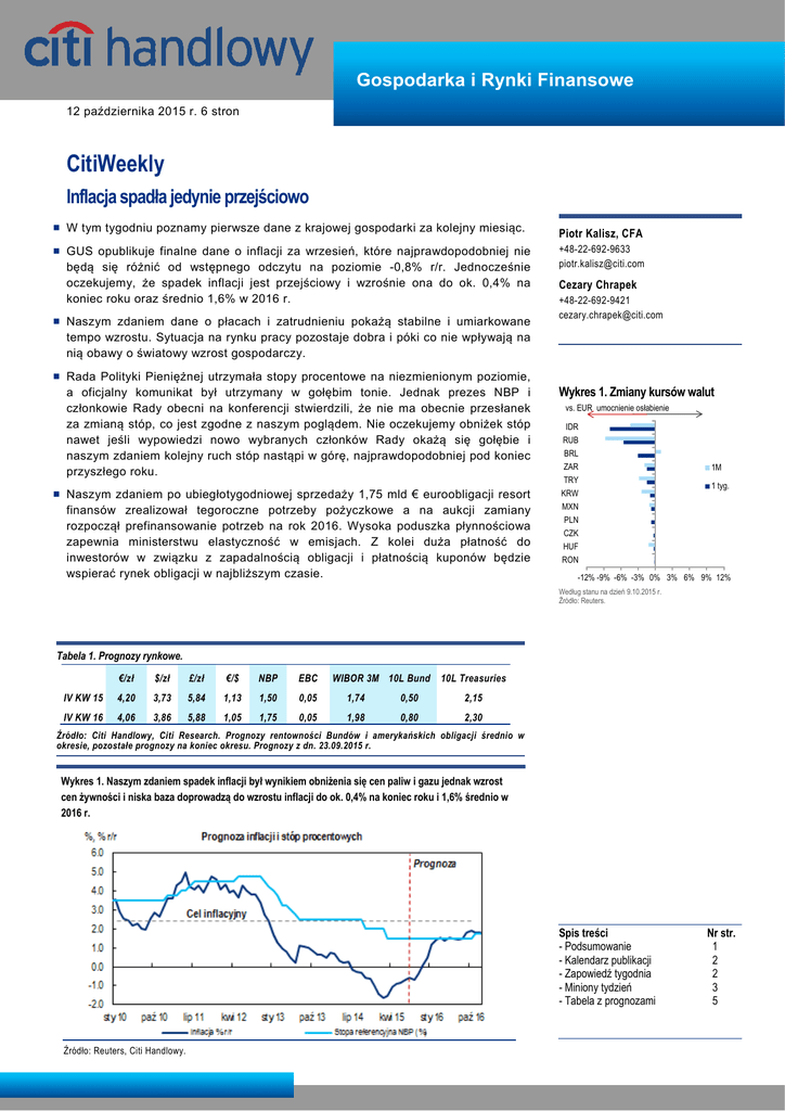 Gospodarka i Rynki Finansowe 12 października 2015 r. 6 stron CitiWeekly Inflacja spadła jedynie przejściowo W tym tygodniu poznamy pierwsze dane z krajowej gospodarki za kolejny miesiąc. GUS opublikuje finalne dane o inflacji za wrzesień, które najprawdopodobniej nie będą się różnić od wstępnego odczytu na poziomie -0,8% r/r. Jednocześnie oczekujemy, że spadek inflacji jest przejściowy i wzrośnie ona do ok. 0,4% na koniec roku oraz średnio 1,6% w 2016 r. Naszym zdaniem dane o płacach i zatrudnieniu pokażą stabilne i umiarkowane tempo wzrostu. Sytuacja na rynku pracy pozostaje dobra i póki co nie wpływają na nią obawy o światowy wzrost gospodarczy. Rada Polityki Pieniężnej utrzymała stopy procentowe na niezmienionym poziomie, a oficjalny komunikat był utrzymany w gołębim tonie. Jednak prezes NBP i członkowie Rady obecni na konferencji stwierdzili, że nie ma obecnie przesłanek za zmianą stóp, co jest zgodne z naszym poglądem. Nie oczekujemy obniżek stóp nawet jeśli wypowiedzi nowo wybranych członków Rady okażą się gołębie i naszym zdaniem kolejny ruch stóp nastąpi w górę, najprawdopodobniej pod koniec przyszłego roku. Naszym zdaniem po ubiegłotygodniowej sprzedaży 1,75 mld € euroobligacji resort finansów zrealizował tegoroczne potrzeby pożyczkowe a na aukcji zamiany rozpoczął prefinansowanie potrzeb na rok 2016. Wysoka poduszka płynnościowa zapewnia ministerstwu elastyczność w emisjach. Z kolei duża płatność do inwestorów w związku z zapadalnością obligacji i płatnością kuponów będzie wspierać rynek obligacji w najbliższym czasie. Piotr Kalisz, CFA +48-22-692-9633 [email protected] Cezary Chrapek +48-22-692-9421 [email protected] Wykres 1. Zmiany kursów walut vs. EUR umocnienie osłabienie IDR RUB BRL ZAR TRY KRW MXN PLN CZK HUF RON 1M 1 tyg. -12% -9% -6% -3% 0% 3% 6% 9% 12% Według stanu na dzień 9.10.2015 r. Źródło: Reuters. Tabela 1. Prognozy rynkowe. €/zł $/zł £/zł €/$ NBP EBC WIBOR 3M 10L Bund 10L Treasuries IV KW 15 4,20 3,73 5,84 1,13 1,50 0,05 1,74 0,50 2,15 IV KW 16 4,06 3,86 5,88 1,05 1,75 0,05 1,98 0,80 2,30 Źródło: Citi Handlowy, Citi Research. Prognozy rentowności Bundów i amerykańskich obligacji średnio w okresie, pozostałe prognozy na koniec okresu. Prognozy z dn. 23.09.2015 r. Wykres 1. Naszym zdaniem spadek inflacji był wynikiem obniżenia się cen paliw i gazu jednak wzrost cen żywności i niska baza doprowadzą do wzrostu inflacji do ok. 0,4% na koniec roku i 1,6% średnio w 2016 r. Spis treści - Podsumowanie - Kalendarz publikacji - Zapowiedź tygodnia - Miniony tydzień - Tabela z prognozami Źródło: Reuters, Citi Handlowy. Nr str. 1 2 2 3 5 CitiWeekly 12/10/2015 Kalendarz publikacji Godz. publikacji Kraj Informacja 12 paź Okres Prognoza Citi Konsensus rynkowy Poprzednia wartość % r/r IX -6.5 -- -5.5 pkt X -1.0 -- 12.1 % r/r VIII -- -- 1.9 Jednostka PONIEDZIAŁEK USA Dzień wolny – Dzień Kolumba USA Wystąpienia przedstawicieli Fed: Lockhart, Evans 13 paź WTOREK 04:00 CN Eksport 11:00 DE Indeks ZEW USA Wystąpienie przedstawiciela Fed: Bullard 14 paź ŚRODA 11:00 EA Produkcja przemysłowa 14:00 PL Bilans obrotów bieżących mln EUR VIII -1260 -969 -1660.0 14:00 PL Eksport mln EUR VIII 12308 12527 13552.0 14:00 PL Import mln EUR VIII 12954 12939 14623 14:30 USA Sprzedaż detaliczna % m/m IX -- -- 0.2 14:30 USA PPI % m/m IX -- -- 0.2 15 paź CZWARTEK 14:00 PL CPI % r/r IX -0.8 -0.8 -0.6 14:30 USA CPI % m/m IX -- -- -0.1 14:30 USA Liczba nowych bezrobotnych tys. tyg. -- -- 263.0 14:30 USA Indeks Empire State pkt X -- -- -6.0 16:00 USA Indeks Philly Fed pkt IX -- -- -6.0 -0.1 16 paź PIĄTEK 11:00 EA CPI % r/r IX -- -- 14:00 PL Płace % r/r IX 3.2 3.4 14:00 PL Zatrudnienie % r/r IX 1.0 1.0 15:15 USA Produkcja przemysłowa % m/m IX -- -- -0.4 16:00 USA Indeks nastrojów Michigan pkt X -- -- 87.2 Źródło: Reuters, Bloomberg, Parkiet, urzędy statystyczne, banki centralne, prognozy Citi Zapowiedź tygodnia Rynek pracy Nie oczekujemy zmian korzystnych trendów na rynku pracy. Zgodnie z naszymi szacunkami nominalny wzrost płac wyniósł we wrześniu 3,2% r/r, podczas gdy wzrost zatrudnienia wyniósł 1% r/r. Szeroki zakres wskaźników włączając stopę bezrobocia jak i liczbę ofert pracy sygnalizują, że ożywienie rynku pracy utrzymuje się nawet pomimo rosnących obaw o koniunkturę w światowej gospodarce. To powinno z kolei wspierać popyt krajowy, a w szczególności konsumpcje prywatną w najbliższych kwartałach. 2 CitiWeekly 12/10/2015 Bilans płatniczy Oczekujemy poprawy w bilansie obrotów bieżących za sprawą lepszego salda handlowego. Według naszych prognoz bilans obrotów bieżących poprawił się o ok. 400 mln EUR do -1,2 mld EUR, a konsensus rynkowy zakłada jeszcze niższy deficyt (poniżej 1 mld EUR). Naszym zdaniem ta poprawa wynikała przede wszystkim z poprawy w bilansie handlowym, na które złożyło się przyspieszenie eksportu (do 5,9% r/r z 1,1% w lipcu) oraz mnijesza skala przyspieszenia importu (do 9,4% r/r z 6,9% w lipcu). Zmiany na pozostałych rachunkach były naszym zdaniem niewielkie. Wykres 2. Oczekujemy poprawy na rachunku obrotów bieżących, choć w Wykres 3. Rynek zaczął wyceniać obniżkę stóp, jednak naszym zdaniem nieco mniejszej skali niż oczekuje rynek. wciąż bardziej prawdopodobnym następnym ruchem jest ich podwyższenie, choć może się ono odsunąć w czasie. mln € Bilans obrotów biezacych 2.00 2,500 2,000 1,500 1,000 500 0 -500 -1,000 -1,500 -2,000 -2,500 -3,000 -3,500 -4,000 -4,500 % Stopa NBP implikowana ze stawek FRA 1.75 aktualny poziom stopy referencyjnej NBP 1.50 1.50 1.50 1.50 1.50 1.50 1.50 1.50 1.50 1.50 1.50 1.50 1.50 1.50 1.50 1.50 1.50 1.50 1.50 1.50 1.50 1.25 1.00 sty 11 lip 11 sty 12 lip 12 sty 13 lip 13 sty 14 lip 14 sty 15 lip 15 Bilans handlowy Usługi Dochody Transfery bieżące Rachunek obrotów bieżących Źródło: GUS, NBP, Citi Handlowy. lis 15 lut 16 maj 16 sie 16 Stop