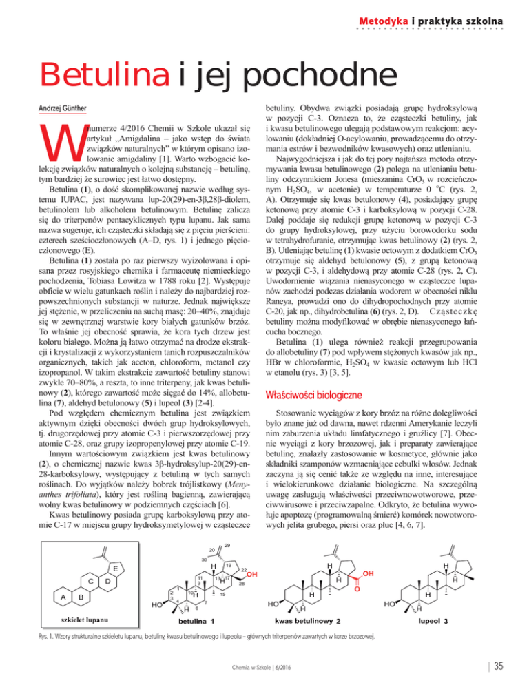 Metodyka i praktyka szkolna Betulina i jej pochodne Andrzej Günther W numerze 4/2016 Chemii w Szkole ukazał się artykuł „Amigdalina – jako wstęp do świata związków naturalnych” w którym opisano izolowanie amigdaliny [1]. Warto wzbogacić kolekcję związków naturalnych o kolejną substancję – betulinę, tym bardziej że surowiec jest łatwo dostępny. Betulina (1), o dość skomplikowanej nazwie według systemu IUPAC, jest nazywana lup-20(29)-en-3β,28β-diolem, betulinolem lub alkoholem betulinowym. Betulinę zalicza się do triterpenów pentacyklicznych typu lupanu. Jak sama nazwa sugeruje, ich cząsteczki składają się z pięciu pierścieni: czterech sześcioczłonowych (A–D, rys. 1) i jednego pięcioczłonowego (E). Betulina (1) została po raz pierwszy wyizolowana i opisana przez rosyjskiego chemika i farmaceutę niemieckiego pochodzenia, Tobiasa Lowitza w 1788 roku [2]. Występuje obficie w wielu gatunkach roślin i należy do najbardziej rozpowszechnionych substancji w naturze. Jednak największe jej stężenie, w przeliczeniu na suchą masę: 20–40%, znajduje się w zewnętrznej warstwie kory białych gatunków brzóz. To właśnie jej obecność sprawia, że kora tych drzew jest koloru białego. Można ją łatwo otrzymać na drodze ekstrakcji i krystalizacji z wykorzystaniem tanich rozpuszczalników organicznych, takich jak aceton, chloroform, metanol czy izopropanol. W takim ekstrakcie zawartość betuliny stanowi zwykle 70–80%, a reszta, to inne triterpeny, jak kwas betulinowy (2), którego zawartość może sięgać do 14%, allobetulina (7), aldehyd betulonowy (5) i lupeol (3) [2-4]. Pod względem chemicznym betulina jest związkiem aktywnym dzięki obecności dwóch grup hydroksylowych, tj. drugorzędowej przy atomie C-3 i pierwszorzędowej przy atomie C-28, oraz grupy izopropenylowej przy atomie C-19. Innym wartościowym związkiem jest kwas betulinowy (2), o chemicznej nazwie kwas 3β-hydroksylup-20(29)-en28-karboksylowy, występujący z betuliną w tych samych roślinach. Do wyjątków należy bobrek trójlistkowy (Menyanthes trifoliata), który jest rośliną bagienną, zawierającą wolny kwas betulinowy w podziemnych częściach [6]. Kwas betulinowy posiada grupę karboksylową przy atomie C-17 w miejscu grupy hydroksymetylowej w cząsteczce betuliny. Obydwa związki posiadają grupę hydroksylową w pozycji C-3. Oznacza to, że cząsteczki betuliny, jak i kwasu betulinowego ulegają podstawowym reakcjom: acylowaniu (dokładniej O-acylowaniu, prowadzącemu do otrzymania estrów i bezwodników kwasowych) oraz utlenianiu. Najwygodniejsza i jak do tej pory najtańsza metoda otrzymywania kwasu betulinowego (2) polega na utlenianiu betuliny odczynnikiem Jonesa (mieszanina CrO3 w rozcieńczonym H2SO4, w acetonie) w temperaturze 0 oC (rys. 2, A). Otrzymuje się kwas betulonowy (4), posiadający grupę ketonową przy atomie C-3 i karboksylową w pozycji C-28. Dalej poddaje się redukcji grupę ketonową w pozycji C-3 do grupy hydroksylowej, przy użyciu borowodorku sodu w tetrahydrofuranie, otrzymując kwas betulinowy (2) (rys. 2, B). Utleniając betulinę (1) kwasie octowym z dodatkiem CrO3 otrzymuje się aldehyd betulonowy (5), z grupą ketonową w pozycji C-3, i aldehydową przy atomie C-28 (rys. 2, C). Uwodornienie wiązania nienasyconego w cząsteczce lupanów zachodzi podczas działania wodorem w obecności niklu Raneya, prowadzi ono do dihydropochodnych przy atomie C-20, jak np., dihydrobetulina (6) (rys. 2, D). Cząsteczkę betuliny można modyfikować w obrębie nienasyconego łańcucha bocznego. Betulina (1) ulega również reakcji przegrupowania do allobetuliny (7) pod wpływem stężonych kwasów jak np., HBr w chloroformie, H2SO4 w kwasie octowym lub HCl w etanolu (rys. 3) [3, 5]. Właściwości biologiczne Stosowanie wyciągów z kory brzóz na różne dolegliwości było znane już od dawna, nawet rdzenni Amerykanie leczyli nim zaburzenia układu limfatycznego i gruźlicy [7]. Obecnie wyciągi z kory brzozowej, jak i preparaty zawierające betulinę, znalazły zastosowanie w kosmetyce, głównie jako składniki szamponów wzmacniające cebulki włosów. Jednak zaczyna ją się cenić także ze względu na inne, interesujące i wielokierunkowe działanie biologiczne. Na szczególną uwagę zasługują właściwości przeciwnowotworowe, przeciwwirusowe i przeciwzapalne. Odkryto, że betulina wywołuje apoptozę (programowalną śmierć) komórek nowotworowych jelita grubego, piersi oraz płuc [4, 6, 7]. 29 20 30 C A 11 9 D 2 3 B HO szkielet lupanu 1 H 7 6 betulina 1 H OH OH H 28 H 15 H H 22 13 17 10 4 H 19 H E HO H O H kwas betulinowy 2 H HO H lupeol 3 Rys. 1. Wzory strukturalne szkieletu lupanu, betuliny, kwasu betulinowego i lupeolu – głównych triterpenów zawartych w korze brzozowej. eprasa.pl Chemia w Szkole | 6/2016 | 35 Metodyka i praktyka szkolna H H H A OH OH H utlenianie H HO O H O H utlenianie redukcja C H H OH H H H O H H HO H aldehyd betulonowy, 5 H dihydrobetulina, 6 Rys. 2. Przykłady reakcji utleniania i redukcji betuliny; A – CrO3 w H2SO4, w acetonie, temp. 0 °C – tzw., odczynnik Jonesa; B – NaBH4 w THF; C – CrO3 w kwasie octowym; D – H2, Ni Raneya. Najnowsze badania kliniczne wykazały, że betulina hamuje białko wiążące sekwencję odpowiedzi na sterole SREBP (ang. Sterol regulatory element binding protein), powodując spowolnienie biosyntezy cholesterolu i kwasów tłuszczowych. Obniża także zawartość lipidów w surowicy krwi i tkanek, zmniejsza i osłabia stabilność blaszki miażdżycowej oraz zwiększa wrażliwość na insulinę [9]. Niewielkie różnice w budowie cząsteczki mogą w bardzo dużym stopniu wpłynąć na jej aktywność biologiczną, czego przykładem jest kwas betulinowy (2), wykazujący największą aktywność biologiczną spośród triterpenów typu lupanu. Bardzo dużą uwagę naukowców na całym świecie skupiły doniesienia, że indukuje on proces apoptozy komórek czer
