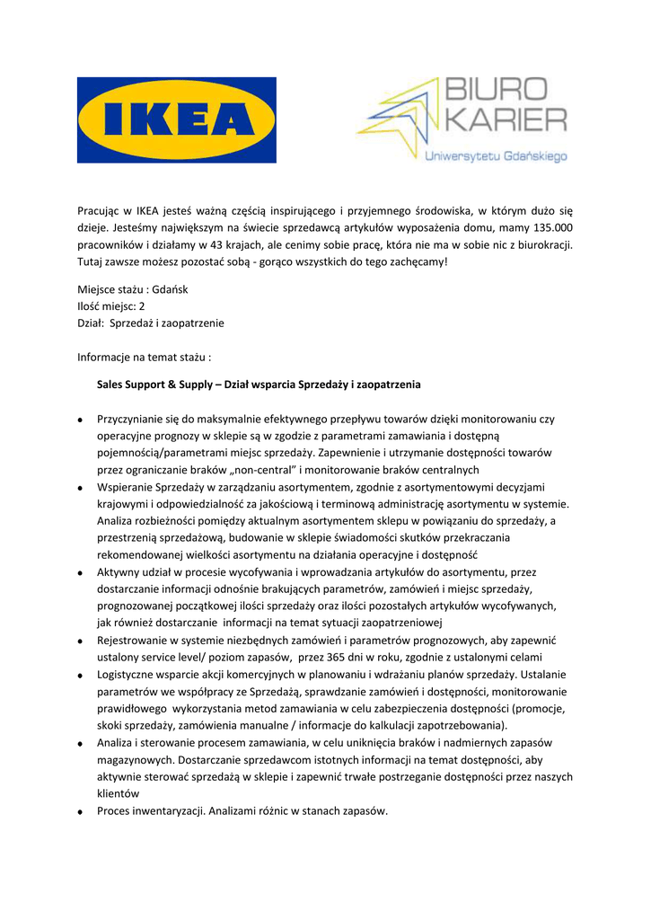 Pracując w IKEA jesteś ważną częścią inspirującego i przyjemnego środowiska, w którym dużo się dzieje. Jesteśmy największym na świecie sprzedawcą artykułów wyposażenia domu, mamy 135.000 pracowników i działamy w 43 krajach, ale cenimy sobie pracę, która nie ma w sobie nic z biurokracji. Tutaj zawsze możesz pozostać sobą - gorąco wszystkich do tego zachęcamy! Miejsce stażu : Gdańsk Ilość miejsc: 2 Dział: Sprzedaż i zaopatrzenie Informacje na temat stażu : Sales Support & Supply – Dział wsparcia Sprzedaży i zaopatrzenia Przyczynianie się do maksymalnie efektywnego przepływu towarów dzięki monitorowaniu czy operacyjne prognozy w sklepie są w zgodzie z parametrami zamawiania i dostępną pojemnością/parametrami miejsc sprzedaży. Zapewnienie i utrzymanie dostępności towarów przez ograniczanie braków „non-central” i monitorowanie braków centralnych Wspieranie Sprzedaży w zarządzaniu asortymentem, zgodnie z asortymentowymi decyzjami krajowymi i odpowiedzialność za jakościową i terminową administrację asortymentu w systemie. Analiza rozbieżności pomiędzy aktualnym asortymentem sklepu w powiązaniu do sprzedaży, a przestrzenią sprzedażową, budowanie w sklepie świadomości skutków przekraczania rekomendowanej wielkości asortymentu na działania operacyjne i dostępność Aktywny udział w procesie wycofywania i wprowadzania artykułów do asortymentu, przez dostarczanie informacji odnośnie brakujących parametrów, zamówień i miejsc sprzedaży, prognozowanej początkowej ilości sprzedaży oraz ilości pozostałych artykułów wycofywanych, jak również dostarczanie informacji na temat sytuacji zaopatrzeniowej Rejestrowanie w systemie niezbędnych zamówień i parametrów prognozowych, aby zapewnić ustalony service level/ poziom zapasów, przez 365 dni w roku, zgodnie z ustalonymi celami Logistyczne wsparcie akcji komercyjnych w planowaniu i wdrażaniu planów sprzedaży. Ustalanie parametrów we współpracy ze Sprzedażą, sprawdzanie zamówień i dostępności, monitorowanie prawidłowego wykorzystania metod zamawiania w celu zabezpieczenia dostępności (promocje, skoki sprzedaży, zamówienia manualne / informacje do kalkulacji zapotrzebowania). Analiza i sterowanie procesem zamawiania, w celu uniknięcia braków i nadmiernych zapasów magazynowych. Dostarczanie sprzedawcom istotnych informacji na temat dostępności, aby aktywnie sterować sprzedażą w sklepie i zapewnić trwałe postrzeganie dostępności przez naszych klientów Proces inwentaryzacji. Analizami różnic w stanach zapasów. Monitorowanie procesu automatycznego zamawiania i inicjowanie działań w przypadku zakłóceń w przepływie zamówień, zagrażających dostępności towaru dla klienta Odpowiedzialność za budowanie zapasów pod zmiany sposobów uzupełniania towarów, akcje specjalne oraz okresy wzmożonej sprzedaży Kontrola podstawowych procedur logistycznych, włączając w to ruchy na stanie magazynowym i transakcje Przygotowywanie niezbędnych podsumowań dla Commercial Teamu i zespołu zarządzającego odnośnie procesów operacyjnych w sklepie, włączając w to wycofywanie i wprowadzanie artykułów, nadmierne zapasy magazynowe, akcje specjalne i braki „non-central” Studenci zainteresowani wzięciem udziału w programie składają następujące dokumenty aplikacyjne: a) deklarację uczestnictwa w programie (załącznik 1, dostępny na bk.ug.edu.pl) b) CV i list motywacyjny, c) zaświadczenie o średniej ocen z całego toku studiów wystawione przez dziekanat. Aplikacje z dopiskiem: STAŻ_IKEA_SPRZEDAŻ wysyłamy na adres mailowy [email protected] lub składamy osobiście w Biurze Karier : Biuro Karier UG Sopot, Armii Krajowej 110/203 Na aplikacje czekamy do 30 września 2014 Do aplikacji uprzejmie prosimy dołączyć następującą klauzulę: „Wyrażam zgodę na przetwarzanie moich danych osobowych zawartych w mojej ofercie pracy dla potrzeb niezbędnych do realizacji procesu rekrutacji zgodnie z ustawą z dnia 29 sierpnia 1997 r. o ochronie danych osobowych (Dz. U. z 2002 r. Nr 101, poz. 926, ze zm.)”