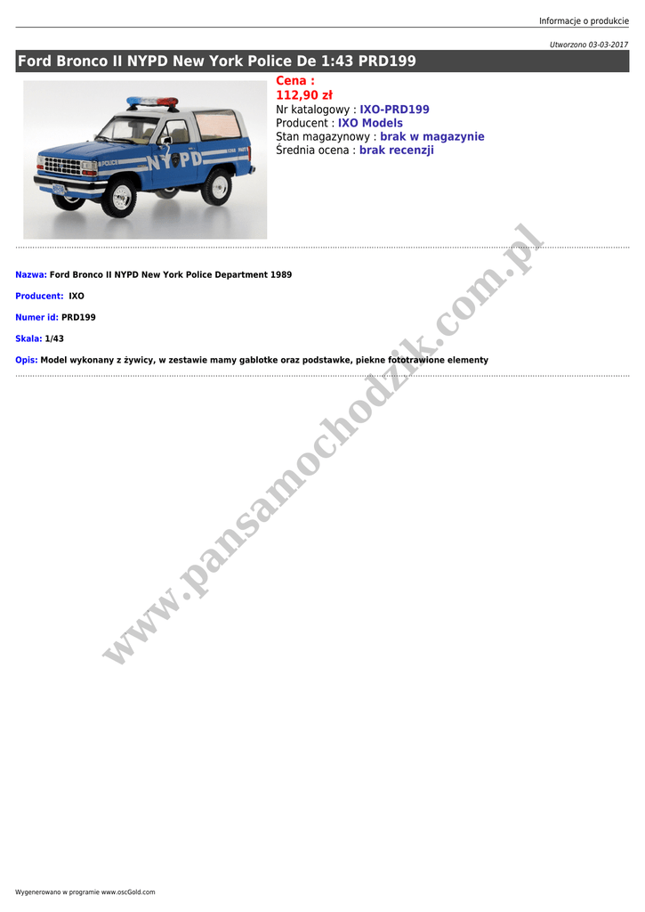 Informacje o produkcie Utworzono 03-03-2017 Ford Bronco II NYPD New York Police De 1:43 PRD199 Cena : 112,90 zł .p l Nr katalogowy : IXO-PRD199 Producent : IXO Models Stan magazynowy : brak w magazynie Średnia ocena : brak recenzji om Nazwa: Ford Bronco II NYPD New York Police Department 1989 Producent: IXO .c Numer id: PRD199 dz ik Skala: 1/43 w w w .p an sa m oc ho Opis: Model wykonany z żywicy, w zestawie mamy gablotke oraz podstawke, piekne fototrawione elementy Wygenerowano w programie www.oscGold.com