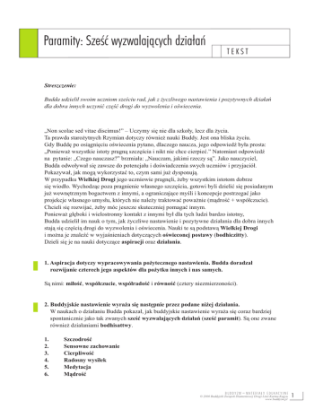˛ działan´ Paramity: Szesć ´ wyzwalajacych TEKST Streszczenie: Budda udzielił swoim uczniom sześciu rad, jak z życzliwego nastawienia i pozytywnych działań dla dobra innych uczynić część drogi do wyzwolenia i oświecenia. „Non scolae sed vitae discimus!” – Uczymy się nie dla szkoły, lecz dla życia. Ta prawda starożytnych Rzymian dotyczy również nauki Buddy. Jest ona bliska życiu. Gdy Buddę po osiągnięciu oświecenia pytano, dlaczego naucza, jego odpowiedź była prosta: „Ponieważ wszystkie istoty pragną szczęścia i nikt nie chce cierpieć.” Natomiast odpowiedź na pytanie: „Czego nauczasz?” brzmiała: „Nauczam, jakimi rzeczy są”. Jako nauczyciel, Budda odwoływał się zawsze do potencjału i doświadczenia swych uczniów i przyjaciół. Pokazywał, jak mogą wykorzystać to, czym sami już dysponują. W przypadku Wielkiej Drogi jego uczniowie pragnęli, żeby wszystkim istotom dobrze się wiodło. Wychodząc poza pragnienie własnego szczęścia, gotowi byli dzielić się posiadanym już wewnętrznym bogactwem z innymi, a ograniczające myśli i koncepcje postrzegać jako projekcje własnego umysłu, których nie należy traktować poważnie (mądrość + współczucie). Chcieli się rozwijać, żeby móc jeszcze skuteczniej pomagać innym. Ponieważ głęboki i wielostronny kontakt z innymi był dla tych ludzi bardzo istotny, Budda udzielił im nauk o tym, jak życzliwe nastawienie i pozytywne działania dla dobra innych stają się częścią drogi do wyzwolenia i oświecenia. Nauki te są podstawą Wielkiej Drogi i można je znaleźć w wyjaśnieniach dotyczących oświeconej postawy (bodhiczitty). Dzieli się je na nauki dotyczące aspiracji oraz działania. 1. Aspiracja dotyczy wypracowywania pożytecznego nastawienia. Budda doradzał rozwijanie czterech jego aspektów dla pożytku innych i nas samych. Są nimi: miłość, współczucie, współradość i równość (cztery niezmierzoności). 2. Buddyjskie nastawienie wyraża się następnie przez podane niżej działania. W naukach o działaniu Budda pokazał, jak buddyjskie nastawienie wyraża się coraz bardziej spontanicznie jako tak zwanych sześć wyzwalających działań (sześć paramit). Są one zwane również działaniami bodhisattwy. 1. 2. 3. 4. 5. 6. Szczodrość Sensowne zachowanie Cierpliwość Radosny wysiłek Medytacja Mądrość Pierwsze cztery z tych sześciu działań są wyrazem pozytywnych związków międzyludzkich. Dzięki medytacji i gromadzeniu mądrości przybywa nam umiejętności w relacjach z innymi, co w rezultacie prowadzi do wyzwolenia. Bycie „dobrym człowiekiem” dla pożytku innych jest w buddyzmie czymś więcej niż celem samym w sobie. Jest to podstawa, która tworzy warunki dla rozpoznania natury umysłu. Szczodrość oznacza dzielenie się rzeczami materialnymi, własną siłą, dobrymi uczuciami i wiedzą. Jest jak zaproszenie do tańca; tworzy zaufanie i otwartość, sprawia, że każde spotkanie jest bogatsze, a jednocześnie rozpuszcza w umyśle uczucie zaborczego przywiązania. Brak szczodrości właściwie uniemożliwia pozytywny kontakt między ludźmi. Sensowne zachowanie ułatwia wymianę międzyludzką, jest podstawą rozwoju i pomaga wypełnić umysł pozytywnymi wrażeniami . Jego podstawą jest porzucenie negatywnych działań, powstrzymanie się od szkodliwych i raniących słów oraz unikanie takich postaw, z których mogą wyniknąć problemy dla nas samych i dla innych. Budda doradzał więc uczniom, żeby kierując się zdrowym rozsądkiem kultywowali pozytywne działania, mowę i myślenie, dzieki czemu będą mogli najskuteczniej pomagać innym. Cierpliwość stanowi zabezpieczenie dla całego pozytywnego potencjału, który – pomimo wszelkich przeciwności – udało się nam nagromadzić. Człowiek pełen współczucia, zachowujący w każdej sytuacji rozluźniony umysł, nie da się w żaden sposób wyprowadzić z równowagi. Jego cierpliwość będzie znacznie silniejsza od gniewu, który nie popchnie go już więcej do głupich działań. Radosny wysiłek oznacza, że nie chcemy marnować czasu i zawsze dajemy z siebie wszystko. Dzięki takiej postawie rozwijamy wszelkie pozytywne właściwości. Brak radosnego wysiłku grozi natomiast stagnacją i brakiem rozwoju, a w rezultacie nie możemy wówczas przynieść pożytku ani innym, ani sobie. Medytacja prowadzi do zyskania trwałego poczucia przestrzeni i wolności w umyśle. Na poziomie wewnętrznym, dzięki dobrej koncentracji potrafimy dokładnie dostrzegać zachodzące w naszej świadomości procesy, a w rezultacie nie ulegamy już tak łatwo negatywnym emocjom i błędnym koncepcjom. Świat oglądany z perspektywy takiego rozluźnionego umysłu staje się fascynującą grą możliwości, wśród których możemy świadomie wybierać. Kiedy uzyskujemy dystans do własnych lęków i oczekiwań, przywiązania i awersji, spontanicznie pojawia się zrozumienie wielostronnego uwarunkowania wszystkich zjawisk, co stopniowo pozwala doświadczać rzeczy takimi, jakimi są, a nie takimi, jakimi się tylko wydają. Odtąd bierzemy już udział tylko w komediach życia, a nie w jego tragediach. Mądrość nie oznacza tu intelektualnej wiedzy, lecz intuicyjne, bezwysiłkowe i natychmiastowe rozpoznanie natury zjawisk, dzieki czemu możliwa jest spontaniczna i absolutnie trafna reakcja na każdą życiową sytuację. Znika poczucie oddzielenia – działający, przedmiot działania i samo działanie stają się jednością, częściami tej samej całości. Ogólnie rzecz biorąc, droga do oświecenia – czyli rozpoznania natury umysłu – prowadzi poprzez tak zwane dwa nagromadzenia. Chodzi tu o gromadzenie pozytywnych wrażeń oraz mądrości. Pierwsze cztery wyzwalające działania wypełniają umysł niezliczoną ilością pozytywnych wrażeń, bez których nie może się on otworzyć na doświadczenie wglądu w swą własną naturę. Medytacja nie tylko utrwala osiągn