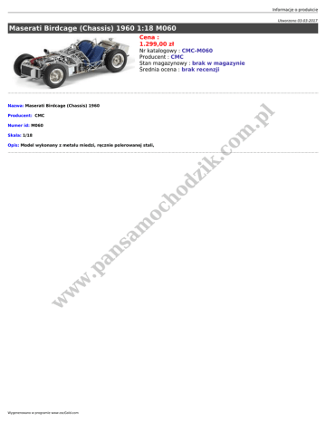 Informacje o produkcie Utworzono 03-03-2017 Maserati Birdcage (Chassis) 1960 1:18 M060 Cena : 1.299,00 zł Nr katalogowy : CMC-M060 Producent : CMC Stan magazynowy : brak w magazynie Średnia ocena : brak recenzji l Nazwa: Maserati Birdcage (Chassis) 1960 .p Producent: CMC om Numer id: M060 Skala: 1/18 w w w .p an sa m oc ho dz ik .c Opis: Model wykonany z metalu miedzi, ręcznie polerowanej stali, Wygenerowano w programie www.oscGold.com