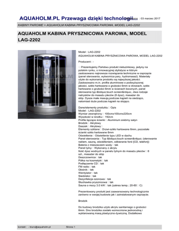 Utworzono : 03 marzec 2017 AQUAHOLM.PL Przewaga dzięki technologii... KABINY PAROWE > AQUAHOLM KABINA PRYSZNICOWA PAROWA, MODEL LAG-2202 AQUAHOLM KABINA PRYSZNICOWA PAROWA, MODEL LAG-2202 Model : LAG-2202 AQUAHOLM KABINA PRYSZNICOWA PAROWA, MODEL LAG-2202 Producent : �Prezentujemy Państwu produkt nietuzinkowy, jedyny na polskim rynku, o innowacyjnej stylistyce w którym zastosowano najnowsze rozwiązania techniczne w osprzęcie (panel sterowania, wytwornica pary, hydromasaż). Materiały użyte do wykonania produktu są najwyższej jakości. Zastosowano m.in. profile aluminiowe o podwyższonej jakości, szkło hartowane o grubości 6mm w drzwiach, szkło hartowane o grubości 6mm w ścianach bocznych, panel sterowania typ „touch screen”, dwa rodzaje natrysków do masażu pleców (8 dysz), masażer do stóp. Dysze małe masują podczas kąpieli na siedząco, natomiast duże podczas kąpieli na stojąco. Dane/elementy produktuOpis ModelLAG-2202 Wymiar zewnętrzny100cmx100cmx220cm Wysokość w środku192cm Profile łączące ściankiAluminium srebrny satyn BrodzikAkrylowy DaszekAkrylowy� Elementy szklaneDrzwi-szkło hartowane 6mm, pozostałe ścianki szkło hartowane 6mm OświetlenieOświetlenie typu LED w dachu Panel sterowaniaTyp „touch screen” (sterowanie radiem, sauną, oświetleniem, odbieranie fonii [CD, telefon]) Bateria z mieszaczem wodytak Panel tylnyWykonany z akrylu Ilość dysz wodnych w panelu tylnym do masażu pleców8 szt., masażer do stóp Deszczownicatak Półka na kosmetykitak Podłączenie CDtak FM radiotak Głośniktak Wentylatortak Siedziskotak Dezynfekcja ozonowatak Słuchawka prysznicowatak Sauna o mocy 3.0 kWtak (zakres temp.: 20-60�C) Prezentowany produkt jest zaawansowany technologicznie zarówno w swojej budowie jak i zainstalowanym osprzęcie. Brodzik Do budowy brodzika użyto akrylu sanitarnego o grubości 8mm. Dno brodzika zostało wzmocnione jednorodną i wyklarowaną masą plastyczno-żywiczną. Dodatkowo kontakt : - [email protected] Strona 1 Utworzono : 03 marzec 2017 AQUAHOLM.PL Przewaga dzięki technologii... KABINY PAROWE > AQUAHOLM KABINA PRYSZNICOWA PAROWA, MODEL LAG-2202 AQUAHOLM KABINA PRYSZNICOWA PAROWA, MODEL LAG-2202 osadzony jest na stalowym stelażu. Brodzik posiada regulowane nóżki [0-20mm]. Ściany Do konstrukcji kabiny zastosowano aluminium oraz stal nierdzewną. Drzwi wejściowe wykonane z hartowanego szkła o grubości [6mm]. Szyby boczne i tylne wykonano również ze szkła hartowanego o grubości [6mm]. Panel tylny Wykonany z akrylu. Zainstalowano oświetlenie LED-owe 10 szt diod. Zamontowano 12 szt dysz do masażu pleców. Osprzęt Zastosowano tzw. dotykowy panel sterowania służący do obsługi poszczególnych funkcji kabiny [oświetlenie, radio, sauna, wentylator, telefon, CD]. Panel odporny jest na działanie bezpośrednie wody jak i temperatury do +80C. Zainstalowano generator pary o mocy 3000W. pozwala on na uzyskanie temp. wew. kabiny do +60C [warunkiem jest szczelność kabiny]. Zastosowano baterię z mieszaczem wody połączoną z przełącznikiem funkcyjnym. Do ustawienia kosmetyków kąpielowych zainstalowano podwójną półkę. Cena : Ceny dostępne po zalogowaniu Dostępność: Produkt dostępny w naszym sklepie od 27 luty 2015 kontakt : - [email protected] Strona 2