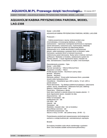 Utworzono : 03 marzec 2017 AQUAHOLM.PL Przewaga dzięki technologii... KABINY PAROWE > AQUAHOLM KABINA PRYSZNICOWA PAROWA, MODEL LAG-2308 AQUAHOLM KABINA PRYSZNICOWA PAROWA, MODEL LAG-2308 Model : LAG-2308 AQUAHOLM KABINA PRYSZNICOWA PAROWA, MODEL LAG-2308 Producent : �Kabina prysznicowa z sauną, hydromasażem oraz chromoterapią o innowacyjnej stylistyce, w której zastosowano�najnowsze rozwiązania techniczne w osprzęcie (panel sterowania, wytwornica pary, hydromasaż). Materiały użyte do wykonania produktu są najwyższej jakości. Zastosowano m.in. profile aluminiowe o podwyższonej jakości, szkło hartowane o grubości 6mm w drzwiach, szkło hartowane o grubości 6mm w ścianach bocznych, elektroniczny panel sterowania. Szyby tylne w kolorze ciemnym grafitowym. Siedzisko w brodziku, zastosowano system do masażu pleców - 3 duże regulowane dysze, masażer do stóp. Zainstalowano 2 dozowniki na mydło i inne kosmetyki. Dane/elementy produktuOpis ModelLAG-2308� Wymiar zewnętrzny100cmx100cmx215cm Wysokość w środku192cm Profile łączące ściankiAluminium czarny satyn BrodzikAkrylowy DaszekAkrylowy� Elementy szklaneDrzwi-szkło hartowane 6mm, pozostałe ścianki szkło hartowane 6mm OświetlenieOświetlenie typu LED w dachu, 12 szt. LED w panelu tylnym Panel sterowaniaTyp „elektroniczny” (sterowanie radiem, sauną, oświetleniem, odbieranie fonii [CD, telefon]) Bateria z mieszaczem wodytak Panel tylnyWykonany z akrylu Ilość dysz wodnych w panelu tylnym do masażu pleców3 duże regulowane dysze, masażer do stóp Deszczownicatak Półka na kosmetykitak Podłączenie CDtak FM radiotak Głośniktak Wentylatortak Siedzisko, masażer stóptak (w brodziku) Dezynfekcja ozonowatak Słuchawka prysznicowatak Sauna o mocy 3.0 kWtak (zakres temp.: 20-60�C) Prezentowany produkt jest zaawansowany technologicznie zarówno w swojej budowie jak i zainstalowanym osprzęcie. Brodzik Do budowy brodzika użyto akrylu sanitarnego o grubości 8mm. Dno brodzika zostało wzmocnione jednorodną i kontakt : - [email protected] Strona 1 Utworzono : 03 marzec 2017 AQUAHOLM.PL Przewaga dzięki technologii... KABINY PAROWE > AQUAHOLM KABINA PRYSZNICOWA PAROWA, MODEL LAG-2308 AQUAHOLM KABINA PRYSZNICOWA PAROWA, MODEL LAG-2308 wyklarowaną masą plastyczno-żywiczną. Dodatkowo osadzony jest na stalowym stelażu. Brodzik posiada regulowane nóżki [0-20mm]. Ściany Do konstrukcji kabiny zastosowano aluminium oraz stal nierdzewną. Drzwi wejściowe wykonane z hartowanego szkła o grubości [6mm]. Szyby boczne i tylne wykonano również ze szkła hartowanego o grubości [6mm]. Panel tylny Wykonany z akrylu. Zainstalowano oświetlenie LED-owe 10 szt diod. Zamontowano 3 duże dysze regulowane do masażu pleców. Osprzęt Zastosowano tzw. dotykowy panel sterowania służący do obsługi poszczególnych funkcji kabiny [oświetlenie, radio, sauna, wentylator, telefon, CD]. Panel odporny jest na działanie bezpośrednie wody jak i temperatury do +80C. Zainstalowano generator pary o mocy 3000W. pozwala on na uzyskanie temp. wew. kabiny do +60C [warunkiem jest szczelność kabiny]. Zastosowano baterię z mieszaczem wody połączoną z przełącznikiem funkcyjnym. Do ustawienia kosmetyków kąpielowych zainstalowano podwójną półkę. Cena : Ceny dostępne po zalogowaniu Dostępność: Produkt dostępny w naszym sklepie od 27 luty 2015 kontakt : - [email protected] Strona 2