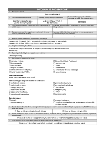 INFORMACJE PODSTAWOWE 1. Nazwa zbioru danych Darczyńcy Fundacji 2. Oznaczenie administratora danych Gdańska Fundacja Korczaka „Kochaj i Dawaj Przykład” 3. Adres jego siedziby lub miejsca zamieszkania Numer identyfikacyjny rejestru podmiotów gospodarki narodowej, jeżeli został mu nadany ul. Żwirki i Wigury 14f lok. 6 80-463 Gdańsk Oznaczenie przedstawiciela administratora danych, o którym mowa w art. 31a ustawy 361302276 Adres jego siedziby lub miejsca zamieszkania – w przypadku wyznaczenia takiego podmiotu – 4. Oznaczenie podmiotu, któremu powierzono przetwarzanie danych ze zbioru na podstawie art. 31 ustawy – Adres jego siedziby lub miejsca zamieszkania – w przypadku powierzenia przetwarzania danych temu podmiotowi – 5. – Podstawa prawna upoważniająca do prowadzenia zbioru danych Ustawę z dnia 24 kwietnia 2003 r. o działalności pożytku publicznego i o wolontariacie; Ustawa z dnia 14 lipca 1983 r. o narodowym zasobie archiwalnym i archiwach. 6. Cel przetwarzania danych w zbiorze Przetwarzanie danych darczyńców, w związku z przekazywanymi przez nich darowiznami; Archiwizacja. 7. Opis kategorii osób, których dane są przetwarzane w zbiorze Darczyńcy Fundacji. 8. Zakres danych przetwarzanych w zbiorze ☒ nazwiska i imiona, ☐ imiona rodziców, ☐ data urodzenia, ☐ miejsce urodzenia, ☒ adres zamieszkania lub pobytu, ☐ numer ewidencyjny PESEL, ☐ Numer Identyfikacji Podatkowej, ☐ miejsce pracy, ☐ zawód, ☐ wykształcenie, ☐ seria i numer dowodu osobistego, ☒ numer telefonu Inne dane osobowe: Numer konta bankowego, adres e-mail. Dane ujawniające bezpośrednio lub w kontekście: ☐ pochodzenie rasowe, ☐ pochodzenie etniczne, ☐ poglądy polityczne, ☐ przekonania religijne, ☐ przekonania filozoficzne, ☐ przynależność wyznaniową Dane dotyczące: ☐ skazań, ☐ mandatów karnych 9. ☐ przynależność partyjną, ☐ przynależność związkową, ☐ stan zdrowia, ☐ kod genetyczny, ☐ nałogi, ☐ życie seksualne ☐ orzeczeń o ukaraniu, ☐ innych orzeczeń wydanych w postępowaniu sądowym lub administracyjnym Sposób zbierania danych do zbioru, w szczególności informacja, czy dane do zbioru są zbierane od osób, których dotyczą, czy z innych źródeł niż osoba, której dane dotyczą ☒ Dane są zbierane od osób, których dotyczą 10. ☒ Dane są zbierane z innych źródeł Sposób udostępniania danych ze zbioru, w szczególności informacja, czy dane ze zbioru są udostępniane innym podmiotom niż upoważnione na podstawie przepisów prawa Dane ze zbioru nie są udostępniane innym podmiotom niż upoważnione na podstawie przepisów prawa. 11. Oznaczenie odbiorcy danych lub kategorii odbiorców, którym dane mogą być przekazywane Dane mogą być przekazywane jedynie podmiotom upoważnionym na podstawie przepisów prawa. 12. Informacja dotycząca ewentualnego przekazywania danych do państwa trzeciego Dane nie mogą być przekazywane do państwa trzeciego. INFORMACJE UZUPEŁNIAJĄCE Data wpisu zbioru do rejestru Data ostatniej aktualizacji informacji dotyczących zbioru 16-03-2016 r. – ☐ Data wykreślenia zbioru HISTORIA ZMIAN ☐ Nowy wpis Informacja o rodzaju zmiany Data dokonania zmiany ☐ Aktualizacja Zakres zmiany – – ☐ Wykreślenie