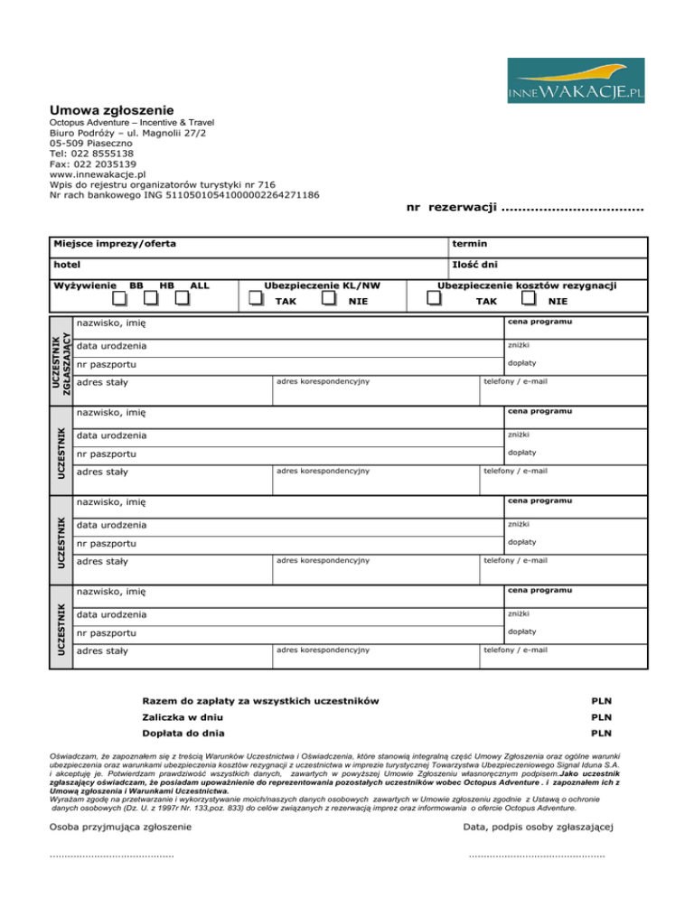 Umowa zgłoszenie Octopus Adventure – Incentive & Travel Biuro PodróŜy – ul. Magnolii 27/2 05-509 Piaseczno Tel: 022 8555138 Fax: 022 2035139 www.innewakacje.pl Wpis do rejestru organizatorów turystyki nr 716 Nr rach bankowego ING 51105010541000002264271186 nr rezerwacji .................................. Miejsce imprezy/oferta termin hotel Ilość dni WyŜywienie BB HB AL L Ubezpieczenie KL/NW UCZESTNIK UCZESTNIK UCZESTNIK UCZESTNIK ZGŁASZAJĄCY T AK NIE Ubezpieczenie kosztów rezygnacji TAK NIE nazwisko, imię cena programu data urodzenia zniŜki nr paszportu dopłaty adres korespondencyjny adres stały telefony / e-mail nazwisko, imię cena programu data urodzenia zniŜki nr paszportu dopłaty adres korespondencyjny adres stały telefony / e-mail nazwisko, imię cena programu data urodzenia zniŜki nr paszportu dopłaty adres korespondencyjny adres stały telefony / e-mail nazwisko, imię cena programu data urodzenia zniŜki nr paszportu dopłaty adres korespondencyjny adres stały telefony / e-mail Razem do zapłaty za wszystkich uczestników PLN Zaliczka w dniu PLN Dopłata do dnia PLN Oświadczam, Ŝe zapoznałem się z treścią Warunków Uczestnictwa i Oświadczenia, które stanowią integralną część Umowy Zgłoszenia oraz ogólne warunki ubezpieczenia oraz warunkami ubezpieczenia kosztów rezygnacji z uczestnictwa w imprezie turystycznej Towarzystwa Ubezpieczeniowego Signal Iduna S.A. i akceptuję je. Potwierdzam prawdziwość wszystkich danych, zawartych w powyŜszej Umowie Zgłoszeniu własnoręcznym podpisem.Jako uczestnik zgłaszający oświadczam, Ŝe posiadam upowaŜnienie do reprezentowania pozostałych uczestników wobec Octopus Adventure . i zapoznałem ich z Umową zgłoszenia i Warunkami Uczestnictwa. WyraŜam zgodę na przetwarzanie i wykorzystywanie moich/naszych danych osobowych zawartych w Umowie zgłoszeniu zgodnie z Ustawą o ochronie danych osobowych (Dz. U. z 1997r Nr. 133,poz. 833) do celów związanych z rezerwacją imprez oraz informowania o ofercie Octopus Adventure. Osoba przyjmująca zgłoszenie .......................................... Data, podpis osoby zgłaszającej ..............................................