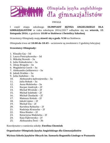 UWAGA I część etapu szkolnego OLIMPIADY JĘZYKA ANGIELSKIEGO DLA GIMNAZJALISTÓW w roku szkolnym 2016/2017 odbędzie się we wtorek, 15 listopada 2016, o godzinie 10.00 w Stołówce i Świetlicy Szkolnej. Uczestnicy Olimpiady mają stawić się o godz. 9.50 na Stołówce. Olimpiada trwa od 10.00 do 10.45 – uczniowie są zwolnieni z 3 godziny lekcyjnej Uczestnicy Olimpiady: 1. Klaudia Gaj – 3d 2. Laura Pietrzykowska – 3d 3. Mikołaj Nowak – 3a 4. Julia Dokudowiec – 3a 5. Alicja Bryguła – 3a 6. Magdalena Czech – 3a 7. Aleksandra Jeśkiewicz – 3a 8. Jakub Drabko – 3a 9. Julia Zadubiec – 3a 10. Aleksandra Jędrzejewska – 3a 11. Julia Robak – 3a 12. Anna Makówka – 3a 13. Kacper Andrzyk – 2f 14. Michał Wroński – 2f 15. Michał Izdebski – 2f 16. Michał Chodacki – 2f 17. Mateusz Kotiuk – 2f 18. Jakub Lipiec – 2f 19. Michał Uss – 2f 20. Karolina Rykucka – 2f 21. Nadzieja Krasucka – 2f 22. Nina Binder – 2f 23. Katarzyna Makówka – 2f 24. Kaja Dąbrowska – 2f 25. Aleksandra Świć – 3b Koordynator z ramienia szkoły: Ewelina Chomiuk Organizator Olimpiady Języka Angielskiego dla Gimnazjalistów Wyższa Szkoła Języków Obcych im. Samuela Bogumiła Lindego w Poznaniu