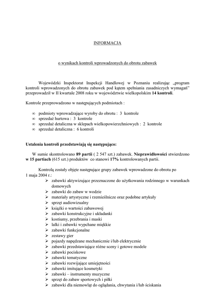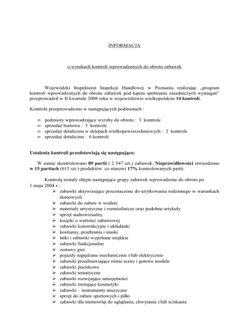 INFORMACJA o wynikach kontroli wprowadzonych do obrotu zabawek Wojewódzki Inspektorat Inspekcji Handlowej w Poznaniu realizując „program kontroli wprowadzonych do obrotu zabawek pod kątem spełniania zasadniczych wymagań” przeprowadził w II kwartale 2008 roku w województwie wielkopolskim 14 kontroli. Kontrole przeprowadzono w następujących podmiotach : • • • • podmioty wprowadzające wyroby do obrotu : 3 kontrole sprzedaŜ hurtowa : 3 kontrole sprzedaŜ detaliczna w sklepach wielkopowierzchniowych : 2 kontrole sprzedaŜ detaliczna : 6 kontroli Ustalenia kontroli przedstawiają się następująco: W sumie skontrolowano 89 partii ( 2 547 szt.) zabawek. Nieprawidłowości stwierdzono w 15 partiach (615 szt.) produktów co stanowi 17% kontrolowanych partii. Kontrolą zostały objęte następujące grupy zabawek wprowadzone do obrotu po 1 maja 2004 r.: zabawki aktywizujące przeznaczone do uŜytkowania rodzinnego w warunkach domowych zabawki do zabaw w wodzie materiały artystyczne i rzemieślnicze oraz podobne artykuły sprzęt audiowizualny ksiąŜki o wartości zabawowej zabawki konstrukcyjne i układanki kostiumy, przebrania i maski lalki i zabawki wypchane miękkie zabawki funkcjonalne zestawy gier pojazdy napędzane mechanicznie i/lub elektrycznie zabawki przedstawiające róŜne sceny i gotowe modele zabawki pociskowe zabawki tematyczne zabawki rozwijające umiejętności zabawki imitujące kosmetyki zabawki – instrumenty muzyczne sprzęt do zabaw sportowych i piłki zabawki dla niemowląt do oglądania, chwytania i/lub ściskania zabawki przeznaczone do utrzymywania masy ciała dziecka zabawki, do których dziecko moŜe wejść Podczas prowadzonych czynności dokonano oględzin zabawek w oparciu o następujące akty prawne: rozporządzenie Ministra Gospodarki, Pracy i Polityki Społecznej z dnia 14 listopada 2003r. w sprawie zasadniczych wymagań dla zabawek (Dz. U. Nr 210, poz. 2045), rozporządzenie Ministra Gospodarki i Pracy z dnia 5 lipca 2004r. w sprawie ograniczeń, zakazów lub warunków produkcji, obrotu lub stosowania substancji niebezpiecznych oraz zawierających je produktów (Dz. U. Nr 168, poz. 1762, z późn. zm.) Sprawdzenie prawidłowości oznakowania znakiem CE zgodnie z § 32 ust.1 ww. rozporządzenia. Wszystkie wyroby posiadały oznakowanie CE umieszczone na zabawce, opakowaniu lub etykiecie dołączonej do zabawki. Oznakowanie CE było widoczne, czytelne i trwałe. Sprawdzenie „informacji” dotyczącej wprowadzającego zabawkę do obrotu. Wszystkie wyroby posiadały informacje zawierające nazwę i adres producenta jego upowaŜnionego przedstawiciela albo importera na terytorium Wspólnoty Europejskiej co jest zgodne § 32 ust.1, 2. Sprawdzenie zgodności z wymaganiami określonymi w § 32 ust. 3 i 4 (w przypadku zabawek małych i składających się z małych części). Nieprawidłowości dotyczyły 1 partii wyrobów o wartości 181,86 zł : - zabawka telefon komórkowy z torebką brak informacji o celowości zachowania opakowania. Nieprawidłowość została uzupełniona w trakcie trwania kontroli. Do ww. importera skierowano wystąpienie pokontrolne informujące o stwierdzonych nieprawidłowościach i moŜliwości podjęcie działań prowadzących do usunięcia nieprawidłowości we wszystkich wyrobach wprowadzonych do obrotu. Zwrócono się takŜe o przesłanie wykazu odbiorców ww. zabawki. Importer podjął działania naprawcze, dokumentując je poprzez nadesłanie wzoru etykiet uzupełnionych o brakujące informacje. Jednocześnie informację o stwierdzonych nieprawidłowościach i podjętych działaniach naprawczych przesłano do wiadomości wszystkich Inspektoratów. Na opakowaniach pozostałych zabawek o małych gabarytach i składających się z małych części lub na etykietach, ulotkach dołączonych do tych zabawek oprócz waŜnych informacji producent, importer poinformował nabywców zabawek o celowości zachowania opakowania, etykiet czy ulotek, na których zamieszczone są te informacje. 2 Sprawdzenie prawidłowości dołączonych do zabawki informacji określonych w § 33 ust. 1 pkt 1- 5 i ust.2 ww. rozporządzenia. i ostrzeŜeń Nieprawidłowości dotyczyły 10 partii wyrobów o wartości 84 133,53,00 zł w zakresie: braku ostrzeŜenia o treści „nieodpowiednie dla dzieci w wieku poniŜej 3 lat” lub znaku graficznego określonego w normie PN-EN 71-6:1998 co narusza § 33 ust. 1 pkt. 1. - huśtawka Ze względu na inne stwierdzone nieprawidłowości w stosunku do zabawki huśtawka zastosowano środki określone w Ustawie o systemie oceny zgodności z dnia 30.08.2002r. (Dz.U. Nr 166, poz. 1360 z późn. zm.) , celem wszczęcia postępowania administracyjnego. - zabawka gra letnia W związku ze stwierdzonymi nieprawidłowościami podczas badań laboratoryjnych przesłano pismo informujące o prawie złoŜenia wniosku o badanie próbki kontrolnej. nieprawidłowej treści ostrzeŜenia co narusza § 33 ust. 1 pkt. 1 oraz nieprawidłowej wielkości znaku graficznego ostrzegawczego dotyczącego wieku co jest niezgodne z PN-EN 71 – 6:1998, - zabawka koń REWIR zabawka koń ZEFIR zabawka koń ZEFIR zabawka koń GWIDON zabawka koń WARDO Producent oznaczył ww. wyroby ostrzeŜeniem o treści „Uwaga: wyłącznie dla dzieci w wieku ponad 3 lat” i znakiem graficznym ostrzegawczym dotyczącym wieku o średnicy 8 mm zamiast wg. obowiązujących przepisów ostrzeŜeniem o treści: „Nieodpowiednie dla dzieci w wieku poniŜej 3 lat” i znakiem graficznym nie mniejszym niŜ 10 mm. Producent zobowiązał się podjąć działania naprawcze w celu wyeliminowania stwierdzonych nieprawidłowości. braku ostrzeŜenia „Uwaga. Konieczność stosowania sprzętu ochronnego” co narusza § 33 ust.1 pkt. 3. - zabawka wrotki Do importera skierowano wystąpienie pokontrolne, w wyniku którego importer podjął stosowne działania naprawcze u wszystkich odbiorców ww. zabawek tj. oznaczył zabawki w sposób zgodny z obowiązującymi przep