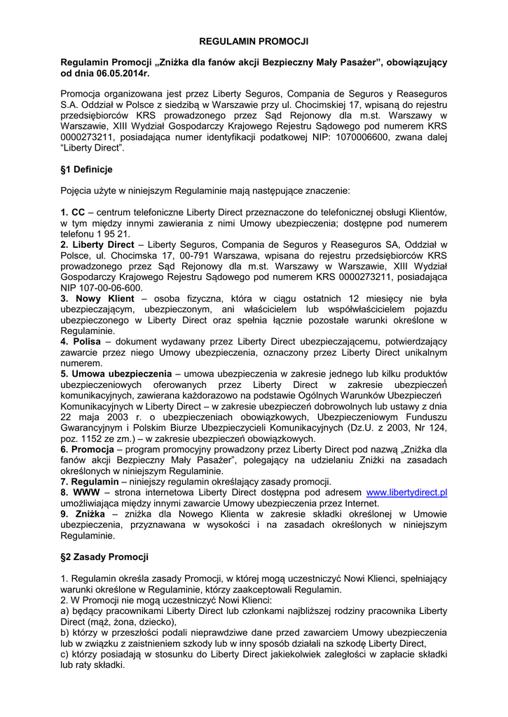 REGULAMIN PROMOCJI Regulamin Promocji „Zniżka dla fanów akcji Bezpieczny Mały Pasażer”, obowiązujący od dnia 06.05.2014r. Promocja organizowana jest przez Liberty Seguros, Compania de Seguros y Reaseguros S.A. Oddział w Polsce z siedzibą w Warszawie przy ul. Chocimskiej 17, wpisaną do rejestru przedsiębiorców KRS prowadzonego przez Sąd Rejonowy dla m.st. Warszawy w Warszawie, XIII Wydział Gospodarczy Krajowego Rejestru Sądowego pod numerem KRS 0000273211, posiadająca numer identyfikacji podatkowej NIP: 1070006600, zwana dalej “Liberty Direct”. §1 Definicje Pojęcia użyte w niniejszym Regulaminie mają następujące znaczenie: 1. CC – centrum telefoniczne Liberty Direct przeznaczone do telefonicznej obsługi Klientów, w tym między innymi zawierania z nimi Umowy ubezpieczenia; dostępne pod numerem telefonu 1 95 21. 2. Liberty Direct – Liberty Seguros, Compania de Seguros y Reaseguros SA, Oddział w Polsce, ul. Chocimska 17, 00-791 Warszawa, wpisana do rejestru przedsiębiorców KRS prowadzonego przez Sąd Rejonowy dla m.st. Warszawy w Warszawie, XIII Wydział Gospodarczy Krajowego Rejestru Sądowego pod numerem KRS 0000273211, posiadająca NIP 107-00-06-600. 3. Nowy Klient – osoba fizyczna, która w ciągu ostatnich 12 miesięcy nie była ubezpieczającym, ubezpieczonym, ani właścicielem lub współwłaścicielem pojazdu ubezpieczonego w Liberty Direct oraz spełnia łącznie pozostałe warunki określone w Regulaminie. 4. Polisa – dokument wydawany przez Liberty Direct ubezpieczającemu, potwierdzający zawarcie przez niego Umowy ubezpieczenia, oznaczony przez Liberty Direct unikalnym numerem. 5. Umowa ubezpieczenia – umowa ubezpieczenia w zakresie jednego lub kilku produktów ubezpieczeniowych oferowanych przez Liberty Direct w zakresie ubezpiecze komunikacyjnych, zawierana każdorazowo na podstawie Ogólnych Warunków Ubezpiecze Komunikacyjnych w Liberty Direct – w zakresie ubezpiecze dobrowolnych lub ustawy z dnia 22 maja 2003 r. o ubezpieczeniach obowiązkowych, Ubezpieczeniowym Funduszu Gwarancyjnym i Polskim Biurze Ubezpieczycieli Komunikacyjnych (Dz.U. z 2003, Nr 124, poz. 1152 ze zm.) – w zakresie ubezpiecze obowiązkowych. 6. Promocja – program promocyjny prowadzony przez Liberty Direct pod nazwą „Zniżka dla fanów akcji Bezpieczny Mały Pasażer”, polegający na udzielaniu Zniżki na zasadach określonych w niniejszym Regulaminie. 7. Regulamin – niniejszy regulamin określający zasady promocji. 8. WWW – strona internetowa Liberty Direct dostępna pod adresem www.libertydirect.pl umożliwiająca między innymi zawarcie Umowy ubezpieczenia przez Internet. 9. Zniżka – zniżka dla Nowego Klienta w zakresie składki określonej w Umowie ubezpieczenia, przyznawana w wysokości i na zasadach określonych w niniejszym Regulaminie. §2 Zasady Promocji 1. Regulamin określa zasady Promocji, w której mogą uczestniczyć Nowi Klienci, spełniający warunki określone w Regulaminie, którzy zaakceptowali Regulamin. 2. W Promocji nie mogą uczestniczyć Nowi Klienci: a) będący pracownikami Liberty Direct lub członkami najbliższej rodziny pracownika Liberty Direct (mąż, żona, dziecko), b) którzy w przeszłości podali nieprawdziwe dane przed zawarciem Umowy ubezpieczenia lub w związku z zaistnieniem szkody lub w inny sposób działali na szkodę Liberty Direct, c) którzy posiadają w stosunku do Liberty Direct jakiekolwiek zaległości w zapłacie składki lub raty składki. 3. Nowym Klientem w rozumieniu niniejszego Regulaminu może zostać wyłącznie osoba, która spełnia łącznie wszystkie warunki określone w Regulaminie, podała podczas zawierania Umowy ubezpieczenia kod promocyjny „BMP” lub „BMP2” i jest fanem fanpage’a Bezpieczny Mały Pasażer w serwisie Facebook. 4. Prawo do Zniżki nie podlega przeniesieniu na osoby trzecie. §3 Szczegółowe zasady przyznawania Zniżki 1. Nowy Klient nabywa prawo do Zniżki jeśli przed zawarciem Umowy ubezpieczenia z Liberty Direct za pośrednictwem CC podczas rozmowy telefonicznej z konsultantem lub zawierając Umowę ubezpieczenia on-line za pośrednictwem WWW podał kod promocyjny „BMP” lub „BMP2”. 2. Zniżka przyznawana w ramach Promocji nie podlega sumowaniu ze zniżkami z innych programów promocyjnych organizowanych przez Liberty Direct, w tym programów promocyjnych wymagających podania kodu promocji. W przypadku gdy dana osoba spełnia warunki uzyskania Zniżki na podstawie niniejszego Regulaminu i jednocześnie spełnia warunki uzyskania innej zniżki, to otrzyma ona wyłącznie jedną wybraną przez siebie zniżkę. 3. Zniżka wynosi: 10% i jest przyznawana Nowemu Klientowi przez Liberty Direct wyłącznie w sytuacji, gdy zawiera on Umowę ubezpieczenia obejmującą pakiet OC i AC (tj. obowiązkowe ubezpieczenie odpowiedzialności cywilnej posiadaczy pojazdów mechanicznych, ubezpieczenie AC, ubezpieczenie Assistance oraz ewentualnie dodatkowe ryzyka). 4. Jeżeli składka z tytułu Umowy ubezpieczenia jest płatna w ratach również zniżka jest podzielona równo na każdą z rat. 5. Nowy Klient może wykorzystać kod promocyjny, o którym mowa w ust. 1 powyżej tylko jeden raz, tj. może zawrzeć tylko jedną Umowę ubezpieczenia z wykorzystaniem Zniżki. §4 Reklamacje 1. Nowy Klient, który uważa że jego prawa związane z uczestnictwem w Promocji zostały naruszone, ma prawo zgłosić do Liberty Direct reklamację. 2. Reklamację należy zgłaszać pisemnie na adres: Liberty Seguros, Compania de Seguros y Reaseguros SA, Oddział w Polsce, ul. Chocimska 17, 00-791 Warszawa z dopiskiem „Zniżka dla fanów akcji Bezpieczny Mały Pasażer – reklamacja”. 3. Rozpatrywanie reklamacji trwa do 14 dni od dnia doręczenia Liberty Direct pisemnej reklamacji. §5 Postanowienia końcowe 1. Promocja obowiązuje od dnia 06.05.2014r. i trwa do dnia 06.08.2014r. 2. Każdy Nowy Klient może w dowolnym czasie zrezygnować z udziału w Promocji. 3. Liberty