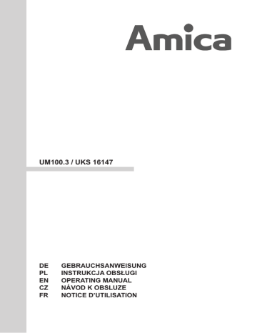 UM100.3 / UKS 16147 DE PL EN CZ FR GEBRAUCHSANWEISUNG INSTRUKCJA OBSŁUGI OPERATING MANUAL NÁVOD K OBSLUZE NOTICE D’UTILISATION SICHERHEITSHINWEISE INBETRIEBNAHME UND BETRIEBSBEDINGUNGEN DES GERÄTES BEDIENUNG UND FUNKTIONEN ENERGIESPARENDE NUTZUNG DES KÜHLSCHRANKS ABTAUEN, REINIGEN UND PFLEGEN LOKALISIERUNG VON STÖRUNGEN UMWELTSCHUTZ KLIMAKLASSE WECHSEL DES TÜRANSCHLAGS Lüftung EINBAU DES GERÄTES MONTAGE DER BLENDE AUF DER GERÄTETÜR 7 7 9 11 12 13 14 15 66 66 66 66 WSKAZÓWKI DOTYCZĄCE BEZPIECZEŃSTWA UŻYTKOWANIA INSTALACJA I WARUNKI PRACY URZĄDZENIA OBSŁUGA I FUNKCJE JAK EKONOMICZNIE UŻYTKOWAĆ LODÓWKĘ ODSZRANIANIE, MYCIE I KONSERWACJA LOKALIZACJA USTEREK OCHRONA ŚRODOWISKA KLASA KLIMATYCZNA GWARANCJA, OBSŁUGA POSPRZEDAŻNA ZMIANA KIERUNKU OTWIERANIA DRZWI WENTYLACJA ZABUDOWA URZĄDZENIA MONTAŻ BLENDY DO DRZWI URZĄDZENIA 16 16 18 20 21 22 23 24 24 67 67 67 67 GUIDELINES CONCERNING THE SAFETY OF USE INSTALLATION AND OPERATING CONDITIONS OF THE APPLIANCE OPERATION AND FUNCTIONS USING THE REFRIGERATOR EFFICIENTLY DEFROSTING, WASHING AND MAINTENANCE TROUBLE-SHOOTING ENVIRONMENTAL PROTECTION CLIMATE RANGE DOOR REVERSAL Ventilation INSTALLATION OF THE APPLIANCE FITTING FURNITURE BOARD TO APPLIANCE DOOR 25 25 27 29 30 31 32 33 68 68 68 68 POKYNY TÝKAJÍCÍ SE BEZPEČNOSTI POUŽÍVÁNÍ INSTALACE A PROVOZNÍ PODMÍNKY SPOTŘEBIČE OBSLUHA A FUNKCE JAK EKONOMICKY POUŽÍVAT CHLADNIČKU ODMRAZOVÁNÍ, MYTÍ A ÚDRŽBA URČOVÁNÍ ZÁVAD OCHRANA ŽIVOTNÍHO PROSTŘEDÍ KLIMATICKÁ TŘÍDA ZMĚNA SMĚRU OTEVÍRÁNÍ DVÍŘEK Větrání VESTAVĚNÍ SPOTŘEBIČE MONTÁŽ CLONY DO DVÍŘEK SPOTŘEBIČE CONSIGNES DE SECURITÉ D’UTILISATION INSTALLATION ET CONDITIONS DE FONCTIONNEMENT DE L’APPAREIL SERVICE D’ENTRETIEN ET FONCTIONS COMMENT EXPLOITER LE REFRIGERATEUR DE FAÇON ECONOMIQUE ? DÉGIVRAGE, LAVAGE ET CONSERVATION LOCALISATION DES PANNES PROTECTION DE L’ENVIRONEMENT Classe climatique INVERSION DE SENS D'OUVERTURE DE PORTE VENTILLATION INSERTION DE L'APPAREIL Installation 34 34 36 38 39 40 41 42 69 69 69 69 43 43 45 47 48 49 50 51 70 70 70 70 DE Geehrte Kunden, das Kühl- und Gefriergerät steht für eine außergewöhnlich leichte Benutzung und ausgezeichnete Effektivität. Jedes Gerät wurde noch in der Fabrik auf Sicherheit und Funktionalität sorgfältig überprüft. Wir weisen Sie darauf hin, die Gebrauchsanweisung vor der Inbetriebnahme genau zu lesen. Achtung! Das Kühl- und Gefriergerät ist ausschließlich im Haushalt zu gebrauchen. Der Hersteller behält sich das Recht vor, bestimmte Änderungen, die den Betrieb des Gerätes nicht beeinflussen, vorzunehmen. Zulässig sind Ausstattungsänderungen sowie Veränderungen im Innen- und Außendesign, die sowohl die Funktionalität des Gerätes als auch seine Sicherheit nicht beeinträchtigen. PL Szanowni Państwo, Chłodziarko-zamrażarka Amica to połączenie wyjątkowej łatwości obsługi i doskonałej efektywności. Każde urządzenie przed opuszczeniem fabryki zostało dokładnie sprawdzone pod względem bezpieczeństwa i funkcjonalności. Prosimy Państwa o uważną lekturę instrukcji obsługi przed uruchomieniem urządzenia. Uwaga! Chłodziarko-zamrażarka przeznaczona jest wyłącznie do użytku domowego. Producent zastrzega sobie możliwość dokonywania zmian nie wpływających na działanie urządzenia. Dopuszczalne są zmiany w wyposażeniu, wystroju wewnętrznym i zewnętrznym wyrobu, nie wpływające na jego funkcjonalność i bezpieczeństwo. EN Dear Customer, This fridge-freezer combines exceptional user-friendliness and excellent efficiency. Prior to dispatch, each unit was carefully checked for its safety and operating capabilities. Before starting the appliance, please read this Operating Manual carefully Note! This fridge-freezer is intended for household use only. The manufacturer reserves the right to introduce modifications, which do not affect the operation of the appliance. CZ Vážení klienti, Chladnička s mrazničkou Amica je spojením výjimečně jednoduché obsluhy a dokonalé účinnosti. Každý spotřebič byl před expedicí z továrny důkladně zkontrolován s ohledem na bezpečnost a funkčnost. Prosíme Vás, abyste si důkladně přečetli návod k obsluze před uvedením spotřebiče do provozu. Upozornění! Chladnička s mrazničkou je určena výlučně pro domácí použití. Výrobce si vyhrazuje možnost provádění změn neovlivňujících fungování spotřebiče. Změny jsou přípustné ve vybavení, vnitřním a vnějším dizajnu, neovlivňující jeho funkčnost a bezpečnost. FR Mesdames et Messieurs, Le congélateur c’est une liason d’une exceptionnelle facilité d’utilisation et d’une efficacité parfaite. Avant de quitter l’usine, chaque appareil a été précisement contrôlé du point de vue de la securité et de la fonctionnalité. Il vous est demandé de bien vouloir lire attentivement la notice d’utilisation avant de la mise en marche de l’appareil. Attention! Le congélateur est destiné uniquement à l’usage domestique. Le fabricant se réserve le droit des procédér à des modification qui n’ont pas d’incidence sur le fonctionnement de l’appareil. Les modifications suivantes n’ayant pas d’incidences sur le fonctionnemment et la sécurité sont permises: de l’équipement, de la décoration intérieur et extérieur du produit. 1 3 2 4 5 6 7 8 2 1 o 40 3 5 4 1 2 MAX 10 W 7 6 9 11 10 12 15 MAX 10 W 14 DE lDas aus dem Gefrierraum her- ausgenommene Gefriergut (Eis, Eiswürfel usw.) darf nicht direkt in den Mund genommen werden, es könnte schmerzhafte Erfrierungen verursachen. lDas Kühlsystem niemals beschädigen. Das Kältemittel ist leicht entflammbar. Bei Kontakt mit den Augen sofort gründlich mit Wasser spülen und einen Arzt konsultieren. SICHERHEITSHINWEISE l Das Gerät darf nur von autorisierten Personen, die das Gerät kennen, bedient werden. l Beachten Sie genau die Gebrauchtsanweisung. Der Hersteller haftet bei 