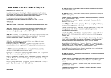 KOMUNIKACJA NA WSZYSTKICH ŚWIĘTYCH opublikowano: 25.10.2016 14:00 5 punktów informacyjnych i kontrolnych, 130 osób zabezpieczenia, 45 zaplecza technicznego tramwajów, prawie 100 dodatkowych pojazdów na trasach. To tylko część ważnych liczb związanych z organizacją Wszystkich Świętych. I. Organizacja ruchu środków komunikacji miejskiej na okres wzmożonych przewozów do cmentarzy w okresie od 28.10 do 1.11.2016 r. TRAMWAJE: 28.10.2016 (piątek) – na wszystkich liniach obowiązują powszednie rozkłady jazdy. 29.10.2016 (sobota) – na wszystkich liniach obowiązują sobotnie rozkłady jazdy. Dodatkowo zostaje uruchomiona linia 15 (Dworzec Niebuszewo – Gumieńce) – specjalny rozkład jazdy, kursuje w godzinach 9-17 co 24 min. 30.10.2016 (niedziela) – na wszystkich liniach obowiązują świąteczne rozkłady jazdy. Dodatkowo zostaje uruchomiona linia 15 (Dworzec Niebuszewo – Gumieńce) – specjalny rozkład jazdy, kursuje w godzinach 9-17 co 24 min. 31.10.2016 (poniedziałek) – na wszystkich liniach poza niżej wymienionymi obowiązują powszednie rozkłady jazdy. Na linii 10 (Las Arkoński – Gumieńce) – specjalny rozkład jazdy, kursowanie z częstotliwością co 12 min. w godzinach 7-17, w pozostałym okresie bez zmian. 1.11.2016 (wtorek) Wszystkich Świętych – na wszystkich liniach poza niżej wymienionymi obowiązują sobotnie rozkłady jazdy. Linie numer 2,3,7,8 kursują w godzinach: godz. 9-18 co 6 min, godz. 8-9 i godz. 1819 co 10 min, w pozostałych godzinach co 20 min. Linie 10 (Las Arkoński – Gumieńce) oraz 14 (Filharmonia – Gumieńce, nawrót przez pl. Rodła – Matejki – pl. Żołnierza Polskiego) – specjalny rozkład jazdy – kursują w godz. 9-18 co 24 min Linia 15 (Dworzec Niebuszewo – Gumieńce) – specjalny rozkład jazdy – kursuje w godz. 9-18 co 12 min, godz. 7-9, 18-19:30 co 20 min, AUTOBUSY: 28.10.2016 (piątek) – na wszystkich liniach, poza niżej wymienionymi obowiązują powszednie rozkłady jazdy. 29.10.2016 (sobota) – na wszystkich liniach poza niżej wymienionymi, obowiązują sobotnie rozkłady jazdy. Linia 53 (Stocznia Szczecińska – Pomorzany) – specjalny rozkład jazdy – kursują co 10 min w godzinach 9:30 – 18:00. Linia 853 (Ludowa – Dworska) – specjalny rozkład jazdy – kursuje co 20 min w godzinach 9:00 – 18:00. Linia 860 (Stocznia Szczecińska – Dworska – Cukrowa) – specjalny rozkład jazdy kursuje co 20 min w godzinach 9:00 – 18:00 Linia 61 (Owocowa Dworzec – Podjuchy) – specjalny rozkład jazdy – kursują co 10 min w godzinach 9:00 – 18:00, w pozostałych godzinach wg normalnie obowiązującego rozkładu jazdy. Linia 64 (Klucz Pętla – Dąbie Osiedle) – specjalny rozkłady – kursuje co 15 min w godzinach 9:00 – 18:00, w pozostałych godzinach wg normalnie obowiązującego rozkładu jazdy. Linia 867 (Ludowa – Rugiańska – Komuny Paryskiej – Sczanieckiej – Słowackiego – Karola Miarki) (powrót przez Niemcewicza – Warcisława – Przyjaciół Żołnierza) – specjalny rozkład jazdy, kursuje w godzinach, 10:00 – 18:00 co 16 minut. Linia 880 (Police Osiedle Chemik – Przęsocin – Obotrycka – Przyjaciół Żołnierza – Papieża Pawła VI – al. Wojska Polskiego – Traugutta – Santocka – Karola Miarki) – specjalny rozkład jazdy – kursuje co 20 min w godzinach 9:00 – 18:00 Linia 102 (Police Tanowska Szkoła – Gocław) – specjalny, sobotni rozkład jazdy – kursuje co 20–24 min. w godzinach 9:00 – 17:00. 30.10.2016 (niedziela) – na wszystkich liniach poza niżej wymienionymi, obowiązują świąteczne rozkłady jazdy. Linia 53 (Stocznia Szczecińska – Pomorzany) – specjalny rozkład jazdy – kursuje co 10 min w godzinach 9:30 – 18:00. Dla brygad 6-10 przerwa na posiłek na pętli Ludowa. Linia 853 (Ludowa – Dworska) – specjalny rozkład jazdy – kursuje co 20 min w godzinach 9:00 – 18:00. Linia 860 (Stocznia Szczecińska – Dworska – Cukrowa) – kursuje co 20 min w godzinach 9:00 – 18:00 Linia 61 (Owocowa Dworzec – Podjuchy) – specjalny rozkład jazdy – kursuje co 10 min w godzinach 9:00 – 18:00, w pozostałych godzinach wg normalnie obowiązującego rozkładu jazdy. Linia 64 (Klucz Pętla – Dąbie Osiedle) – specjalny rozkład –kursuje co 15 min w godzinach 9:00 – 18:00, w pozostałych godzinach wg normalnie obowiązującego rozkładu jazdy. Linia 867 (Ludowa – Rugiańska – Komuny Paryskiej – Sczanieckiej Słowackiego – Karola Miarki) (powrót przez Niemcewicza – Warcisława – Przyjaciół Żołnierza) – Kursuje co 8 min w godz, 8:15 – 10:00, co 4 minuty w godz 10:00 – 17:00 , co 8 min w godz. 17:00 – 18:00, co 10 min w godz. 18:00 – 19:00 Linia 880 (Police Osiedle Chemik – Przęsocin – Obotrycka – Przyjaciół Żołnierza – Papieża Pawła VI – al. Wojska Polskiego – Traugutta – Santocka – Karola Miarki) – kursuje co 10 min w godz 9:00 – 18:00 Linia 867 (Ludowa – Rugiańska – Komuny Paryskiej – Sczanieckiej – Słowackiego – Karola Miarki) (powrót przez Niemcewicza – Warcisława – Przyjaciół Żołnierza) – specjalny rozkład jazdy – kursuje co 16 min w godzinach 10:00 – 18:00 Linia 102 (Police Tanowska Szkoła – Gocław) – kursuje co 20–24 min. w godzinach 9:00 – 17:00. Linia 880 (Police Osiedle Chemik – Przęsocin – Obotrycka – Przyjaciół Żołnierza – Papieża Pawła VI – al. Wojska Polskiego – Traugutta – Santocka – Karola Miarki) – specjalny rozkład jazdy – kursuje co 20 min w godzinach 9:00 – 18:00 Przygotowane są także rezerwy – dodatkowe autobusy przegubowe do wspomagania linii obsługujących rejon cmentarzy. Będą kursowały według dyspozycji Centrali Ruchu w wzmożonego ruchu. Linia 102 (Police Tanowska Szkoła – Gocław) – specjalny sobotni rozkład jazdy – kursuje, co 20–24 min w godzinach 9:00 – 17:00. ZMIANY W ORGANIZACJI RUCHU Termin wprowadzenia czasowej o