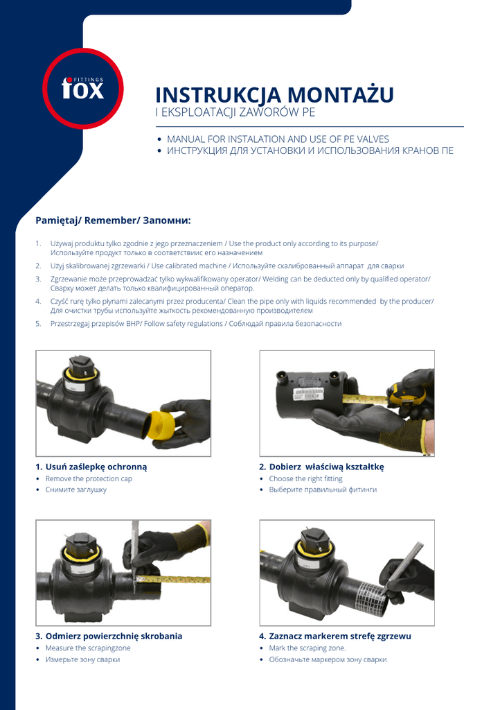 INSTRUKCJA MONTAŻU I EKSPLOATACJI ZAWORÓW PE • MANUAL FOR INSTALATION AND USE OF PE VALVES • ИНСТРУКЦИЯ ДЛЯ УСТАНОВКИ И ИСПОЛЬЗОВАНИЯ КРАНОВ ПЕ Pamiętaj/ Remember/ Запомни: 1. Używaj produktu tylko zgodnie z jego przeznaczeniem / Use the product only according to its purpose/ Используйте продукт только в соответствиис его назначением 2. Użyj skalibrowanej zgrzewarki / Use calibrated machine / Используйте скалиброванный аппарат для сварки 3. Zgrzewanie może przeprowadzać tylko wykwalifikowany operator/ Welding can be deducted only by qualified operator/ Сварку может делать только квалифицированный оператор. 4. Czyść rurę tylko płynami zalecanymi przez producenta/ Clean the pipe only with liquids recommended by the producer/ Для очистки трубы используйте жыткость рекомендованную производителем 5. Przestrzegaj przepisów BHP/ Follow safety regulations / Соблюдай правила безопасности 1.Usuń zaślepkę ochronną 2.Dobierz właściwą kształtkę •• Remove the protection cap •• Choose the right fitting •• Снимите заглушку •• Выберите правильный фитинги 3.Odmierz powierzchnię skrobania 4.Zaznacz markerem strefę zgrzewu •• Measure the scrapingzone •• Mark the scraping zone. •• Измерьте зону сварки •• Обозначьте маркером зону сварки 5.Usuń 2- krotnie utlenioną warstwę PE •• Remove twice oxidized PE surface •• Почистите скребком 2-раза зону сварки 6.Odtłuść odejście zaworu i kształtkę, czekaj do odparowania. •• Clean the welding zone of outlet and fitting and wait until evaporation •• Очистьтекран и фитинг и подождите пока испарится жыткость 7.Odmierz strefę zgrzewania, zamontuj kształtkę 8.Wykonaj zgrzewanie, postępuj zgodnie z wytycznymi zgrzewarki •• Measure the weldingzone, install the fitting •• Start welding, proceed according to the requirements of the machine •• Измерьте зону сварки и установите фитинг 9.Połącz kolumnę z zaworem •• Join the valve extension with the valve •• Подключите шток с краном •• Начьнитесварку, действуйте в соответствии с требованиями сварочного аппарата 10. Zamykanie zaworu zgodnie z kierunkiem wskazówek zegara •• The valve closes clockwise •• Кран закрывается почасовой стрелке Uwagi/ Notes/ Заметки: •• Przewidywany okres użytkowania zaworu to 50 lat / The valve’s expected life is 50 years / Предвиденный срок эксплуатации 50 лет •• Zaworów nie remontuje się / Valves are nor repairable / Кран неремонтируется •• Zakres temperatury pracy zaworu to od -5 do + 40 / The operating temperature range is -5 to +40 / Рабочая температура крана от -5 до +40 градусов •• Zawory podlegają recyclingowi / The valves are recyclable / Краны пригодны для вторичной переработки