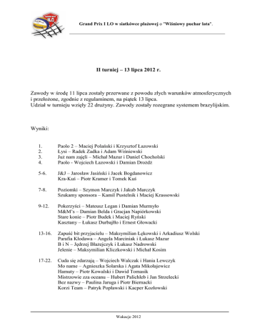 Grand Prix I LO w siatkówce plażowej o "Wiśniowy puchar lata". II turniej – 13 lipca 2012 r. Zawody w środę 11 lipca zostały przerwane z powodu złych warunków atmosferycznych i przełożone, zgodnie z regulaminem, na piątek 13 lipca. Udział w turnieju wzięły 22 drużyny. Zawody zostały rozegrane systemem brazylijskim. Wyniki: 1. 2. 3. 4. Paolo 2 – Maciej Polański i Krzysztof Łazowski Łysi – Radek Zadka i Adam Wiśniewski Już nam zajęli – Michał Mazur i Daniel Chocholski Paolo - Wojciech Łazowski i Damian Drożdż 5-6. J&J – Jarosław Jasiński i Jacek Bogdanowicz Kra-Kuś – Piotr Kramer i Tomek Kuś 7-8. Poziomki – Szymon Marczyk i Jakub Marczyk Szukamy sponsora – Kamil Pustelnik i Maciej Krassowski 9-12. Pokerzyści – Mateusz Legan i Damian Murmyło M&M’s – Damian Belda i Gracjan Napiórkowski Stare konie – Piotr Budek i Maciej Ryński Kasztany – Łukasz Durbajłło i Ernest Głowacki 13-16. Zapuść bit przyjacielu – Maksymilian Łękowski i Arkadiusz Wolski Parafia Kłodawa – Angela Marciniak i Łukasz Mazur B i N – Jędrzej Błażejczyk i Łukasz Nadrowski Jelenie – Maksymilian Kliczkowski i Michał Kosim 17-22. Cuda się zdarzają – Wojciech Walczak i Hania Lewczyk Mo name – Agnieszka Solarska i Agata Mikołajewicz Hamuty – Piotr Kowalski i Dawid Tomasik Mistrzowie zza oceanu – Hubert Palichleb i Jan Strzelecki Bez nazwy – Paulina Jaruga i Piotr Biernacki Korzi Team – Patryk Popławski i Kacper Kozłowski Wakacje 2012 Grand Prix I LO w siatkówce plażowej o "Wiśniowy puchar lata" Wyniki spotkań: 1. 2. 3. 4. 5. 6. 7. 8. 9. 10. 11. 12. 13. 14. 15. 16. 17. 18. 19. 20. 21. 22. 23. 24. 25. 26. 27. 28. 29. 30. 31. 32. 33. 34. 35. 36. 37. 38. 39. 40. 41. 42. Korzi Team – Cuda się zdarzają B i N – Mo name Już nam zajęli – Parafia Kłodawa Mistrzowie zza oceanu – Hamuty J&J – Bez nazwy Kasztany – Paolo 2 Pokerzyści – Korzi Team Jelenie – Paolo Łysi – B i N Już nam zajęli – Kra-Kuś Stare konie – Mamuty J&J – M&M’s Poziomki – Szukamy sponsora Paolo 2 – Zapuść bit przyjacielu Kasztany – Korzi Team Bez nazwy – B i N Kra-Kuś – Mistrzowie zza oceanu Parafia Kłodawa – Hamuty M&M’s – Mo name Zapuść bit przyjacielu – Cuda się zdarzają Pokerzyści – Paolo Łysi – Już nam zajęli Stare konie – J&J Szukamy sponsora – Paolo 2 Zapuść bit przyjacielu – Poziomki M&M’s – Parafia Kłodawa Kra-Kuś – B i N Jelenie – Kasztany Poziomki – Pokerzyści M&M’s – Łysi Kra-Kuś – Stare konie Kasztany – Szukamy sponsora Paolo - Już nam zajęli J&J – Paolo 2 Poziomki – Łysi Kra-Kuś – Szukamy sponsora J&J – Łysi Już nam zajęli – Kra-Kuś Paolo – Łysi Paolo 2 – Już nam zajęli Paolo – Już nam zajęli Łysi – Paolo 2 21:8 21:13 21:9 12:21 21:8 6:21 21:17 8:21 21:1 21:19 21:19 21:8 18:21 21:9 21:14 18:21 21:11 21:18 21:11 21:12 15:21 11:21 12:21 11:21 11:21 23:21 21:13 17:21 21:12 11:21 21:16 18:21 21:16 13:21 10:21 21:14 18:21 21:19 5:21 21:15 21:23 13:21 Wakacje 2012 2 Grand Prix I LO w siatkówce plażowej o "Wiśniowy puchar lata" Klasyfikacja Grand Prix I LO po II turnieju (udział w zawodach): 1-2. 3-4. 5. 6-7. 8. 9-13. 14-15. 16-17. 18-24. 25-34. Daniel Chocholski Michał Mazur Jacek Bogdanowicz Jarosław Jasiński Maciej Polański Kamil Pustelnik Maciej Krassowski Sebastian Kałużny Piotr Budek Dawid Białasek Michał Ebert Paweł Kurzawiński Paweł Wiśniewski Jakub Marczyk Łukasz Antczak Gracjan Napiórkowski Mateusz Legan Angela Marciniak Hubert Palichleb Łukasz Mazur Maksymilian Łękowski Piotr Biernacki Bartosz Rubaszewski Maciej Ryński Agata Mikołajewicz Arkadiusz Wolski Jędrzej Błażejczyk Jan Strzelecki Kacper Kozłowski Łukasz Nadrowski Patryk Popławski Tomasz Noworyta Tomek Mikołajczyk Wojciech Walczak 18 18 14 14 10 8 8 7 6 6 6 6 6 4 4 3 3 2 2 2 2 2 2 2 1 1 1 1 1 1 1 1 1 1 (2) (2) (2) (2) (1) (2) (2) (1) (2) (1) (1) (1) (1) (1) (1) (2) (2) (2) (2) (2) (2) (2) (1) (1) (1) (1) (1) (1) (1) (1) (1) (1) (1) (1) Opracował: Paweł Wiśniewski Wakacje 2012 3