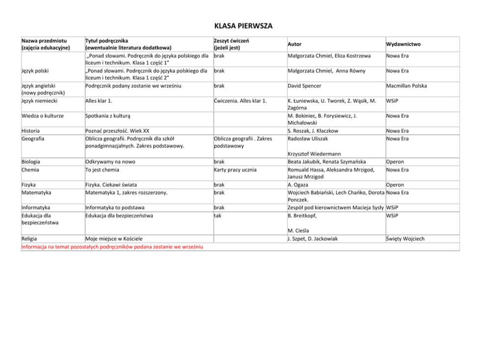 KLASA PIERWSZA Nazwa przedmiotu (zajęcia edukacyjne) Język polski Język angielski (nowy podręcznik) Język niemiecki Tytuł podręcznika (ewentualnie literatura dodatkowa) „Ponad słowami. Podręcznik do języka polskiego dla liceum i technikum. Klasa 1 część 1” „Ponad słowami. Podręcznik do języka polskiego dla liceum i technikum. Klasa 1 część 2” Podręcznik podany zostanie we wrześniu Zeszyt ćwiczeń (jeżeli jest) brak Alles klar 1. Autor Wydawnictwo Małgorzata Chmiel, Eliza Kostrzewa Nowa Era brak Małgorzata Chmiel, Anna Równy Nowa Era brak David Spencer Macmillan Polska Ćwiczenia. Alles klar 1. K. Łuniewska, U. Tworek, Z. Wąsik, M. Zagórna M. Bokiniec, B. Forysiewicz, J. Michałowski S. Roszak, J. Kłaczkow Radosław Uliszak WSiP Wiedza o kulturze Spotkania z kulturą Historia Geografia Poznać przeszłość. Wiek XX Oblicza geografii. Podręcznik dla szkół ponadgimnazjalnych. Zakres podstawowy. Oblicza geografii . Zakres podstawowy Biologia Chemia Odkrywamy na nowo To jest chemia brak Karty pracy ucznia Fizyka Matematyka Fizyka. Ciekawi świata Matematyka 1, zakres rozszerzony. brak brak Informatyka Edukacja dla bezpieczeństwa Informatyka to podstawa Edukacja dla bezpieczeństwa brak tak Religia Moje miejsce w Kościele Informacja na temat pozostałych podręczników podana zostanie we wrześniu Nowa Era Nowa Era Nowa Era Krzysztof Wiedermann Beata Jakubik, Renata Szymańska Operon Romuald Hassa, Aleksandra Mrzigod, Nowa Era Janusz Mrzigod A. Ogaza Operon Wojciech Babiański, Lech Chańko, Dorota Nowa Era Ponczek. Zespół pod kierownictwem Macieja Sysły WSiP B. Breitkopf, WSiP M. Cieśla J. Szpet, D. Jackowiak Święty Wojciech KLASA DRUGA Nazwa przedmiotu (zajęcia edukacyjne) Język polski Język angielski Tytuł podręcznika (ewentualnie literatura dodatkowa) „Ponad słowami. Podręcznik do języka polskiego dla liceum i technikum. Klasa 2 część 1” Zeszyt ćwiczeń (jeżeli jest) brak „Ponad słowami. Podręcznik do języka polskiego dla liceum i technikum. Klasa 2 część 2” brak Gateway 2 Plus brak Autor Wydawnictwo Małgorzata Chmiel, Anna Równy Nowa Era Małgorzata Chmiel, Nowa Era Ewa Mirkowska- Traugutt, Anna Równy David Spencer Macmillan Polska K. Łuniewska, U. Tworek, Z. Wąsik, M. Zagórna Marek Guzik, WSiP Gateway 3 Plus Język niemiecki Alles klar Biologia Biologia na czasie 1. Zakres rozszerzony Nowa Era Ewa Jastrzębska Historia i społeczeństwo Poznać przeszłość. Ojczysty Panteon i ojczyste spory Tomasz Maćkowski Nowa Era Wiedza o społeczeństwie W centrum uwagi. Zakres podstawowy Arkadiusz Janicki Nowa Era Podstawy przedsiębiorczości Odkrywamy na nowo. Podstawy przedsiębiorczości brak J. Korba, Z. Smutek Operon Matematyka Matematyka 2, zakres rozszerzony brak Wojciech Babiański, Lech Chańko, Dorota Ponczek. Nowa Era Religia Moje miejsce w świecie J. Szpet, D. Jackowiak Św. Wojciech Wykaz podręczników do przedmiotów zawodowych podany zostanie we wrześniu KLASA TRZECIA Nazwa przedmiotu (zajęcia edukacyjne) Tytuł podręcznika (ewentualnie literatura dodatkowa) „Ponad słowami. Podręcznik do języka polskiego dla liceum i technikum. Klasa 2 część 2” Zeszyt ćwiczeń (jeżeli jest) brak Język angielski Longman repetytorium maturalne. Poziom podstawowy 2015 brak Język niemiecki Genau! Biologia Podręcznik dla liceum ogólnokształcącego i technikum. Zakres rozszerzony. Historia i społeczeństwo Podręcznik zostanie podany we wrześniu Matematyka Matematyka 2, zakres rozszerzony Religia Moje miejsce w rodzinie Język polski Autor Wydawnictwo Małgorzata Chmiel, Ewa MirkowskaTreugutt, Anna Równy Nowa Era Marta Umińska i in. Pearson LektorKlett brak F. Dubert, M. Jurgowiak Nowa Era brak Wojciech Babiański, Lech Chańko, Dorota Ponczek. Nowa Era J. Szpet, D. Jackowiak Św. Wojciech Wykaz podręczników do przedmiotów zawodowych podany zostanie we wrześniu KLASA CZWARTA Nazwa przedmiotu (zajęcia edukacyjne) Tytuł podręcznika (ewentualnie literatura dodatkowa) „Ponad słowami. Podręcznik do języka polskiego dla liceum i technikum. Klasa 3 Zeszyt ćwiczeń (jeżeli jest) brak Język angielski Longman repetytorium maturalne. Poziom podstawowy 2015 Język niemiecki Alles klar Biologia Biologia na czasie 3. Zakres rozszerzony. Historia i społeczeństwo Podręczniki zostaną podane we wrześniu Matematyka Matematyka 3, zakres rozszerzony Religia Moje miejsce w rodzinie Język polski Autor Wydawnictwo Małgorzata Chmiel, Robert Pruszczyński, Anna Równy Nowa Era brak Marta Umińska i in. Pearson brak Krystyna Łuniewska, Urszula Tworek, Zofia Wąsik, Maria Zagórna WSiP F. Dubert, M. Jurgowiak, M. MarkoWitkowska, W Zamachowski Nowa Era Wojciech Babiański, Lech Chańko, Dorota Ponczek. Nowa Era J. Szpet, D. Jackowiak Św. Wojciech brak Wykaz podręczników do przedmiotów zawodowych podany zostanie we wrześniu