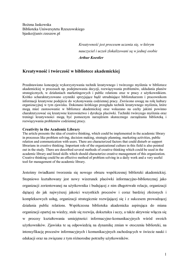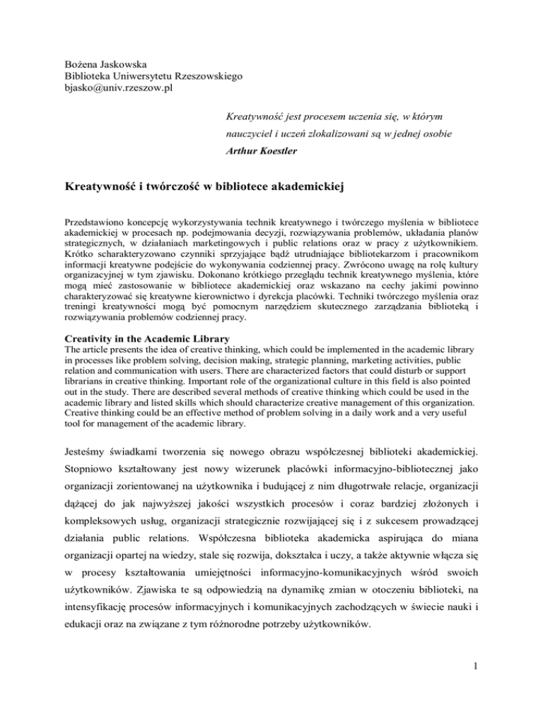 Bożena Jaskowska Biblioteka Uniwersytetu Rzeszowskiego [email protected] Kreatywność jest procesem uczenia się, w którym nauczyciel i uczeń zlokalizowani są w jednej osobie Arthur Koestler Kreatywność i twórczość w bibliotece akademickiej Przedstawiono koncepcję wykorzystywania technik kreatywnego i twórczego myślenia w bibliotece akademickiej w procesach np. podejmowania decyzji, rozwiązywania problemów, układania planów strategicznych, w działaniach marketingowych i public relations oraz w pracy z użytkownikiem. Krótko scharakteryzowano czynniki sprzyjające bądź utrudniające bibliotekarzom i pracownikom informacji kreatywne podejście do wykonywania codziennej pracy. Zwrócono uwagę na rolę kultury organizacyjnej w tym zjawisku. Dokonano krótkiego przeglądu technik kreatywnego myślenia, które mogą mieć zastosowanie w bibliotece akademickiej oraz wskazano na cechy jakimi powinno charakteryzować się kreatywne kierownictwo i dyrekcja placówki. Techniki twórczego myślenia oraz treningi kreatywności mogą być pomocnym narzędziem skutecznego zarządzania biblioteką i rozwiązywania problemów codziennej pracy. Creativity in the Academic Library The article presents the idea of creative thinking, which could be implemented in the academic library in processes like problem solving, decision making, strategic planning, marketing activities, public relation and communication with users. There are characterized factors that could disturb or support librarians in creative thinking. Important role of the organizational culture in this field is also pointed out in the study. There are described several methods of creative thinking which could be used in the academic library and listed skills which should characterize creative management of this organization. Creative thinking could be an effective method of problem solving in a daily work and a very useful tool for management of the academic library. Jesteśmy świadkami tworzenia się nowego obrazu współczesnej biblioteki akademickiej. Stopniowo kształtowany jest nowy wizerunek placówki informacyjno-bibliotecznej jako organizacji zorientowanej na użytkownika i budującej z nim długotrwałe relacje, organizacji dążącej do jak najwyższej jakości wszystkich procesów i coraz bardziej złożonych i kompleksowych usług, organizacji strategicznie rozwijającej się i z sukcesem prowadzącej działania public relations. Współczesna biblioteka akademicka aspirująca do miana organizacji opartej na wiedzy, stale się rozwija, dokształca i uczy, a także aktywnie włącza się w procesy kształtowania umiejętności informacyjno-komunikacyjnych wśród swoich użytkowników. Zjawiska te są odpowiedzią na dynamikę zmian w otoczeniu biblioteki, na intensyfikację procesów informacyjnych i komunikacyjnych zachodzących w świecie nauki i edukacji oraz na związane z tym różnorodne potrzeby użytkowników. 1 Nowy paradygmat biblioteki akademickiej XXI w. powstaje dzięki efektywnym sposobom zarządzania wykorzystywanym przez dyrekcje placówek i dzięki lepszemu wykorzystywaniu kapitału intelektualnego pracowników biblioteki. Elementem, który może sprzyjać, ale i przeszkadzać lub nawet uniemożliwiać, wprowadzanie zmian i koniecznych przeobrażeń do biblioteki jest jej kultura organizacyjna. Proinnowacyjna kultura promująca elastyczność, akceptację zmian, działanie zespołowe oraz współuczestniczenie w procesach decyzyjnych i doradczych budowana jest m. in. dzięki kreatywności dyrekcji, kierowników i pracowników biblioteki akademickiej. Kreatywność, nieważne czy utożsamiana z innowacyjnością, czy zaradnością, elastycznością myślenia czy inteligencją, aktywnością i sprawnym rozwiązywaniem problemów, lub może ze wszystkimi tymi cechami równocześnie, kreatywność uważana jest dziś za jedną z najważniejszych cech (obok merytorycznego i kompetencyjnego przygotowania) pożądaną we współczesnych organizacjach. Czy również w bibliotekach akademickich? Twórczość i kreatywność Twórczość jest przedmiotem badań i teorii wielu dyscyplin. Najpowszechniej przyjmowana jest definicja płynąca z idei psychologii humanistycznej uznająca twórczość za działalność człowieka przynoszącą rezultaty obiektywne lub/i subiektywne nowe i wartościowe, we wszystkich dziedzinach życia, zwłaszcza w nauce, sztuce i kulturze [1]. Jest to najbardziej pierwotna kategoria definicji twórczości uznawanej za proces. Oprócz tego twórczość może być rozpatrywana jako dzieło (wytwór o cechach nowości, oryginalności, generatywności i społecznej przynależności), jako zespół zdolności intelektualnych i cech osobowościowych (m. in. niezależność, otwartość, nonkormizm, wrażliwość, dociekliwość, odwaga, silny poziom odpowiedzialności i motywacji wewnętrznej, silne ego, samoorganizacja) oraz może być twórczość definiowana jako zespół stymulatorów społecznych (społecznego klimatu uwarunkowań społecznych) [2]. Ukształtowane w minionych latach spojrzenie na twórczość jako działalność elitarną, dostępną tylko dla nielicznych jednostek o wysokich zdolnościach, predyspozycjach i wysokim poziomie ilorazu inteligencji w dynamicznych latach XX i XXI w. znacznie zmieniło swe oblicze i się „zdemokratyzowało”. Szczególnie jeśli chodzi o twórczość rozumianą jako proces oraz synonim zdolności i postaw twórczych – czyli kreatywność. Kreatywność tj. umiejętność tworzenia i realizowania osobliwych, nowych i użytecznych 2 pomysłów, usług lub rzeczy [3] stała się cechą niezwykle dziś pożądaną, i jak się okazuje możliwą do trenowania, rozwijania i wykorzystywania na równi z innymi zdolnościami i predyspozycjami. Nawet dla ludzi mniej inteligentnych. Liczne badania wykazały bowiem, że ludzie o wysokim poziomie ilorazu inteligencji wpadali w tzw. pułapkę inteligencji, która ograniczała znacznie ich kre