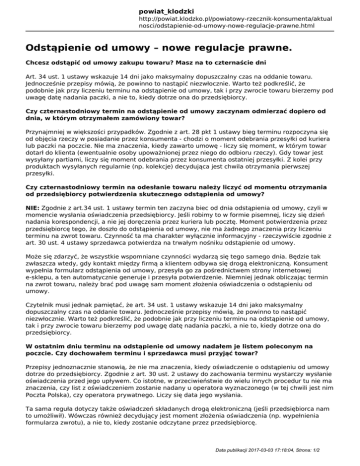 powiat_klodzki http://powiat.klodzko.pl/powiatowy-rzecznik-konsumenta/aktual nosci/odstapienie-od-umowy-nowe-regulacje-prawne.html Odstąpienie od umowy – nowe regulacje prawne. Chcesz odstąpić od umowy zakupu towaru? Masz na to czternaście dni Art. 34 ust. 1 ustawy wskazuje 14 dni jako maksymalny dopuszczalny czas na oddanie towaru. Jednocześnie przepisy mówią, że powinno to nastąpić niezwłocznie. Warto też podkreślić, że podobnie jak przy liczeniu terminu na odstąpienie od umowy, tak i przy zwrocie towaru bierzemy pod uwagę datę nadania paczki, a nie to, kiedy dotrze ona do przedsiębiorcy. Czy czternastodniowy termin na odstąpienie od umowy zaczynam odmierzać dopiero od dnia, w którym otrzymałem zamówiony towar? Przynajmniej w większości przypadków. Zgodnie z art. 28 pkt 1 ustawy bieg terminu rozpoczyna się od objęcia rzeczy w posiadanie przez konsumenta - chodzi o moment odebrania przesyłki od kuriera lub paczki na poczcie. Nie ma znaczenia, kiedy zawarto umowę - liczy się moment, w którym towar dotarł do klienta (ewentualnie osoby upoważnionej przez niego do odbioru rzeczy). Gdy towar jest wysyłany partiami, liczy się moment odebrania przez konsumenta ostatniej przesyłki. Z kolei przy produktach wysyłanych regularnie (np. kolekcje) decydująca jest chwila otrzymania pierwszej przesyłki. Czy czternastodniowy termin na odesłanie towaru należy liczyć od momentu otrzymania od przedsiębiorcy potwierdzenia skutecznego odstąpienia od umowy? NIE: Zgodnie z art.34 ust. 1 ustawy termin ten zaczyna biec od dnia odstąpienia od umowy, czyli w momencie wysłania oświadczenia przedsiębiorcy. Jeśli robimy to w formie pisemnej, liczy się dzień nadania korespondencji, a nie jej doręczenia przez kuriera lub pocztę. Moment potwierdzenia przez przedsiębiorcę tego, że doszło do odstąpienia od umowy, nie ma żadnego znaczenia przy liczeniu terminu na zwrot towaru. Czynność ta ma charakter wyłącznie informacyjny - rzeczywiście zgodnie z art. 30 ust. 4 ustawy sprzedawca potwierdza na trwałym nośniku odstąpienie od umowy. Może się zdarzyć, że wszystkie wspomniane czynności wydarzą się tego samego dnia. Będzie tak zwłaszcza wtedy, gdy kontakt między firmą a klientem odbywa się drogą elektroniczną. Konsument wypełnia formularz odstąpienia od umowy, przesyła go za pośrednictwem strony internetowej e-sklepu, a ten automatycznie generuje i przesyła potwierdzenie. Niemniej jednak obliczając termin na zwrot towaru, należy brać pod uwagę sam moment złożenia oświadczenia o odstąpieniu od umowy. Czytelnik musi jednak pamiętać, że art. 34 ust. 1 ustawy wskazuje 14 dni jako maksymalny dopuszczalny czas na oddanie towaru. Jednocześnie przepisy mówią, że powinno to nastąpić niezwłocznie. Warto też podkreślić, że podobnie jak przy liczeniu terminu na odstąpienie od umowy, tak i przy zwrocie towaru bierzemy pod uwagę datę nadania paczki, a nie to, kiedy dotrze ona do przedsiębiorcy. W ostatnim dniu terminu na odstąpienie od umowy nadałem je listem poleconym na poczcie. Czy dochowałem terminu i sprzedawca musi przyjąć towar? Przepisy jednoznacznie stanowią, że nie ma znaczenia, kiedy oświadczenie o odstąpieniu od umowy dotrze do przedsiębiorcy. Zgodnie z art. 30 ust. 2 ustawy do zachowania terminu wystarczy wysłanie oświadczenia przed jego upływem. Co istotne, w przeciwieństwie do wielu innych procedur tu nie ma znaczenia, czy list z oświadczeniem zostanie nadany u operatora wyznaczonego (w tej chwili jest nim Poczta Polska), czy operatora prywatnego. Liczy się data jego wysłania. Ta sama reguła dotyczy także oświadczeń składanych drogą elektroniczną (jeśli przedsiębiorca nam to umożliwił). Wówczas również decydujący jest moment złożenia oświadczenia (np. wypełnienia formularza zwrotu), a nie to, kiedy zostanie odczytane przez przedsiębiorcę. Data publikacji 2017-03-03 17:18:04, Strona: 1/2 powiat_klodzki http://powiat.klodzko.pl/powiatowy-rzecznik-konsumenta/aktual nosci/odstapienie-od-umowy-nowe-regulacje-prawne.html Podstawa prawna: Ustawa z 30 maja 2014 r. o prawach konsumenta (Dz.U. 2014. 827). Data publikacji 2017-03-03 17:18:04, Strona: 2/2