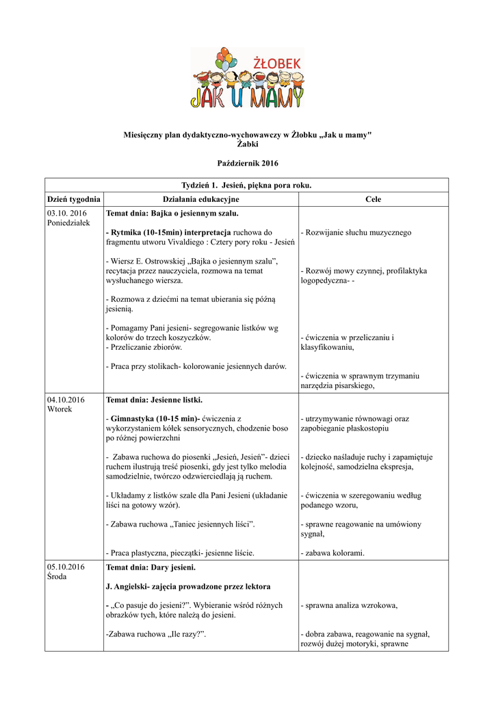 Miesięczny plan dydaktyczno-wychowawczy w Żłobku „Jak u mamy" Żabki Październik 2016 Tydzień 1. Jesień, piękna pora roku. Dzień tygodnia 03.10. 2016 Poniedziałek Działania edukacyjne Cele Temat dnia: Bajka o jesiennym szalu. - Rytmika (10-15min) interpretacja ruchowa do - Rozwijanie słuchu muzycznego fragmentu utworu Vivaldiego : Cztery pory roku - Jesień - Wiersz E. Ostrowskiej „Bajka o jesiennym szalu”, recytacja przez nauczyciela, rozmowa na temat wysłuchanego wiersza. - Rozwój mowy czynnej, profilaktyka logopedyczna- - - Rozmowa z dziećmi na temat ubierania się późną jesienią. - Pomagamy Pani jesieni- segregowanie listków wg kolorów do trzech koszyczków. - Przeliczanie zbiorów. - ćwiczenia w przeliczaniu i klasyfikowaniu, - Praca przy stolikach- kolorowanie jesiennych darów. - ćwiczenia w sprawnym trzymaniu narzędzia pisarskiego, 04.10.2016 Wtorek 05.10.2016 Środa Temat dnia: Jesienne listki. - Gimnastyka (10-15 min)- ćwiczenia z wykorzystaniem kółek sensorycznych, chodzenie boso po różnej powierzchni - utrzymywanie równowagi oraz zapobieganie płaskostopiu - Zabawa ruchowa do piosenki „Jesień, Jesień”- dzieci ruchem ilustrują treść piosenki, gdy jest tylko melodia samodzielnie, twórczo odzwierciedlają ją ruchem. - dziecko naśladuje ruchy i zapamiętuje kolejność, samodzielna ekspresja, - Układamy z listków szale dla Pani Jesieni (układanie liści na gotowy wzór). - ćwiczenia w szeregowaniu według podanego wzoru, - Zabawa ruchowa „Taniec jesiennych liści”. - sprawne reagowanie na umówiony sygnał, - Praca plastyczna, pieczątki- jesienne liście. - zabawa kolorami. Temat dnia: Dary jesieni. J. Angielski- zajęcia prowadzone przez lektora - „Co pasuje do jesieni?”. Wybieranie wśród różnych obrazków tych, które należą do jesieni. - sprawna analiza wzrokowa, -Zabawa ruchowa „Ile razy?”. - dobra zabawa, reagowanie na sygnał, rozwój dużej motoryki, sprawne - Zabawa dydaktyczna „do którego kosza”? przeliczanie, Segregowanie darów jesieni do odpowiednich koszyków wg podanego kodu. - „Korale dla Pani Jesieni”. Praca grupowa. 06.10.2016 Czwartek Temat dnia: Grzybobranie. Rytmika (10-15min)- Słuchanie piosenki B. Forma: „Na grzyby”. Rozmowa na temat treści piosenki. - rozwój słuchu, wzbogacenie słownictwa dzieci, -Zabawa ruchowa „Ala zbiera grzyby”. - rozwój wyobraźni, dziecko bierze aktywny udział w zabawie ruchowej, - integracja grupy poprzez wspólną zabawę -„Grzybki rosną w lesie”- zabawa utrwalająca pojęcia cicho, głośno, coraz ciszej, coraz głośniej. 07.10.2016 Piątek - rozwój zdolności plastycznych, rozwijanie motoryki małej, - Grzybobranie- zabawa matematyczna. - rozwijanie zdolności matematycznych, -Zajęcia plastyczne- Wykonanie leśnych grzybów z rolki. Prezentacja prac. - Rozwój wyobraźni poprzez tworzenie prac plastycznych. Rozwój motoryki małej. Temat dnia: Jesienne zabawy z deszczem. Gimnastyka (10-15 min)- Marsz, bieg, podskok- kształcenie koordynacji ruchowozabawa muzyczno-ruchowa polegająca na wykonywaniu słuchowej, rozwój dużej motoryki określonych czynności podczas słuchania piosenki. - Wysłuchanie wiersza pt. „Słota”. Rozmowa na temat treści wiersza. - ćwiczenia uważnego słuchania utwory i rozmowy na wybrany temat. - Zabawa „chmura i deszcz”, według K.W. Vopla. - ilustracja ruchem tekstu opowiadania, -Liczymy kropelki: zabawa matematyczna, z wykorzystaniem pojęć- jest mniej, jest więcej, jest tyle samo. - ćwiczenia sprawnego przeliczania, określania liczebności zbiorów, - Praca plastyczna „Ciągle pada”, malowanie farbami. - rozwijanie motoryki małej, J. Angielski - zajęcia prowadzone przez lektora. Tydzień 2: Szukamy jesieni w lesie. 10.10.2016 Poniedziałek Temat dnia: Jesienny kolorowy las. - Wysłuchanie wiersza L. Krzemienieckiej „Bukieciki” , - uważne słuchanie wiersza, posługiwanie rozmowa na jego temat. się określeniami oddającymi uroki jesiennego lasu, - Zabawa ruchowa z ćwiczeniami oddechowymi - interpretacja ruchem utworu „Tańczące liście”. muzycznego, - Oglądanie ilustracji jesiennego lasu, wskazanie na cechy charakterystyczne. - zauważenie cech charakterystycznych w ilustracji jesiennego lasu, - Swobodna improwizacja ruchowa do utworu „Jesień” Vivaldiego z użyciem kolorowych pasków bibuły. - umuzykalnienie dzieci, wyzwalanie ekspresji, Rytmika (10-15min) „Jestem muzykantem konszabelantem” - wprowadzenie piosenki połączone z grą na instrumentach. - Rozwój pamięci muzycznej - kształcenie umiejętności grania na różnych instrumentach i uwrażliwienie muzyczne 11.10.2016 Wtorek Temat dnia: Poznajemy leśne zwierzęta (niedźwiedź). Gimnastyka (10-15 min)- Czy tak potrafisz? Wykonywanie przez dzieci ćwiczeń prezentowanych przez n-la a następnie przez poszczególne dzieci. - rozwój motoryki dużej, ogólne usprawnianie i zwiększanie wydolności organizmu dziecka - Prezentacja galerii fotografii mieszkańców leśnych, dzieci nazywają zwierzęta, naśladują odgłosy widzianych zwierząt. - rozwój mowy czynnej dziecka, - Zabawa do piosenki „Stary niedźwiedź”. - aktywne uczestnictwo w zabawie przy muzyce, - uważne słuchanie utworu literackiego, zwrócenie uwagi na zwyczaje niedźwiedzi, - Wysłuchanie wiersza „Był sobie niedźwiedź” L. J. Kerna. Rozmowa na temat wiersza, zwyczajów niedźwiedzich, zapoznanie dzieci ze sposobem postępowania na wypadek spotkania z misiem. - Malowanie kredkami szablonu misia, zrobienie mu puszystego brzuszka. 12.10.2016 Środa - sprawne malowanie kredkami, prawidłowe trzymanie narzędzia pisarskiego, Temat dnia: Wiewiórka szykuje zapasy na zimowe czasy. J. Angielski- zajęcia prowadzone przez lektora. - Wysłuchanie wiersza „Wiewiórki” B. Ostrowskiej. Rozmowa z dziećmi na temat zapasów wiewiórki w oparciu o treść utworu. - poznanie zwierząt leśnych- wiewiórki, - uważne słuchanie utworó
