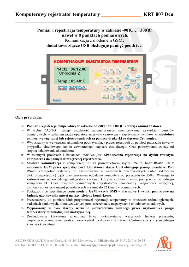 Komputerowy rejestrator temperatury __________________ KRT 807 Dcu ______________________________________________________________ Pomiar i rejestracja temperatury w zakresie -90°°C…+300°°C nawet w 8 punktach pomiarowych. Komunikacja z modemem GSM; dodatkowe złącze USB obsługuje pamięć pendrive. _______________ Opis przyrządu: • • • • • • • • • Pomiar i rejestracja temperatury w zakresie od -90°°C do +300°°C - wersja ośmiokanałowa. W trybie "AUTO" istnieje możliwość automatycznego monitorowania wszystkich punktów pomiarowych w zadanym przez operatora interwale czasowym i zapisywania wyników w nieulotnej pamięci wewnętrznej lub rejestrowania ich za pomocą drukarki ze złączem Centronics. Wyposażony w wewnętrzny akumulator podtrzymujący proces rejestracji do pamięci przyrządu nawet w przypadku chwilowego zaniku zewnętrznego napięcia zasilającego. Czas podtrzymania zależy od stopnia naładowania akumulatora. W istotnych procesach i badaniach możliwa jest równoczesna rejestracja na dysku twardym komputera i do pamięci wewnętrznej rejestratora. Możliwa komunikacja z komputerem PC za pośrednictwem złącza RS232, bądź RS485 lub z modemem GSM przez specjalny port. Dodatkowe złącze USB obsługuje pamięć pendrive. Port RS485 szczególnie zalecany do zastosowania w warunkach przemysłowych (silne zakłócenia elektromagnetyczne) bądź przy znacznym oddaleniu komputera od przyrządu do 250m. Wymaga to zastosowania odpowiedniego integratora systemu, który umożliwia również podłączenie do jednego komputera PC kilku urządzeń pomiarowych (rejestratorów temperatury, wilgotności względnej, ciśnienia atmosferycznego) posiadających w sumie do 32 kanałów pomiarowych. Podłączony do specjalnego portu modem GSM wysyła SMS – alarmowe i wyniki pomiarowe na żądanie użytkownika nawet na trzy telefony komórkowe. Przeznaczony do pomiaru i/lub programowej rejestracji temperatury w procesach technologicznych, badaniach naukowych, klimatyzowanych pomieszczeniach, magazynach i chłodniach składowych. Wyposażony w dwa alarmy wizualne przekroczenia zadanego przez użytkownika progu temperatury minimalnej lub maksymalnej. Rozbudowana klawiatura umożliwia łatwe wykorzystanie wszystkich funkcji przyrządu, rozpoczęcie/zakończenie rejestracji oraz wydruk na drukarce ze złączem Centronics przy użyciu jednego klawisza klawiatury. ___________________________________________________________________________________ APG-INNOWACJE Jolanta Góralczyk, 41-400 Mysłowice, ul. Mikołowska 29, NIP 222-016-29-35 tel./ fax: 32 317 31 13, kom. 502 430 657, e-mail: [email protected], www.apg-innowacje.pl ___________________ Komputerowy rejestrator temperatury __________________ KRT 807 Dcu ______________________________________________________________ Parametry techniczne: • • • Zakres pomiarowy: od -90°C do +300°C Rozdzielczość pomiaru i rejestracji temperatury: 0,02°C Dokładność rejestratora: 0,1% zakresu pomiarowego według odniesienia do normy PN-EN 60751 + A2:1999 • Wejście: 8 (osiem) czujników Pt100 kl. B lub A wg PN-EN 60751 + A2:1999 • Sposób podłączenia czujników Pt100: linia czterożyłowa (odległość czujników do 100m) • Interwał czasowy rejestracji temperatury: od 1 minuty do 24 godzin (programowany za pomocą klawiatury) • Interwał wydruku wyników pomiarowych na drukarce: od 1 minuty do 24 godzin (programowany za pomocą klawiatury) • Sposób podłączenia zewnętrznej pamięci pendrive (do 16GB): złącze USB (master) • Odczyt wyników pomiaru temperatury: wyświetlacz alfanumeryczny LCD 4x16 znaków • Odczyt statusu urządzenia: wyświetlacz alfanumeryczny LCD 4x16 znaków • Komunikacja z modemem GSM: oddzielny port w obudowie rejestratora • Sposób rejestracji wyników pomiarowych (programowalny przez użytkownika): - pamięć wewnętrzna, nieulotna: do 12 500 zapisów w każdym kanale pomiarowym - drukarka ze złączem Centronics i emulacją DOS podłączona bezpośrednio do urządzenia - On-line na dysk twardy współpracującego komputera PC - kopia na zewnętrzną pamięć masową USB (pendrive) i bezprzewodowe przeniesienie na komputer PC • Zasilanie: 12V dc lub 230V ac poprzez adapter • Obudowa: plastikowa, przystosowana do montażu na ścianie • Odporność klimatyczna: IP54 • Wymiary obudowy: 200 x 95 x 37mm Komunikacja z komputerem: • RS – 232 (odległość od komputera do 4 metrów) • RS – 485 – wymagany konwerter (odległość od komputera do 250 metrów) DODATKOWE INFORMACJE • gwarancja 12 miesięczna na miernik • serwis gwarancyjny i pogwarancyjny • Świadectwo Wzorcowania Urzędu Miar RP (opcja) ___________________________________________________________________________________ APG-INNOWACJE Jolanta Góralczyk, 41-400 Mysłowice, ul. Mikołowska 29, NIP 222-016-29-35 tel./ fax: 32 317 31 13, kom. 502 430 657, e-mail: [email protected], www.apg-innowacje.pl ___________________