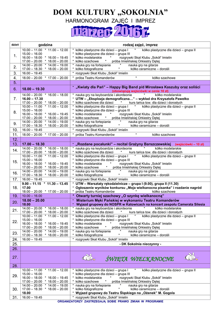 DOM KULTURY „SOKOLNIA” HARMONOGRAM ZAJĘĆ I IMPREZ dzień 1. 2. 3. 4. 5. 6. 7. 8. 9. 10. 11. 12. 13. 14. 15. 16. 17. 18. 19. 20. 21. 22. 23. 24. 25. 26. rodzaj zajęć, imprez godzina 10.00 – 11.00 15.00 – 16.00 16.00 – 18.00 17.00 – 20.00 14.00 – 20.00 17.00 – 18.30 16.00 – 19.45 18.00 – 20.00 * 11.00 – 12.00 * * * * 16.00 – 19.45 18.00 – 20.00 14.00 – 19.00 18.00 – 20.00 * 17.00 – 20.00 18.00 – 19.30 14.00 – 20.00 16.00 – 17.30 17.00 – 20.00 10.00 – 11.00 15.00 – 16.00 16.00 – 18.00 17.00 – 20.00 14.00 – 20.00 17.00 – 18.30 16.00 – 19.45 18.00 – 20.00 * 16.00 – 18.00 * 18.00 – 20.00 * 11.00 – 12.00 * * * * 16.00 – 19.45 18.00 – 20.00 14.00 – 19.00 18.00 – 20.00 * 17.00 – 20.00 17.00 – 18.30 14.00 – 20.00 17.00 – 20.00 10.00 – 11.00 15.00 – 16.00 16.00 – 18.00 17.00 – 20.00 14.00 – 20.00 17.00 – 18.30 16.00 – 19.45 9.00 – 11.15 17.00 18.00 – 20.00 10.00 – 16.00 * 16.00 – 18.00 * 18.00 – 20.00 * 11.00 – 12.00 * * * * 16.00 – 19.45 18.00 – 20.00 14.00 – 19.00 18.00 – 20.00 * 11.30 – 13.45 * 17.00 – 20.00 * * * * * * * * kółko plastyczne dla dzieci – grupa I * kółko plastyczne dla dzieci – grupa II kółko plastyczne dla dzieci – grupa III kółko modelarskie * rozgrywki Skat Klubu „Sokół” Imielin kółko szachowe * próba Imielińskiej Orkiestry Dętej nauka gry na fortepianie * nauka gry na gitarze kółko fotograficzne * kółko ceramiczne – dorośli rozgrywki Skat Klubu „Sokół” Imielin próba Teatru Komanderów * kółko szachowe * „Kwiaty dla Pań” – Happy Big Band p/d Mirosława Kaszuby oraz soliści (obowiązują wejściówki w cenie 10 zł) * nauka gry na keyboardzie i akordeonie * kółko modelarskie * UTW – „Eksplozja demograficzna…” – wykład dra Krzysztofa Pawełko * kółko szachowe dla dzieci * kurs tańca tow. dla dzieci i dorosłych * kółko plastyczne dla dzieci – grupa I * kółko plastyczne dla dzieci – grupa II * kółko plastyczne dla dzieci – grupa III * kółko modelarskie * rozgrywki Skat Klubu „Sokół” Imielin * kółko szachowe * próba Imielińskiej Orkiestry Dętej * nauka gry na fortepianie * nauka gry na gitarze * kółko fotograficzne * kółko ceramiczne – dorośli * rozgrywki Skat Klubu „Sokół” Imielin * próba Teatru Komanderów * kółko szachowe * * * * * * * * * * * * * „Rozdane pocałunki” – recital Grażyny Barszczewskiej (wejściówki – 10 zł) nauka gry na keyboardzie i akordeonie * kółko modelarskie kółko szachowe dla dzieci * kurs tańca tow. dla dzieci i dorosłych kółko plastyczne dla dzieci – grupa I * kółko plastyczne dla dzieci – grupa II kółko plastyczne dla dzieci – grupa III kółko modelarskie * rozgrywki Skat Klubu „Sokół” Imielin kółko szachowe * próba Imielińskiej Orkiestry Dętej nauka gry na fortepianie * nauka gry na gitarze kółko fotograficzne * kółko ceramiczne – dorośli rozgrywki Skat Klubu „Sokół” Imielin UTW – Warsztaty rękodzielnicze – grupa I (9.00), grupa II (11.30) Ogłoszenie wyników konkursu „Moja wielkanocna pisanka” i rozdanie nagród próba Teatru Komanderów * kółko szachowe 18.00 – 20.00 * Otwarty turniej szachowy „O szynkę wielkanocną” * Misterium Męki Pańskiej w wykonaniu Teatru Komanderów 18.00 14.00 – 20.00 17.00 – 20.00 10.00 – 11.00 15.00 – 16.00 16.00 – 18.00 17.00 – 20.00 14.00 – 20.00 17.00 – 18.30 16.00 – 19.45 * * * * * * * * * * * 16.00 – 18.00 * 18.00 – 20.00 * 11.00 – 12.00 * * * * 16.00 – 19.45 18.00 – 20.00 14.00 – 19.00 18.00 – 20.00 Wyjazd grupowy do NOSPR w Katowicach na koncert zespołu Camerata Silesia nauka gry na keyboardzie i akordeonie * kółko modelarskie kółko szachowe dla dzieci * kurs tańca tow. dla dzieci i dorosłych kółko plastyczne dla dzieci – grupa I * kółko plastyczne dla dzieci – grupa II kółko plastyczne dla dzieci – grupa III kółko modelarskie * rozgrywki Skat Klubu „Sokół” Imielin kółko szachowe * próba Imielińskiej Orkiestry Dętej nauka gry na fortepianie * nauka gry na gitarze kółko fotograficzne * kółko ceramiczne – dorośli rozgrywki Skat Klubu „Sokół” Imielin - DK Sokolnia nieczynny - ŚWIĘTA WIELKANOCNE 27. 28. 29. 30. 31. 10.00 – 11.00 15.00 – 16.00 16.00 – 18.00 17.00 – 20.00 14.00 – 20.00 17.00 – 18.30 18.00 16.00 – 19.45 * 11.00 – 12.00 * * * * 16.00 – 19.45 18.00 – 20.00 14.00 – 19.00 18.00 – 20.00 * * * * * * * * kółko plastyczne dla dzieci – grupa I * kółko plastyczne dla dzieci – grupa II kółko plastyczne dla dzieci – grupa III kółko modelarskie * rozgrywki Skat Klubu „Sokół” Imielin kółko szachowe * próba Imielińskiej Orkiestry Dętej nauka gry na fortepianie * nauka gry na gitarze kółko fotograficzne * kółko ceramiczne – dorośli Wyjazd grupowy do Teatru Śląskiego na „Ożenek” M. Gogola rozgrywki Skat Klubu „Sokół” Imielin ORGANIZATORZY ZASTRZEGAJĄ SOBIE PRAWO ZMIAN W PROGRAMIE