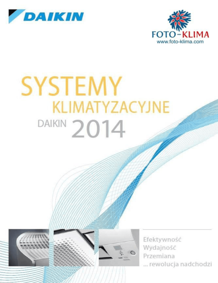 CHŁODNICTWO KLIMATYZACJA OGRZEWANIE SYSTEMY WODNE PRZYSZŁOŚĆ DZIĘKI PRZESZŁOŚCI Jesteśmy dumni w Daikin Europe N.V., że mogliśmy być uczestnikami ważnych wydarzeń, które zrewolucjonizowały branżę i kontynuujemy wysiłki, aby zapewnić dalszy postęp. Daikin z dumą może spojrzeć wstecz na historię innowacji: począwszy od pierwszych klimatyzatorów o zwartej budowie i pomp ciepła z lat pięćdziesiątych ubiegłego wieku, przez pierwsze systemy typu „multisplit” z lat sześćdziesiątych, aż do wprowadzenia na rynek systemu VRV w roku 1982 oraz jego dalszego rozwoju. Przewodzimy także w dziedzinie ultra-wydajnej technologii sterowania inwerterowego oraz w opracowywaniu bezpieczniejszych czynników chłodniczych. Wykorzystując nasze podstawowe technologie jako fundament, jesteśmy w stanie opracowywać innowacyjne i energooszczędne rozwiązania dla całej gamy sektorów rynku i zastosowań. Nasza najnowsza innowacja, Daikin Altherma, stanowi prawdziwy przełom w sektorze ogrzewania i umieszcza nas na światowej mapie systemów ogrzewania opartych na energooszczędnych pompach ciepła. Ta bezdyskusyjnie bogata kultura innowacyjności wraz z organizacją o światowym zasięgu, która nie ma sobie równych, stanowi podstawę naszych ambicji bycia numerem jeden na świecie w dziedzinie kompleksowych rozwiązań kontroli komfortu. Naszą misją i sensem naszego istnienia jest identyfikowanie i uświadamianie sobie przyszłych potrzeb i marzeń naszych klientów, nawet takich, z których nie zdają sobie sprawy. Możemy osiągnąć ten cel, poświęcając specjalną uwagę trendom społecznym i prowadząc zakrojone na szeroką skalę działania marketingowe, aby zdobyć serca i umysły klientów. Zasadnicze znaczenie ma to, że oferujemy klientom optymalną wygodę i komfort, będąc zawsze o krok przed konkurentami, dzięki zapewnieniu naszym klientom najwyższej jakości produktów, materiałów i usług, za które, jako producent, ponosimy pełną odpowiedzialność. Ponadto nadal będziemy oferować produkty i usługi, które przyniosą naszym klientom wymierne efekty. ZESTAWIENIE KATALOGÓW 2014 Systemy Grzewcze 2014 Systemy zoptymalizowane na grzanie: typu powietrze-powietrze (zastosowania domowe i komercyjne) oraz powietrze-woda (zastosowania domowe i komercyjne z opcją ciepłej wody użytkowej) Systemy Klimatyzacyjne 2014 Nowoczesna klimatyzacja z bezpośrednim odparowaniem dla zastosowań domowych i komercyjnych Systemy Wody Lodowej i Centrale Wentylacyjne 2014 Systemy wodne chłodzenia i ogrzewania dla zastosowań w procesach przemysłowych i klimatyzacji komfortu. Systemy Wentylacyjne o zaawansowanej technologii dostosowane pod kątem szerokiej gamy zastosowań. Systemy Chłodnicze 2014 Chłodnictwo średnio- i niskotemperaturowe do zastosowań komercyjnych LIDER JAKOŚCI PRODUKTU Firma DAIKIN jest producentem wysokoefektywnych stanowiących spójny zakres, urządzeń utrzymujących klimat w pomieszczeniach, systemów do zastosowań rezydencyjnych i komercyjnych oraz przemysłowych. Portfolio produktów DAIKIN oparte jest na czterech wydzielonych głównych filarach, odzwierciedlających zróżnicowanie produkcji koncernu. Każdy filar wykorzystuje zaawansowane technologie gwarantujące maksymalną wydajność energetyczną przy minimalnym zużyciu energii i zredukowanych kosztach użytkowania przez cały okres eksploatacji sprzętu. Oferta naszych produktów jest bardzo szeroka i uwzględnia wszystkie kluczowe aspekty klimatyzacji komfortu, dzięki czemu jesteśmy przekonani, że potrafimy zawsze sprostać wymaganiom wszystkich naszych klientów: użytkowników końcowych, osób ustalających specyfikację techniczną sprzętu, kontrahentów oraz instalatorów. Systemy Klimatyzacyjne SPIS TREŚCI Spis treści 1 Nowe produkty 2014 2 Świadomość ekologiczna 6 Nowa klasa energetyczna 9 Europejski Ośrodek Badawczo-Rozwojowy (EDC) 10 Rozwiązanie Daikin dla wycofywanego z użytku R-22 11 Oczyszczacz powietrza 12 Klimatyzacja17 1 Nowe produkty 2014 HYBRYDOWA POMPA CIEPŁA DAIKIN ALTHERMA ›› Niskie koszty eksploatacji układów ogrzewania i ciepłej wody użytkowej ›› Niski koszt inwestycyjny ›› Dostarczanie wystarczających ilości ciepła w zastosowaniach renowacyjnych ›› Szybka i łatwa instalacja GRUNTOWA POMPA CIEPŁA DAIKIN ALTHERMA ›› Wysoka sprawność sezonowa dzięki naszej inwerterowej technologii pomp ciepła ›› Szybka i łatwa instalacja obejmująca również zbiornik ciepłej wody użytkowej ›› Kompaktowa jednostka wewnętrzna o eleganckiej konstrukcji ›› Nowy interfejs użytkownika NISKOTEMPERATUROWY SYSTEM DAIKIN ALTHERMA - ZINTEGROWANA JEDNOSTKA SOLARNA ›› Solarne wspomaganie układu ciepłej wody użytkowej przez bezciśnieniowy (ze zbiornikiem buforowym) lub ciśnieniowy system solarny ›› Lekki zbiornik z tworzywa sztucznego ›› Opcja biwalentna: możliwość połączenia z dodatkowym źródłem ciepła ›› Możliwość sterowania poprzez aplikację URURU SARARA - FTXZ-N ›› Najwyższe wartości SEER i SCOP na rynku - A+++ ›› Całościowe rozwiązanie komfortu dzięki zastosowaniu 2-obszarowego czujnika inteligentne oko, poprawionemu schematowi nawiewu, łatwemu w obsłudze pilotowi zdalnego sterowania i filtrowi z funkcją automatycznego czyszczenia ›› Konstrukcja zdobywająca nagrody - Reddot Design Award 2013 ›› Czynnik chłodniczy o niższej wartości potencjału globalnego ocieplenia (GWP) - R32 2 DAIKIN EMURA - FTXG-LW/S ›› Unikalna konstrukcja zaprojektowana w Europie, dla Europy ›› Podwyższona sprawność energetyczna Wartości SEER aż do A+++, SCOP aż do A++ ›› Poprawa komfortu dzięki zastosowaniu 2-obszarowego czujnika inteligentne oko, nawiewu powietrza 3D , obniżeniu poziomu hałasu do 19dBA INTEGRACJA TECHNOLOGII VRV IV W CAŁYM ASORTYMENCIE JEDNOSTEK ZEWNĘTRZNYCH ›› - ›› - - - ›› - - - - VRV IV udostępnia obecnie pompę ciepła, odzys