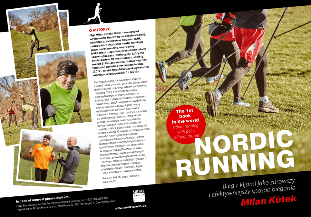 O AUTORZE – nauczyciel ůtek (1969) Mgr Milan K le średniej, znego w szko yc fiz ia an w wycho aniu RUN, opisma o bieg as cz or kt reda rdic runningu i instruktor no or at ag op pr Dawny unning.eu). (www.nordicr tatnich latach os w , – sprinter a lekkoatleta jny, który m acz rekreacy y st bi so aktywny bieg (o ów ie 10 maraton y swoim konc eatów nagrod ur la z n de Je ). 13 3: ds rd reko tion Awar letics Innova ic European Ath skiej w nord ze C i z Republik . 5) (2012), mistr + (201 tegorii M40 runningu w ka e o bieganiu żka na świeci Pier wsza ksią r za opisanie ły rok. Jej auto ca z ze pr i m z kija ył europejską runningu zdob ic rd no y od met runningu g z kijami do nagrodę. Bie im kolana tk ys zede wsz ż oszczędza pr ieczniejszy ni zp be i rowszy i w ko at i plecy, jest zd yd w mu zięki większe ą zwykły bieg. D og m i m mu bieg z kija energetyczne or towcy sp no w ró za ą wykorzyst ywać oby z nadwag ningu, jak i os tre h ac m ra r w a. Auto o odchudzani do skuteczneg mienie zu ro e w kże no przedstawia ta i (nordic chodu z kijam kondycyjnego naturalny niż y jest bardziej runwalk), któr iadczeniach O swoich dośw . ng ki al w ic nord alkiem ingiem i runw z nordic runn ób, w tym os h le znanyc opowiada wie scyplinach i w różnych dy reprezentanc specjaliści. lekarze i inni spor towych, oprócz dą Państwo, W książce znaj ównych o wyśnienia gł szczegółoweg ki nordic ni idłowej tech korzyści i praw stszych zę jc na e analizę runningu, takż st wa, dy bezpieczeń błędów, zasa kijami z ń ze ic ych ćw przykłady różn stania. y ich wykorzy i inne wariant color, 112 pages, full Size 174 x 240, many photos e contact: terest pleas 265 337 tel: +420 608 ar tpress.cz, sm ch Republic a@ ze C ov 6, an 00 Prague e-mail: form 0 á, 16 , ov 12 an a rm ov Olga Fo press.cz s. r. o., Velflík Smar t Press, www.smart Published by In case of in The 1st book in the world about running with poles all year round! C I D R NO G N I N RUN zd row s z y o k ja i m a ij k z Bieg ania g ie b b ó s o p s y i efekt y wniejsz Milan Kůtek 1 Nordic running jako specyficzna metoda biegania Nordic running to specyficzna metoda ruchu i treningu, którą można praktykować przez cały rok, dotrzymując podstawowych zasad stylu biegowego (praca ramion, pozycja tułowia i barków). Tym różni się od nordic walkingu i od używania teleskopowych kijków w trakcie długodystansowych i górskich zawodów biegowych (ultramaratony, skyrace itd.). Metoda nordic runningu może być wykorzystana również do wytrenowania prawidłowego stylu biegania u początkujących i do usunięcia najczęstszych błędów (nieprawidłowa pozycja tułowia i kierowanie łokci na boki). Nordic running jest porównaniu z nordic walkingiem zdecydowanie bardziej wyczerpujący fizycznie, dlatego do swoich przygotowań treningowych włączają go stopniowo także czołowi sportowcy wyczynowi. W odróżnieniu od biegu na nartach nie wymaga utrzymywanego śladu biegowego i może być uprawiany przez cały rok. www.nordicrunning.eu/specifics/ WIDEO – prawidłowa technika: www.nordicrunning.eu/technique-videos/ Niezbędnym warunkiem prawidłowego stosowania techniki nordic runningu są kije do runningu. Decydująca jest ich długość, kije muszą być dłuższe niż kijki do walkingu, ale krótsze niż kije do biegu na nartach techniką klasyczną. Kije do runningu są jednoczęściowe, mają gładką rękojeść i pasek rękawiczkowy, zakończenie stanowi walkingowy grot. W Republice Czeskiej te kije są już produkowane. 2 Nordic runwalk – inne rozumienie chodu kondycyjnego z kijami Osoby ze słabą kondycją nie radzą sobie ani z biegiem, ani z prawidłową techniką nordic walkingu. Bardziej odpowiednia jest dla nich odrębna technika chodu z kijami do runningu – nordic runwalk. Można go porównać do ”chodu rekreacyjnego” na nartach (bez wymaganego ślizgu nart) stylem klasycznym, tutaj jednak oczywiście bez nart. Mówiąc w sposób uproszczony: ramiona biegną, nogi idą (run-walk). Nordic runwalk jest bardziej naturalną formą ruchu niż nordic walking, poradzą sobie z nim nawet osoby z nadwagą. Nie wymaga wymachu ramienia i wypuszczania kijka z dłoni za ciałem. Dłuższe kije zapewniają także większą stabilność i odciążenie kręgosłupa, pomagają w utrzymaniu wyprostowanej pozycji tułowia („nie garbimy się”). Dzięki zaangażowaniu mięśni ramion, barków i tułowia chudniemy w czasie tego ruchu już przy bardzo niewielkiej prędkości. Technika nordic runwalk jest odpowiednia także dla osób, które chcą zacząć regularnie biegać, ponieważ w odróżnieniu od chodu przygotowuje je do wyższego wydatku energetycznego i biegowej pracy ramion. 3 4 Nagroda European Wyraźne Athletics zmniejszenie obciążenia stawów nóg Nordic running jest wyraźnie bardziej wymagający fizycznie niż zwykły bieg. Biegacz z kijami do runningu wykonuje bowiem większą pracę, ewent. zużywa znacząco więcej energii - docenią przede wszystkim sportowcy wyczynowi i dążący do osiągania jak najlepszych wyników. Stopniowo do swoich przygotowań kondycyjnych włączają go oprócz biegaczy także piłkarze, tenisiści, miotacze, szczypiorniści i inni. Z kijami do runningu regularnie trenuje również medalistka olimpijska i posiadaczka rekordu świata w rzucie oszczepem Barbora Spotakova (zob. obr.) Dlatego wydaje się dziwne, że ta bardzo skuteczna metoda treningowa prawie nie była dotychczas stosowana przez sportowców. Dowodem jest zwycięstwo naszej pracy Running with poles as an efficient training method eliminating overstraining of athlete’s feet w konkursie European Athletics Innovation Awards (2012). Obszerny artykuł o nordic runningu ukazał się także w prestiżowym czasopiśmie IAAF (Running with poles to increase training efficiency and reduce injuries, New Studies in Athletics 2/2014). Nordic running i runwalk są pod wieloma względami korzystne dla zdrowia