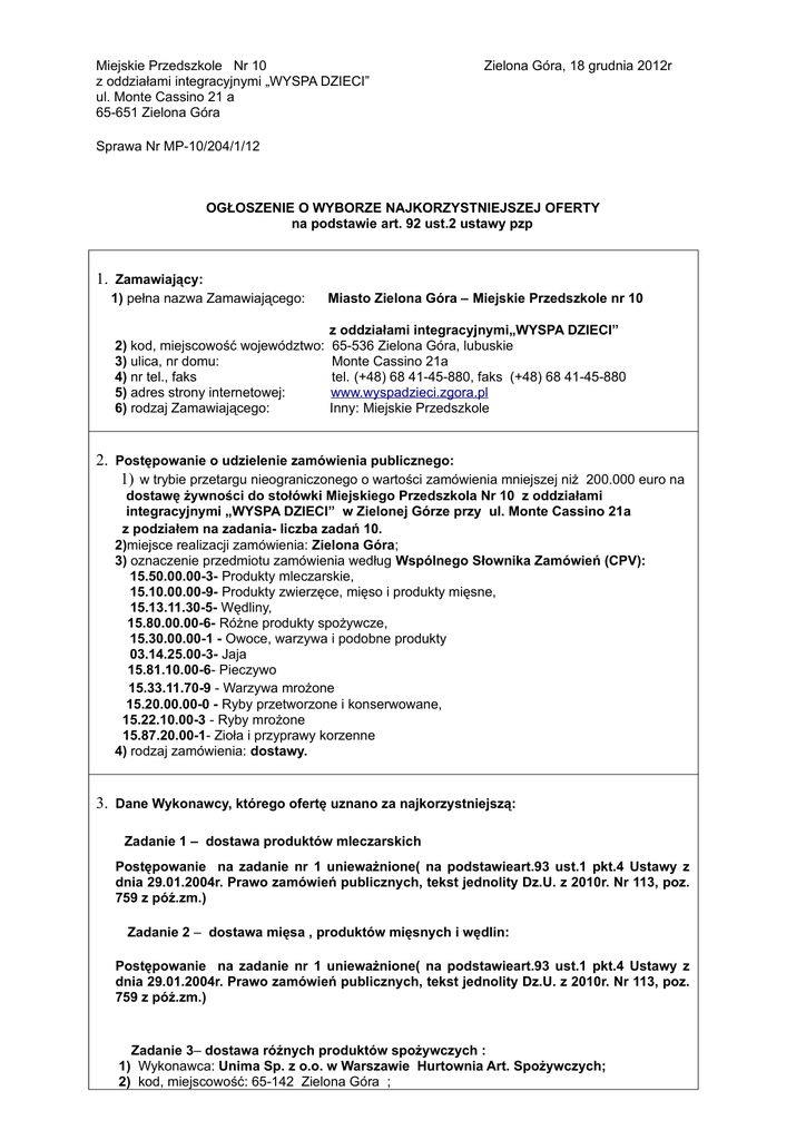 Miejskie Przedszkole Nr 10 z oddziałami integracyjnymi „WYSPA DZIECI” ul. Monte Cassino 21 a 65-651 Zielona Góra Zielona Góra, 18 grudnia 2012r Sprawa Nr MP-10/204/1/12 OGŁOSZENIE O WYBORZE NAJKORZYSTNIEJSZEJ OFERTY na podstawie art. 92 ust.2 ustawy pzp 1. Zamawiający: 1) pełna nazwa Zamawiającego: Miasto Zielona Góra – Miejskie Przedszkole nr 10 2) kod, miejscowość województwo: 3) ulica, nr domu: 4) nr tel., faks 5) adres strony internetowej: 6) rodzaj Zamawiającego: z oddziałami integracyjnymi„WYSPA DZIECI” 65-536 Zielona Góra, lubuskie Monte Cassino 21a tel. (+48) 68 41-45-880, faks (+48) 68 41-45-880 www.wyspadzieci.zgora.pl Inny: Miejskie Przedszkole 2. Postępowanie o udzielenie zamówienia publicznego: 1) w trybie przetargu nieograniczonego o wartości zamówienia mniejszej niż 200.000 euro na dostawę żywności do stołówki Miejskiego Przedszkola Nr 10 z oddziałami integracyjnymi „WYSPA DZIECI” w Zielonej Górze przy ul. Monte Cassino 21a z podziałem na zadania- liczba zadań 10. 2)miejsce realizacji zamówienia: Zielona Góra; 3) oznaczenie przedmiotu zamówienia według Wspólnego Słownika Zamówień (CPV): 15.50.00.00-3- Produkty mleczarskie, 15.10.00.00-9- Produkty zwierzęce, mięso i produkty mięsne, 15.13.11.30-5- Wędliny, 15.80.00.00-6- Różne produkty spożywcze, 15.30.00.00-1 - Owoce, warzywa i podobne produkty 03.14.25.00-3- Jaja 15.81.10.00-6- Pieczywo 15.33.11.70-9 - Warzywa mrożone 15.20.00.00-0 - Ryby przetworzone i konserwowane, 15.22.10.00-3 - Ryby mrożone 15.87.20.00-1- Zioła i przyprawy korzenne 4) rodzaj zamówienia: dostawy. 3. Dane Wykonawcy, którego ofertę uznano za najkorzystniejszą: Zadanie 1 – dostawa produktów mleczarskich Postępowanie na zadanie nr 1 unieważnione( na podstawieart.93 ust.1 pkt.4 Ustawy z dnia 29.01.2004r. Prawo zamówień publicznych, tekst jednolity Dz.U. z 2010r. Nr 113, poz. 759 z póź.zm.) Zadanie 2 – dostawa mięsa , produktów mięsnych i wędlin: Postępowanie na zadanie nr 1 unieważnione( na podstawieart.93 ust.1 pkt.4 Ustawy z dnia 29.01.2004r. Prawo zamówień publicznych, tekst jednolity Dz.U. z 2010r. Nr 113, poz. 759 z póź.zm.) Zadanie 3– dostawa różnych produktów spożywczych : 1) Wykonawca: Unima Sp. z o.o. w Warszawie Hurtownia Art. Spożywczych; 2) kod, miejscowość: 65-142 Zielona Góra ; 3) ulica, nr domu, nr pokoju: Zdrojowa 4; 4) cena wybranej oferty z VAT: 20.381,05 zł ; 5) ilość punktów przyznanych w kryterium :„cena ” – 100,00 pkt; 6) łączna ilość punktów: 100,00 pkt x 5 = 500,00 pkt; Zadanie 4 – dostawa owoców, warzyw : 1) Wykonawca: Firma Handlowo - Usługowa „JOKER” Patryk Musielak ; 2) kod, miejscowość: 65-559 Zielona Góra; 3) ulica, nr domu, nr pokoju: Okulickiego 31; 4) cena wybranej oferty z VAT: 31.742,98 zł; 5) ilość punktów przyznanych w kryterium :„cena ” – 100,00 pkt; 6) łączna ilość punktów: 100,00 pkt x 5 = 500,00 pkt; Zadanie 5 – dostawa jaj: 1) Wykonawca: Ferma Drobiu Kinga Firlej- Gąsiorowska; 2) kod, miejscowość: 67-106 Niedoradz; 3) ulica, nr domu, nr pokoju: Markiewiczowej 11; 4) cena wybranej oferty z VAT: 2.173,60 zł ; 5) ilość punktów przyznanych w kryterium :„cena ” – 100,00 pkt; 6) łączna ilość punktów: 100,00 pkt x 5 = 500,00 pkt Zadanie 6 – dostawa pieczywa: 1) Wykonawca: Zakład Piekarniczy s.c. „BARBARA” P.E.J. Delijewscy; 2) kod, miejscowość: 66-120 Kargowa; 3) ulica, nr domu, nr pokoju: Kościuszki 7; 4) cena wybranej oferty z VAT: 9.319,04 zł ; 5) ilość punktów przyznanych w kryterium :„cena ” – 100,00 pkt; 6) łączna ilość punktów: 100,00 pkt x 5 = 500,00 pkt Zadanie 7 – dostawa mrożonek warzywno-owocowych: 1) Wykonawca: Ice QB Spółka z ograniczoną odpowiedzialnością; 2) kod, miejscowość: 65-419 Zielona Góra; 3) ulica, nr domu, nr pokoju: gen J. Sowińskiego 2/4; 4) cena wybranej oferty z VAT: 4.601,44 zł ; 5) ilość punktów przyznanych w kryterium :„cena ” – 100,00 pkt; 6) łączna ilość punktów: 100,00 pkt x 5 = 500,00 pkt Zadanie 8 – dostawa ryb i przetworów rybnych: 1) Wykonawca: Przedsiębiorstwo Handlowe „VIMA” Sp. z o.o.; 2) kod, miejscowość: 66-015 Przylep ; 3) ulica, nr domu, nr pokoju: 22 lipca 86A; 4) cena wybranej oferty z VAT: 5.255,90 zł; 5) ilość punktów przyznanych w kryterium :„cena ” – 100,00 pkt; 6) łączna ilość punktów: 100,00 pkt x 5 = 500,00 pkt Zadanie 9 – dostawa przetworów: 1) Wykonawca: Unima Sp. z o.o. w Warszawie Hurtownia Art. Spożywczych; 2) kod, miejscowość: 65-142 Zielona Góra; 3) ulica, nr domu, nr pokoju: Zdrojowa 4; 4) cena wybranej oferty z VAT: 6.230,54 zł ; 5) ilość punktów przyznanych w kryterium :„cena ” – 100,00 pkt; 6) łączna ilość punktów: 100,00 pkt x 5 = 500,00 pkt Zadanie 10 – dostawa przypraw: Postępowanie na zadanie nr 1 unieważnione( na podstawieart.93 ust.1 pkt.4 Ustawy z dnia 29.01.2004r. Prawo zamówień publicznych, tekst jednolity Dz.U. z 2010r. Nr 113, poz. 759 z póź.zm.) 4. Uzasadnienie wyboru Wykonawcy: dla Zadania 1 2 Postępowanie na zadanie nr 1 unieważnione( na podstawieart.93 ust.1 pkt.4 Ustawy z dnia 29.01.2004r. Prawo zamówień publicznych, tekst jednolity Dz.U. z 2010r. Nr 113, poz. 759 z póź.zm.) z powodu niewystarczających środków na sfinansowanie zadania dla Zadania 2 Postępowanie na zadanie nr 1 unieważnione( na podstawieart.93 ust.1 pkt.4 Ustawy z dnia 29.01.2004r. Prawo zamówień publicznych, tekst jednolity Dz.U. z 2010r. Nr 113, poz. 759 z póź.zm.) z powodu niewystarczających środków na sfinansowanie zadania dla Zadania 3 Wykonawca spełnia warunki udziału w postępowaniu, a jego oferta jest zgodna z ustawą z dnia 29 stycznia 2004 r. Prawo zamówień publicznych (tekst jednolity Dz. U. z 2010 r. Nr 113, poz. 759 z późn. zm.) i Specyfikacją Istotnych Warunków Zamówienia oraz jest najkorzystniejsza i otrzymała najwyższą liczbę punktów tj.500,00 (100,00 x5) w oparciu o kry