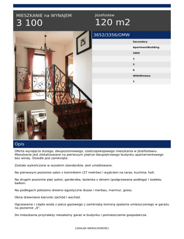 Józefosław MIESZKANIE na WYNAJEM 120 m2 3 100 3652/3356/OMW Secondary ApartmentBuilding 2005 1 2 6 WithWindow 1 Opis Oferta wynajęcia dużego, dwupoziomowego, sześciopokojowego mieszkania w Józefosławiu. Mieszkanie jest zlokalizowane na pierwszym piętrze dwupiętrowego budynku apartamentowego bez windy. Osiedle jest zamknięte. Zostało wykończone w wysokim standardzie. Jest umeblowane. Na pierwszym poziomie salon z kominkiem (27 metrów) i wyjściem na taras, kuchnia, holl. Na drugim poziomie pięć pokoi, garderoba, łazienka z oknem (podgrzewana podłoga) i toaleta; balkon. Na podłogach położono drewno egzotyczne dusse i merbau, marmur, gress. Okna drewniane kierunki zachód i wschód. Ogrzewanie i ciepła woda z pieca gazowego z zamkniętą komorą spalania umieszczonego w garażu na poziomie „0”. Do mieszkania przynależy niezależny garaż w budynku i pomieszczenie gospodarcze. LOKALNA NIERUCHOMOŚCI W pobliżu szkoła, przedszkola, centra handlowe i rekreacyjne, komunikacja autobusowa, Las Kabacki. Czynsz 3.100 zł Kaucja 3.100 zł W swojej ofercie posiadamy wiele podobnych ofert. Prowadzimy pełną, bezpłatną obsługę związaną z uzyskaniem kredytów bankowych na zakup nieruchomości. W celu nawiązania współpracy bardzo prosimy o kontakt. Zapraszamy do kontaktu telefonicznego - dyżur 7 dni w tygodniu do 22.00 pod numerem telefonu agenta prowadzącego i pod numerem 515-500-000. Niniejsza oferta jest informacją handlową i nie może być uznawana za ofertę w rozumieniu art. 66 ustęp 1 Kodeksu Cywilnego. Wojciech Raducha tel. 515-200-004 tel. 22 702 55 55 email: [email protected] LOKALNA NIERUCHOMOŚCI Powered by TCPDF (www.tcpdf.org)