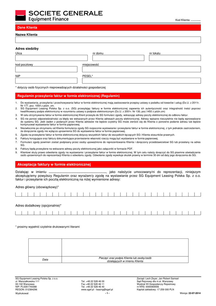 Kod Klienta: ……….. Dane Klienta Nazwa Klienta Adres siedziby Ulica nr domu kod pocztowy miejscowość NIP PESEL* nr lokalu * dotyczy osób fizycznych nieprowadzących działalności gospodarczej Regulamin przesyłania faktur w formie elektronicznej (Regulamin) 1. 2. 3. 4. 4. 5. 6. 7. 8. 9. Do wystawiania, przesyłania i przechowywania faktur w formie elektronicznej mają zastosowanie przepisy ustawy o podatku od towarów i usług (Dz.U. z 2011r. Nr 177, poz. 1054 z późn. zm. SG Equipment Leasing Polska Sp. z o.o. (SG) przesyłając faktury w formie elektronicznej zapewnia ich autentyczność oraz integralność treści poprzez kwalifikowany podpis elektroniczny w rozumieniu ustawy o podpisie elektronicznym (Dz.U. z 2001r. Nr 130, poz.1450 z późn.zm) W celu otrzymywania faktur w formie elektronicznej Klient przesyła do SG formularz zgody, wskazując adresy poczty elektronicznej do odbioru faktur. SG nie ponosi odpowiedzialności za błędy we wskazanych przez Klienta adresach poczty elektronicznej. Adresy wpisane nieczytelnie nie będą wprowadzane do systemu SG. Jeśli żaden z podanych przez Klienta adresów nie będzie czytelny SG może zwrócić się do Klienta o ponowne podanie adresu lub będzie kontynuował wystawianie faktur w formie papierowej. Niezwłocznie po otrzymaniu od Klienta formularza zgody SG rozpocznie wystawianie i przesyłanie faktur w formie elektronicznej, z tym jednakże zastrzeżeniem, że doręczenie zgody nie wyłącza uprawnienia SG do wystawienia faktur w formie papierowej. Zgoda na przesyłanie faktur w formie elektronicznej dotyczy wszystkich faktur do wszystkich łączących SG i Klienta stosunków prawnych. Faktury korygujące oraz faktury dokumentujące przeniesienie własność rzeczy mogą być wystawiane w formie papierowej. Formularz zgody powinien zostać podpisany przez osoby upoważnione do reprezentowania Klienta i doręczony przedstawicielowi SG lub przesłany na adres SG. Faktury będą przesyłane na wskazane adresy poczty elektronicznej jako załączniki w formacie PDF. Klientowi służy prawo odwołania zgody na wystawianie i przesyłanie faktur w formie elektronicznej. W tym celu należy doręczyć do SG pisemne oświadczenie osób uprawnionych do reprezentacji Klienta o odwołaniu zgody. Odwołanie zgody wywołuje skutek prawny w terminie 30 dni od daty jego doręczenia do SG. Akceptacja faktury w formie elektronicznej Działając w imieniu …………………………………………….., jako należycie umocowany/ni do reprezentacji, niniejszym akceptuję/emy powyższy Regulamin oraz wyrażam/y zgodę na wystawianie przez SG Equipment Leasing Polska Sp. z o.o. faktur i przesyłanie ich pocztą elektroniczną na niżej wymienione adresy: Adres główny (obowiązkowy)* Adres dodatkowy (opcjonalnie)* * prosimy wypełnić czytelnie drukowanymi literami Data SG Equipment Leasing Polska Sp. z o.o. ul. Marszałkowska 111 00-102 Warszawa NIP: PL5261740388 REGON: 012384296 Wydrukował: Pieczęć oraz podpis Klienta lub osoby/osób działających w imieniu Klienta Tel. +48 22 528 46 00 Fax +48 22 528 46 11 Tel. +48 22 528 46 40 www.sgef.pl - [email protected] -1- Zarząd: Lech Zeyer, Jan Robert Samsel Sąd Rejonowy dla m.st. Warszawy Wydział XII Gospodarczy Rejestrowy nr KRS: 0000069556 Kapitał zakładowy: 17 259 000 PLN Wersja: 22-07-2014