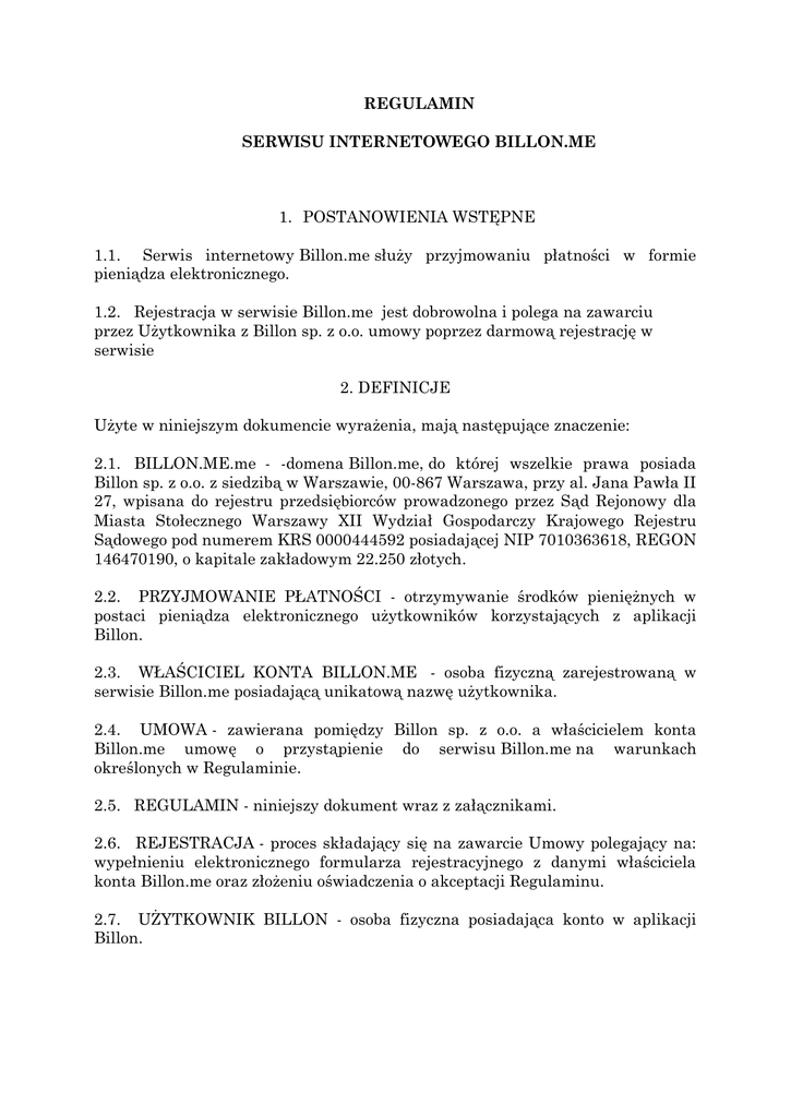 REGULAMIN SERWISU INTERNETOWEGO BILLON.ME 1. POSTANOWIENIA WSTĘPNE 1.1. Serwis internetowy Billon.me służy przyjmowaniu płatności w formie pieniądza elektronicznego. 1.2. Rejestracja w serwisie Billon.me jest dobrowolna i polega na zawarciu przez Użytkownika z Billon sp. z o.o. umowy poprzez darmową rejestrację w serwisie 2. DEFINICJE Użyte w niniejszym dokumencie wyrażenia, mają następujące znaczenie: 2.1. BILLON.ME.me - -domena Billon.me, do której wszelkie prawa posiada Billon sp. z o.o. z siedzibą w Warszawie, 00-867 Warszawa, przy al. Jana Pawła II 27, wpisana do rejestru przedsiębiorców prowadzonego przez Sąd Rejonowy dla Miasta Stołecznego Warszawy XII Wydział Gospodarczy Krajowego Rejestru Sądowego pod numerem KRS 0000444592 posiadającej NIP 7010363618, REGON 146470190, o kapitale zakładowym 22.250 złotych. 2.2. PRZYJMOWANIE PŁATNOŚCI - otrzymywanie środków pieniężnych w postaci pieniądza elektronicznego użytkowników korzystających z aplikacji Billon. 2.3. WŁAŚCICIEL KONTA BILLON.ME - osoba fizyczną zarejestrowaną w serwisie Billon.me posiadającą unikatową nazwę użytkownika. 2.4. UMOWA - zawierana pomiędzy Billon sp. z o.o. a właścicielem konta Billon.me umowę o przystąpienie do serwisu Billon.me na warunkach określonych w Regulaminie. 2.5. REGULAMIN - niniejszy dokument wraz z załącznikami. 2.6. REJESTRACJA - proces składający się na zawarcie Umowy polegający na: wypełnieniu elektronicznego formularza rejestracyjnego z danymi właściciela konta Billon.me oraz złożeniu oświadczenia o akceptacji Regulaminu. 2.7. UŻYTKOWNIK BILLON - osoba fizyczna posiadająca konto w aplikacji Billon. 2.8. SALDO –środki zgromadzone przez właściciela konta Billon.me, otrzymane od użytkowników aplikacji Billon po odjęciu prowizji pobranej przez Billon sp. z o.o. w Warszawie. 2.9. STRONA INTERNETOWA WŁAŚCICIEL KONTA BILLON.ME udostępniona przez Billon sp. z o.o. w Warszawie stronę internetową, która służy do dokonywania płatności na rzecz właściciela konta Billon.me przez użytkowników Billon. 3. REGULAMIN 3.1. Billon sp. z o.o. w Warszawie działa na zasadach określonych ustawie oraz w niniejszym Regulaminie. 3.2. Regulamin dostępny jest w postaci internetowym: URL Billon.me/regulamin.html. elektronicznej pod adresem 3.3. Billon sp. z o.o. w Warszawie udostępnia Regulamin przed zawarciem Umowy oraz umożliwia do niego dostęp przez cały okres obowiązywania Umowy w taki sposób, aby istniała możliwość jego przechowywania i odtwarzania w zwykłym toku czynności. 3.4. O każdej zmianie postanowień Regulaminu Właściciel konta Billon.me zostanie powiadomiony w drodze informacji przesłanej na adres poczty elektronicznej, wskazany w formularzu rejestracyjnym, a także przy logowaniu do Konta Właściciela konta Billon.me. Równocześnie zmieniony Regulamin zostanie opublikowany na stronie internetowehh Billon.me, o której mowapowyżej . 3.5. Zmiany Regulaminu wchodzą w życie w terminie 30 dni od ich ogłoszenia na stronie internetowej o której mowa powyżej. 3.6. Brak wypowiedzenia przez Właściciela Konata Billon.me. Umowy w terminie 14 dni od dnia ogłoszenia zmiany Regulaminu oznacza akceptację nowego Regulaminu. 4. ZAWARCIE UMOWY 4.1. Warunkiem uczestnictwa w serwisie Billon.me jest dokonanie Rejestracji. 4.2. Formularz Rejestracyjny internetowym: URL Billon.me/sign-up jest dostępny pod adresem 4.3. Umowę uważa się zawartą z chwilą otrzymania przez Właściciela Konta Billon.me wiadomości elektronicznej od serwisu Billon.me o poprawnym zakończeniu procesu rejestracji. 4.4. Dokonując Rejestracji Właściciela Konta Billon.me wyraża zgodę na: 4.4.1. otrzymywanie na adres poczty elektronicznej Właściciela Konta Billon.me informacji dotyczących Billon.me; 4.4.2. otrzymywanie na adres poczty elektronicznej Właściciela Konta Billon.me informacji handlowych w rozumieniu ustawy o świadczeniu usług drogą elektroniczną; 4.4.3. przetwarzanie przez BILLON sp. z o.o. w Warszawie danych osobowych objętych Formularzem Rejestracyjnym. 4.5. Billon sp. z o.o. w Warszawie uprawniona jest do zażądania od Właściciela Konta Billon.me dodatkowych dokumentów potwierdzających w szczególności jego wiek, status oraz dane teleadresowe. Brak zastosowania się przez Właściciela konta Billon.me do wezwania uprawnia Billon sp. z o.o. w Warszawie do zawieszenia udziału w serwisie internetowym Billon.me. Negatywna weryfikacja danych uprawnia do rozwiązania przez Billon sp. z o.o. w Warszawie Umowy ze skutkiem natychmiastowym. 5. PRAWA, OBOWIĄZKI I ODPOWIEDZIALNOŚĆ BILLON SP. Z O.O. W WARSZAWIE 5.1. Billon sp. z o.o. w Warszawie udostępnia Właścicielowi Konta Billon.me technologię oraz niezbędne informacje do prawidłowego działania usługi. 5.2. Billon sp. z o.o. w Warszawie nie ponosi odpowiedzialności za: 5.2.1. szkody powstałe w wyniku działania lub zaniechania osób trzecich, za które nie odpowiada, 5.2.2. wadliwe działanie urządzeń lub systemów (np. teleinformatycznych), 5.2.3. działanie siły wyższej lub innych czynników niezależnych od Billon sp. z o.o. w Warszawie, 5.2.4. działania lub zaniechania Użytkowników, w tym wysyłane przez nich oferty oraz świadczone usługi, 5.2.5. nieosiągnięcie przez Właściciela Konta Billon.me zakładanych zysków z tytułu uczestnictwa w Billon.me, 5.3. Billon sp. z o.o. w Warszawie uprawniona jest do rozwiązania Umowy ze skutkiem natychmiastowym w przypadku podejmowania przez Właściciela Konta Billon.me czynności naruszających przepisy prawa, dobre obyczaje, interesy Billon sp. z o.o. w Warszawie BILLON sp. z o.o. lub osób trzecich, a także w przypadku podejmowania działań lub występowania treści o których mowa w załączniku nr 1 do Regulaminu. 5.4. Billon sp. z o.o. w Warszawie dokonywać będzie aktualizacji Usług i podejmować działania zmierzające do aktualizacji kodów na Stronach Internetowych Właściciela kon