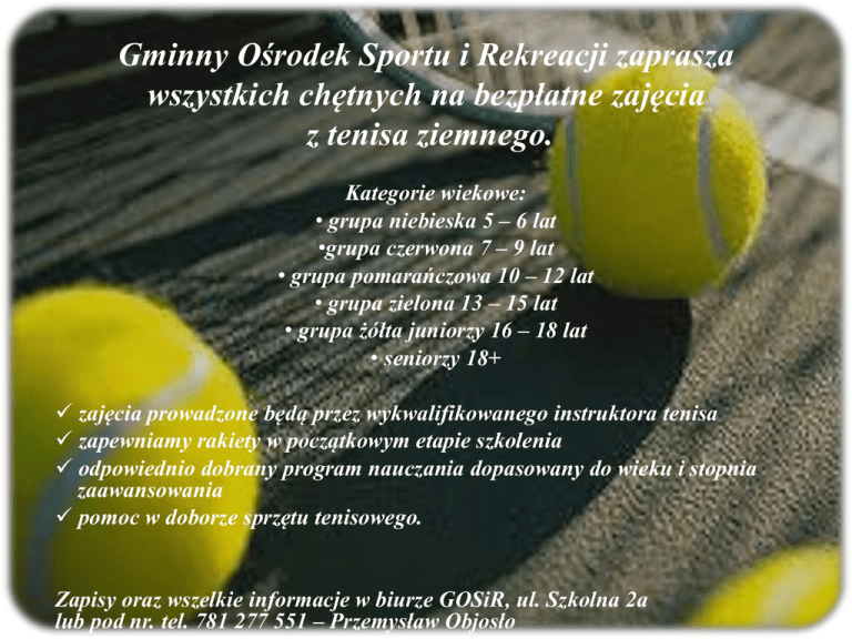 Gminny Ośrodek Sportu i Rekreacji zaprasza wszystkich chętnych na bezpłatne zajęcia z tenisa ziemnego. Kategorie wiekowe: • grupa niebieska 5 – 6 lat •grupa czerwona 7 – 9 lat • grupa pomarańczowa 10 – 12 lat • grupa zielona 13 – 15 lat • grupa żółta juniorzy 16 – 18 lat • seniorzy 18+ zajęcia prowadzone będą przez wykwalifikowanego instruktora tenisa zapewniamy rakiety w początkowym etapie szkolenia odpowiednio dobrany program nauczania dopasowany do wieku i stopnia zaawansowania pomoc w doborze sprzętu tenisowego. Zapisy oraz wszelkie informacje w biurze GOSiR, ul. Szkolna 2a lub pod nr. tel. 781 277 551 – Przemysław Objosło