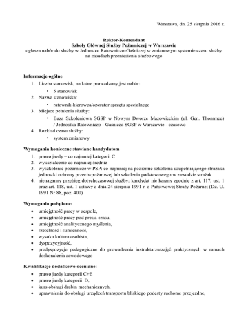 Warszawa, dn. 25 sierpnia 2016 r. Rektor-Komendant Szkoły Głównej Służby Pożarniczej w Warszawie ogłasza nabór do służby w Jednostce Ratowniczo-Gaśniczej w zmianowym systemie czasu służby na zasadach przeniesienia służbowego Informacje ogólne 1. Liczba stanowisk, na które prowadzony jest nabór: ▪ 5 stanowisk 2. Nazwa stanowiska: ▪ ratownik-kierowca/operator sprzętu specjalnego 3. Miejsce pełnienia służby: ▪ Baza Szkoleniowa SGSP w Nowym Dworze Mazowieckim (ul. Gen. Thommee) / Jednostka Ratowniczo - Gaśnicza SGSP w Warszawie - czasowo 4. Rozkład czasu służby: ▪ system zmianowy Wymagania konieczne stawiane kandydatom 1. prawo jazdy – co najmniej kategorii C 2. wykształcenie co najmniej średnie 3. wyszkolenie pożarnicze w PSP: co najmniej na poziomie szkolenia uzupełniającego strażaka jednostki ochrony przeciwpożarowej lub szkolenia podstawowego w zawodzie strażak 4. nienaganny przebieg dotychczasowej służby: kandydat nie karany zgodnie z art. 117, ust. 1 oraz art. 118, ust. 1 ustawy z dnia 24 sierpnia 1991 r. o Państwowej Straży Pożarnej (Dz. U. 1991 Nr 88, poz. 400) Wymagania pożądane: umiejętność pracy w zespole, umiejętność pracy pod presją czasu, umiejętność analitycznego myślenia, rzetelność i sumienność, wysoka kultura osobista, dyspozycyjność, predyspozycje pedagogiczne do prowadzenia instruktarzu/zajęć praktycznych w ramach doskonalenia zawodowego Kwalifikacje dodatkowo oceniane: prawo jazdy kategorii C+E prawo jazdy kategorii D, kurs obsługi drabin mechanicznych, uprawnienia do obsługi urządzeń transportu bliskiego podesty ruchome przejezdne, uprawnienia UDT do konserwacji urządzeń transportu bliskiego, uprawnienia do obsługi żurawi przenośnych (przeładunkowych), ukończony kurs operatora koparko-ładowarek, uprawnienia do obsługi wózków widłowych (jezdniowych), uprawnienia do wykonywania zawodu ratownika medycznego, o których mowa w art. 10 ustawy z dnia 8 września 2006 r. o Państwowym Ratownictwie Medycznym (Dz. U. 2006 Nr 191, poz. 1410, z późniejszymi zmianami), tytuł młodszego ratownika wysokościowego KSRG lub ratownika wysokościowego KSRG, uprawnienia młodszego nurka MSW lub płetwonurka wydane przez CMAS lub PADI, patent sternika motorowodnego, patent żeglarski Stermotorzysty Żeglugi Śródlądowej, wydany przez Urząd Żeglugi Śródlądowej, kurs pedagogiczny nauczyciela praktycznej nauki zawodu, uprawnienia SEP na stanowisku eksploatacji urządzeń, instalacji i sieci elektroenergetycznych o napięciu do 1 kV, uprawnienia do napełniania zbiorników przenośnych gazami sprężonymi (powietrze) Wymagane dokumenty: 1. Raport o przyjęcie do służby w Szkole Głównej Służby Pożarniczej. 2. CV (uwzględniające przebieg pracy i służby). 3. Kserokopie dokumentów potwierdzających posiadanie wymaganego wykształcenia oraz ukończenie ww. kursów i szkoleń, a także posiadanie odpowiednich umiejętności. 4. Kserokopia zaświadczenia potwierdzającego aktualne badania lekarskie, stwierdzające zdolność do prawidłowego wykonywania obowiązków służbowych na zajmowanym dotychczas stanowisku. 5. Kserokopia indywidualnej karty oceny sprawności fizycznej z wynikami testu sprawności strażaka w 2015 r. lub 2016 r. 6. Zgoda przełożonego dotycząca możliwości ubiegania się o przeniesienie służbowe. 7. Oświadczenie dotyczące zgody na przetwarzanie danych osobowych niezbędnych do realizacji procesu postępowania kwalifikacyjnego, zgodnie z załącznikiem do niniejszego ogłoszenia. 8. Oświadczenie o nienagannym przebiegu służby zgodnie z załącznikiem do niniejszego ogłoszenia. Etapy przeprowadzenia naboru: Nabór do służby odbywać się będzie w dwóch etapach. Etap I - Ocena kandydata na podstawie przedłożonych dokumentów Komisja dokonuje przeglądu i sprawdzenia kompletności dokumentów złożonych przez kandydata, a także oceny dokumentów dotyczących posiadanego wykształcenia i kwalifikacji. O wynikach pierwszego etapu wybrani kandydaci zostaną poinformowani telefonicznie. Dostępna będzie również informacja na stronie internetowej oraz w siedzibie SGSP. Etap II – Rozmowa kwalifikacyjna Po zakwalifikowaniu przez komisję kandydata do etapu drugiego, kandydat zostanie poinformowany o terminie i miejscu przeprowadzenia rozmowy kwalifikacyjnej. W trakcie rozmowy kwalifikacyjnej ocenie będzie podlegać w szczególności motywacja kandydata do podjęcia służby w SGSP, komunikatywność, społeczna postawa wobec ludzi, spełnienie kryteriów branych pod uwagę przy okresowym opiniowaniu służbowym. Przed rozpoczęciem rozmowy kwalifikacyjnej kandydat okazuje dokument potwierdzający jego tożsamość. Po drugim etapie naboru wyłania się najlepszych kandydatów do służby w SGSP. Termin złożenia dokumentów: do 30 września 2016 r. Planowany termin przyjęcia do służby: 1 listopad 2016 r. Miejsce złożenia dokumentów: Komplet dokumentów w zamkniętej kopercie należy złożyć w Dziale Kadr i Organizacji SGSP, osobiście lub drogą pocztową (decyduje data wpływu i zarejestrowania, a nie data stempla pocztowego) na adres: Szkoła Główna Służby Pożarniczej - KADRY ul. Słowackiego 52/54 01-629 Warszawa te. kont. 22 56 17 665 Niezależnie od sposobu dostarczenia dokumentów, kopertę należy opisać podając imię i nazwisko, adres zamieszkania oraz dopisek „Nabór do służby w JRG SGSP”. Informacje dodatkowe: Jeżeli w ciągu 12 miesięcy od dnia zakończenia postępowania kwalifikacyjnego zaistnieje potrzeba obsadzenia kolejnego stanowiska w SGSP, Rektor-Komendant może podjąć decyzję o zatrudnieniu osoby spośród najlepszych kandydatów wymienionych w protokole z postępowania kwalifikacyjnego.
