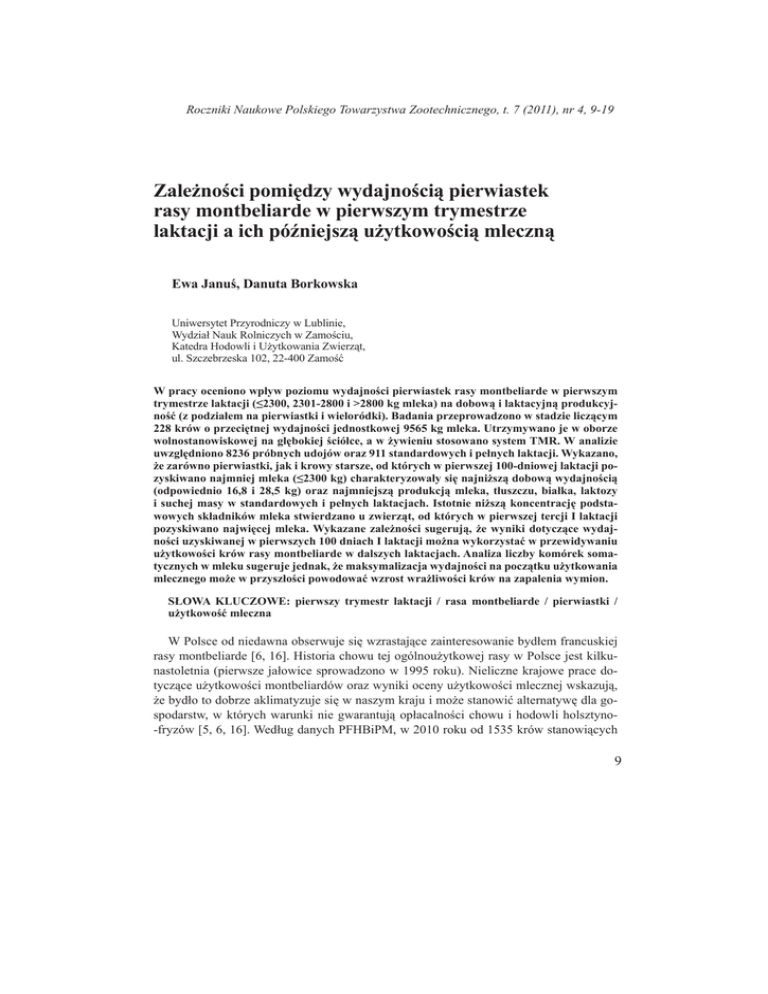 Roczniki Naukowe Polskiego Towarzystwa Zootechnicznego, t. 7 (2011), nr 4, 9-19 Zależności pomiędzy wydajnością pierwiastek rasy montbeliarde w pierwszym trymestrze laktacji a ich późniejszą użytkowością mleczną Ewa Januś, Danuta Borkowska Uniwersytet Przyrodniczy w Lublinie, Wydział Nauk Rolniczych w Zamościu, Katedra Hodowli i Użytkowania Zwierząt, ul. Szczebrzeska 102, 22-400 Zamość W pracy oceniono wpływ poziomu wydajności pierwiastek rasy montbeliarde w pierwszym trymestrze laktacji (≤2300, 2301-2800 i >2800 kg mleka) na dobową i laktacyjną produkcyjność (z podziałem na pierwiastki i wieloródki). Badania przeprowadzono w stadzie liczącym 228 krów o przeciętnej wydajności jednostkowej 9565 kg mleka. Utrzymywano je w oborze wolnostanowiskowej na głębokiej ściółce, a w żywieniu stosowano system TMR. W analizie uwzględniono 8236 próbnych udojów oraz 911 standardowych i pełnych laktacji. Wykazano, że zarówno pierwiastki, jak i krowy starsze, od których w pierwszej 100-dniowej laktacji pozyskiwano najmniej mleka (≤2300 kg) charakteryzowały się najniższą dobową wydajnością (odpowiednio 16,8 i 28,5 kg) oraz najmniejszą produkcją mleka, tłuszczu, białka, laktozy i suchej masy w standardowych i pełnych laktacjach. Istotnie niższą koncentrację podstawowych składników mleka stwierdzano u zwierząt, od których w pierwszej tercji I laktacji pozyskiwano najwięcej mleka. Wykazane zależności sugerują, że wyniki dotyczące wydajności uzyskiwanej w pierwszych 100 dniach I laktacji można wykorzystać w przewidywaniu użytkowości krów rasy montbeliarde w dalszych laktacjach. Analiza liczby komórek somatycznych w mleku sugeruje jednak, że maksymalizacja wydajności na początku użytkowania mlecznego może w przyszłości powodować wzrost wrażliwości krów na zapalenia wymion. SŁOWA KLUCZOWE: pierwszy trymestr laktacji / rasa montbeliarde / pierwiastki / użytkowość mleczna W Polsce od niedawna obserwuje się wzrastające zainteresowanie bydłem francuskiej rasy montbeliarde [6, 16]. Historia chowu tej ogólnoużytkowej rasy w Polsce jest kilkunastoletnia (pierwsze jałowice sprowadzono w 1995 roku). Nieliczne krajowe prace dotyczące użytkowości montbeliardów oraz wyniki oceny użytkowości mlecznej wskazują, że bydło to dobrze aklimatyzuje się w naszym kraju i może stanowić alternatywę dla gospodarstw, w których warunki nie gwarantują opłacalności chowu i hodowli holsztyno-fryzów [5, 6, 16]. Według danych PFHBiPM, w 2010 roku od 1535 krów stanowiących 9 E. Januś i D. Borkowska populację aktywną pozyskiwano średnio 7291 kg mleka, zawierającego 4,04% tłuszczu i 3,49% białka. W porównaniu z rokiem poprzednim liczba krów pod oceną zwiększyła się o 223 sztuki, a wydajność mleka wzrosła o 166 kg [10, 11]. W związku ze zwiększaniem się w Polsce populacji bydła montbeliarde, istotne wydaje się podjęcie badań dotyczących różnych aspektów użytkowości tej rasy. Celem pracy była ocena zależności pomiędzy wydajnością pierwiastek rasy montbeliarde w pierwszym trymestrze laktacji a ich użytkowością mleczną w pierwszej i dalszych laktacjach. Materiał i metody Materiały do pracy zebrano w gospodarstwie, w którym w 2010 roku utrzymywano 228 krów rasy montbeliarde o przeciętnej wydajności jednostkowej 9565 kg mleka. Utrzymywano je w oborze wolnostanowiskowej na głębokiej ściółce, a w żywieniu stosowano system TMR. W zależności od stadium po wycieleniu, stanu fizjologicznego oraz dobowej wydajności mleka, krowy przydzielone były do 6 grup technologicznych. Dój odbywał się dwukrotnie w ciągu doby, w hali udojowej typu „bok w bok” (2 x 8). Dane stanowiące podstawę opracowania uzyskano z raportów wynikowych RW-2 oceny użytkowości mlecznej krów prowadzonej metodą AT4. Były to wyniki 8236 próbnych udojów (w tym 3335 wykonanych u pierwiastek i 4901 u wieloródek), przeprowadzonych od marca 2006 r. do marca 2011 r. W badaniach uwzględniono wydajność dobową (była ona podstawą do wykreślenia krzywych laktacji), zawartość tłuszczu, białka, laktozy i suchej masy oraz liczbę komórek somatycznych (dla cechy tej dokonano transformacji na logarytm naturalny). Zebrano także dane dotyczące produkcyjności w 911 standardowych i w pełnych laktacjach (260 u pierwiastek i 651 u wieloródek). W obliczeniach uwzględniono wpływ wydajności w pierwszych 100 dniach I laktacji na dobową i laktacyjną produkcyjność pierwiastek i wieloródek. W jednoczynnikowej analizie wariancji, wykonanej przy użyciu pakietu SAS (procedura GLM), wyróżniono 3 przedziały wydajności za pierwszy trymestr pierwszej laktacji. Do grupy o najniższej użytkowości zaliczono 52 krowy, które w pierwszym trymestrze po pierwszym wycieleniu produkowały do 2300 kg mleka. Drugą grupę stanowiło 100 krów o wydajności mleka w tym okresie w granicach 2301-2800 kg, a trzecią – 108 krów o produkcyjności przekraczającej 2800 kg. Istotność wpływu wydajności pierwiastek w pierwszym trymestrze po wycieleniu na wartość analizowanych cech oszacowano testem Duncana. Wyniki i dyskusja Pierwiastki, w porównaniu z wieloródkami charakteryzowały się niższą o 9,6 kg dobową wydajnością mleka, które zawierało więcej tłuszczu (o 0,07%), laktozy (o 0,08%) i suchej masy (o 0,10%), a mniej białka (o 0,03%) – tabela 1. Wydajność w I tercji I laktacji istotnie różnicowała dobową wydajność mleka pierwiastek, zawartość w nim tłuszczu i suchej masy, a w mniejszym stopniu zawartość białka, natomiast w przypadku wieloródek istotne (P≤0,01) różnice obserwowano z reguły pomiędzy krowami o najwyższej produkcyjności (>2800 kg) a pozostałymi. 10 ≤2300 2301-2800 >2800 4901 979 1986 1936 3335 628 1300 1407 ≤2300 2301-2800 >2800 31,1 28,7A 31,6B 31,8B 21,5 16,8A 19,9B 25,1C Dobowa wydajność mleka (kg) Daily milk yield (kg) 3,68 3,71A 3,70A 3,64B 4,18ABa 4,19A