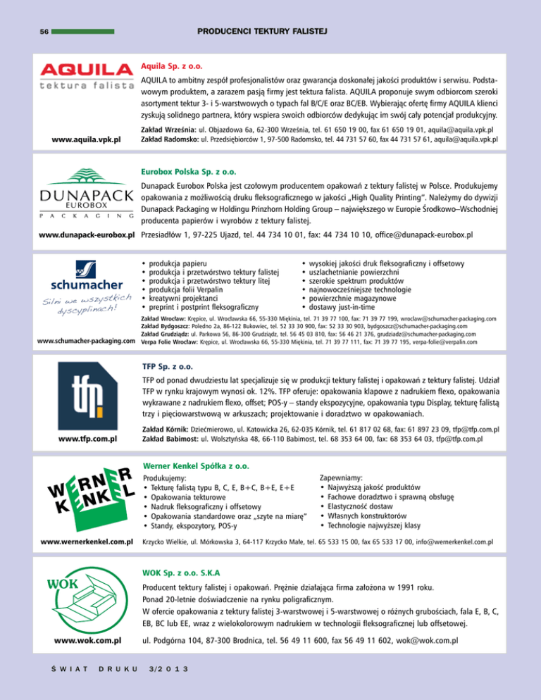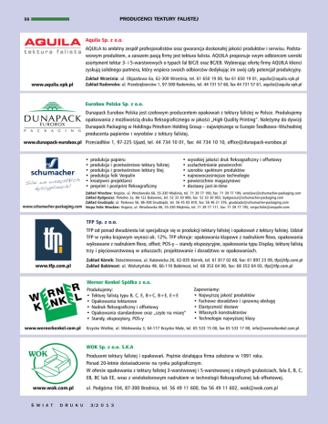 M A I N 56 T O P IproducenCI C S N E W tektury S falistej Aquila Sp. z o.o. AQUILA to ambitny zespół profesjonalistów oraz gwarancja doskonałej jakości produktów i serwisu. Podstawowym produktem, a zarazem pasją firmy jest tektura falista. AQUILA proponuje swym odbiorcom szeroki asortyment tektur 3- i 5-warstwowych o typach fal B/C/E oraz BC/EB. Wybierając ofertę firmy AQUILA klienci zyskują solidnego partnera, który wspiera swoich odbiorców dedykując im swój cały potencjał produkcyjny. www.aquila.vpk.pl Zakład Września: ul. Objazdowa 6a, 62-300 Września, tel. 61 650 19 00, fax 61 650 19 01, [email protected] Zakład Radomsko: ul. Przedsiębiorców 1, 97-500 Radomsko, tel. 44 731 57 60, fax 44 731 57 61, [email protected] Eurobox Polska Sp. z o.o. Dunapack Eurobox Polska jest czołowym producentem opakowań z tektury falistej w Polsce. Produkujemy opakowania z możliwością druku fleksograficznego w jakości „High Quality Printing”. Należymy do dywizji Dunapack Packaging w Holdingu Prinzhorn Holding Group – największego w Europie Środkowo–Wschodniej producenta papierów i wyrobów z tektury falistej. www.dunapack-eurobox.pl Przesiadłów 1, 97-225 Ujazd, tel. 44 734 10 01, fax: 44 734 10 10, [email protected] • produkcja papieru • produkcja i przetwórstwo tektury falistej • produkcja i przetwórstwo tektury litej • produkcja folii Verpalin • kreatywni projektanci • preprint i postprint fleksograficzny • wysokiej jakości druk fleksograficzny i offsetowy • uszlachetnianie powierzchni • szerokie spektrum produktów • najnowocześniejsze technologie • powierzchnie magazynowe • dostawy just-in-time Zakład Wrocław: Krępice, ul. Wrocławska 66, 55-330 Miękinia, tel. 71 39 77 100, fax: 71 39 77 199, [email protected] Zakład Bydgoszcz: Poledno 2a, 86-122 Bukowiec, tel. 52 33 30 900, fax: 52 33 30 903, [email protected] Zakład Grudziądz: ul. Parkowa 56, 86-300 Grudziądz, tel. 56 45 03 810, fax: 56 46 21 376, [email protected] www.schumacher-packaging.com Verpa Folie Wrocław: Krępice, ul. Wrocławska 66, 55-330 Miękinia, tel. 71 39 77 111, fax: 71 39 77 195, [email protected] TFP Sp. Sp. zz o.o. o.o. TFP TFP od od ponad ponad dwudziestu dwudziestu lat lat specjalizuje specjalizuje się się w w produkcji produkcji tektury tektury falistej falistej ii opakowań opakowań zz tektury tektury falistej. falistej. Udział TFP TFP TFP w w rynku rynku krajowym krajowym wynosi wynosi ok. ok. 12%. 12%. TFP TFP oferuje: oferuje: opakowania opakowania klapowe klapowe zz nadrukiem nadrukiem flexo, flexo, opakowania opakowania wykrawane wykrawane zz nadrukiem nadrukiem flexo, flexo, offset; offset; POS’y POS-y -–standy standyekspozycyjne, ekspozycyjne,opakowania opakowania typu typu Display, Display, tekturę tekturę falistą falistą trzy trzy ii pięciowarstwową pięciowarstwową w w arkuszach; arkuszach; projektowanie projektowanie ii doradztwo doradztwo w w opakowaniach. opakowaniach. www.tfp.com.pl Zakład Kórnik: Dziećmierowo, ul. Katowicka 26, 62-035 Kórnik, tel. 61 817 02 68, fax: 61 897 23 09, [email protected] ZakładBabimost: Kórnik: Dziećmierowo, ul. 48, Katowicka 62-035 tel. Kórnik, tel. 61 02 68, 09, [email protected] Zakład ul. Wolsztyńska 66-11026, Babimost, 68 353 64 817 00, fax: 68 fax: 35361 64897 03, 23 [email protected] Zakład Babimost: ul. Wolsztyńska 48, 66-110 Babimost, tel. 68 353 64 00, fax: 68 353 64 03, [email protected] Werner Kenkel Spółka z o.o. Produkujemy: • Tekturę falistą typu B, C, E, B+C, B+E, E+E • Opakowania tekturowe • Nadruk fleksograficzny i offsetowy • Opakowania standardowe oraz „szyte na miarę” • Standy, ekspozytory, POS-y www.wernerkenkel.com.pl Zapewniamy: • Najwyższą jakość produktów • Fachowe doradztwo i sprawną obsługę • Elastyczność dostaw • Własnych konstruktorów • Technologie najwyższej klasy Krzycko Wielkie, ul. Mórkowska 3, 64-117 Krzycko Małe, tel. 65 533 15 00, fax 65 533 17 00, [email protected] WOK Sp. z o.o. S.K.A Producent tektury falistej i opakowań. Prężnie działająca firma założona w 1991 roku. Ponad 20-letnie doświadczenie na rynku poligraficznym. W ofercie opakowania z tektury falistej 3-warstwowej i 5-warstwowej o różnych grubościach, fala E, B, C, EB, BC lub EE, wraz z wielokolorowym nadrukiem w technologii fleksograficznej lub offsetowej. www.wok.com.pl ś W I A T D R U K U ul. Podgórna 104, 87-300 Brodnica, tel. 56 49 11 600, fax 56 49 11 602, [email protected] 3/2 0 1 3