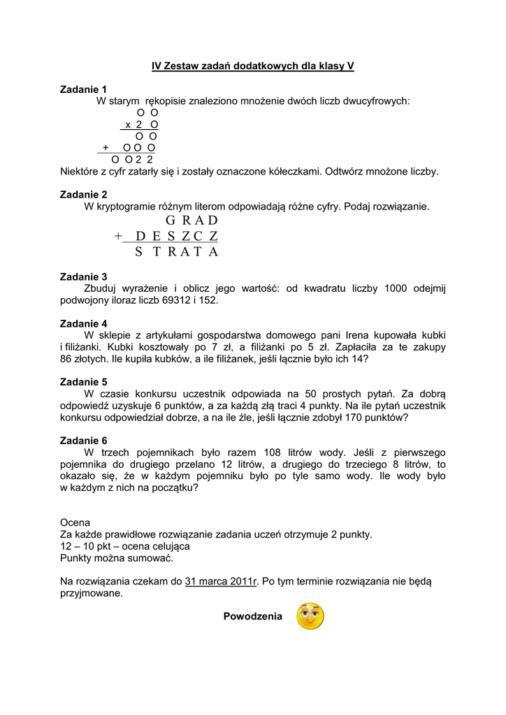 IV Zestaw zadań dodatkowych dla klasy V Zadanie 1 W starym rękopisie znaleziono mnożenie dwóch liczb dwucyfrowych: O O x 2 O O O + OO O O O2 2 Niektóre z cyfr zatarły się i zostały oznaczone kółeczkami. Odtwórz mnożone liczby. Zadanie 2 W kryptogramie różnym literom odpowiadają różne cyfry. Podaj rozwiązanie. G RAD + D E S ZC Z S T RAT A Zadanie 3 Zbuduj wyrażenie i oblicz jego wartość: od kwadratu liczby 1000 odejmij podwojony iloraz liczb 69312 i 152. Zadanie 4 W sklepie z artykułami gospodarstwa domowego pani Irena kupowała kubki i filiżanki. Kubki kosztowały po 7 zł, a filiżanki po 5 zł. Zapłaciła za te zakupy 86 złotych. Ile kupiła kubków, a ile filiżanek, jeśli łącznie było ich 14? Zadanie 5 W czasie konkursu uczestnik odpowiada na 50 prostych pytań. Za dobrą odpowiedź uzyskuje 6 punktów, a za każdą złą traci 4 punkty. Na ile pytań uczestnik konkursu odpowiedział dobrze, a na ile źle, jeśli łącznie zdobył 170 punktów? Zadanie 6 W trzech pojemnikach było razem 108 litrów wody. Jeśli z pierwszego pojemnika do drugiego przelano 12 litrów, a drugiego do trzeciego 8 litrów, to okazało się, że w każdym pojemniku było po tyle samo wody. Ile wody było w każdym z nich na początku? Ocena Za każde prawidłowe rozwiązanie zadania uczeń otrzymuje 2 punkty. 12 – 10 pkt – ocena celująca Punkty można sumować. Na rozwiązania czekam do 31 marca 2011r. Po tym terminie rozwiązania nie będą przyjmowane. Powodzenia