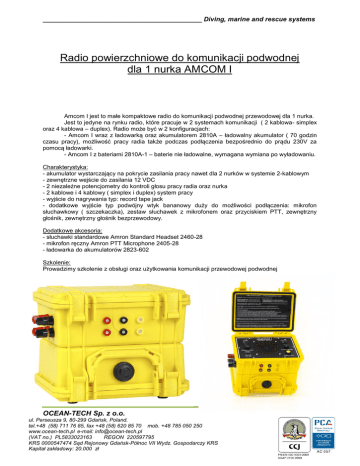 ___________________________________________ Diving, marine and rescue systems Radio powierzchniowe do komunikacji podwodnej dla 1 nurka AMCOM I Amcom I jest to małe kompaktowe radio do komunikacji podwodnej przewodowej dla 1 nurka. Jest to jedyne na rynku radio, które pracuje w 2 systemach komunikacji ( 2 kablowa- simplex oraz 4 kablowa – duplex). Radio może być w 2 konfiguracjach: - Amcom I wraz z ładowarką oraz akumulatorem 2810A – ładowalny akumulator ( 70 godzin czasu pracy), możliwość pracy radia także podczas podłączenia bezpośrednio do prądu 230V za pomocą ładowarki. - Amcom I z bateriami 2810A-1 – baterie nie ładowalne, wymagana wymiana po wyładowaniu. Charakterystyka: - akumulator wystarczający na pokrycie zasilania pracy nawet dla 2 nurków w systemie 2-kablowym - zewnętrzne wejście do zasilania 12 VDC - 2 niezależne potencjometry do kontroli głosu pracy radia oraz nurka - 2 kablowe i 4 kablowy ( simplex i duplex) system pracy - wyjście do nagrywania typ: record tape jack - dodatkowe wyjście typ podwójny wtyk bananowy duży do możliwości podłączenia: mikrofon słuchawkowy ( szczekaczka), zestaw słuchawek z mikrofonem oraz przyciskiem PTT, zewnętrzny głośnik, zewnętrzny głośnik bezprzewodowy. Dodatkowe akcesoria: - słuchawki standardowe Amron Standard Headset 2460-28 - mikrofon ręczny Amron PTT Microphone 2405-28 - ładowarka do akumulatorów 2823-602 Szkolenie: Prowadzimy szkolenie z obsługi oraz użytkowania komunikacji przewodowej podwodnej . OCEAN-TECH Sp. z o.o. ul. Perseusza 9, 80-299 Gdańsk, Poland. tel.+48 (58) 711 76 85, fax +48 (58) 620 85 70 mob. +48 785 050 250 www.ocean-tech.pl e-mail: [email protected] (VAT no.) PL5833023163 REGON 220597795 KRS 0000547474 Sąd Rejonowy Gdańsk-Północ VII Wydz. Gospodarczy KRS Kapitał zakładowy: 20.000 zł ___________________________________________ Diving, marine and rescue systems SPECYFIKACJA Moc głośnika 20 Watt na kanał Częstotliwość pracy 650Hz -2,2 KHz Wymiary 17,1 cm x 21,9 cm x 15,9 cm Waga 2810A – 3,18 kg 2810A-1 – 5 kg Zasilanie 110/220V 50/60Hz lub bateria 12 VDC AMCOM I z ładowarką akumulatorem AMCOM I z bateriami i Kod: OT-2810A-1 Kod: OT-2810A Słuchawki z mikrofonem PTT Mikrofon ręczny z PTT Kod: OT-2460-28 Kod: OT-2405-28 Ładowarka do AMCOM I Akumulator do AMCOM I Kod: OT- 2823-602 Kod: OT- 2890-05 OCEAN-TECH Sp. z o.o. ul. Perseusza 9, 80-299 Gdańsk, Poland. tel.+48 (58) 711 76 85, fax +48 (58) 620 85 70 mob. +48 785 050 250 www.ocean-tech.pl e-mail: [email protected] (VAT no.) PL5833023163 REGON 220597795 KRS 0000547474 Sąd Rejonowy Gdańsk-Północ VII Wydz. Gospodarczy KRS Kapitał zakładowy: 20.000 zł