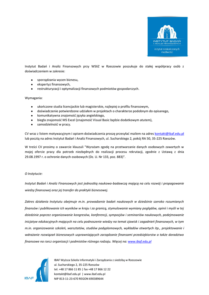 Instytut Badao i Analiz Finansowych przy WSIiZ w Rzeszowie poszukuje do stałej współpracy osób z doświadczeniem w zakresie: sporządzania wycen biznesu, ekspertyz finansowych, restrukturyzacji i optymalizacji finansowych podmiotów gospodarczych. Wymagania: ukooczone studia licencjackie lub magisterskie, najlepiej o profilu finansowym, doświadczenie potwierdzone udziałem w projektach o charakterze podobnym do opisanego, komunikatywna znajomośd języka angielskiego, biegła znajomośd MS Excel (znajomośd Visual Basic będzie dodatkowym atutem), samodzielnośd w pracy. CV wraz z listem motywacyjnym i opisem doświadczenia proszę przesyład mailem na adres [email protected] lub pocztą na adres Instytut Badao i Analiz Finansowych, ul. Sucharskiego 2, pokój RA 50, 35-225 Rzeszów. W treści CV prosimy o zawarcie klauzuli "Wyrażam zgodę na przetwarzanie danych osobowych zawartych w mojej ofercie pracy dla potrzeb niezbędnych do realizacji procesu rekrutacji, zgodnie z Ustawą z dnia 29.08.1997 r. o ochronie danych osobowych (Dz. U. Nr 133, poz. 883)". O Instytucie: Instytut Badao i Analiz Finansowych jest jednostką naukowo-badawczą mającą na celu rozwój i propagowanie wiedzy finansowej oraz jej transfer do praktyki biznesowej. Zakres działania Instytutu obejmuje m.in. prowadzenie badao naukowych w dziedzinie szeroko rozumianych finansów i publikowanie ich wyników w kraju i za granicą, stymulowanie wymiany poglądów, opinii i myśli w tej dziedzinie poprzez organizowanie kongresów, konferencji, sympozjów i seminariów naukowych, podejmowanie inicjatyw edukacyjnych mających na celu podnoszenie wiedzy na temat zjawisk i zagadnieo finansowych, w tym m.in. organizowanie szkoleo, warsztatów, studiów podyplomowych, wykładów otwartych itp., projektowanie i wdrażanie rozwiązao biznesowych usprawniających zarządzanie finansami przedsiębiorstw a także doradztwo finansowe na rzecz organizacji i podmiotów różnego rodzaju. Więcej na: www.ibaf.edu.pl IBAF Wyższa Szkoła Informatyki i Zarządzania z siedzibą w Rzeszowie ul. Sucharskiego 2, 35-225 Rzeszów tel. +48 17 866 11 85 | fax +48 17 866 12 22 [email protected] | www.ibaf.edu.pl NIP 813-11-23-670 REGON 690389644