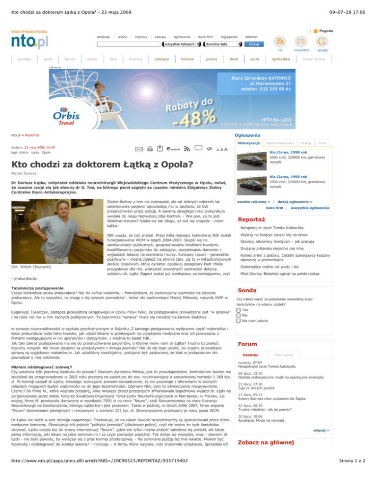 Kto chodzi za doktorem Łątką z Opola? - 23 maja 2009 09-07-28 17:06 | artykuły wideo imprezy zakupy ogłoszenia wszystkie kategorie baza firm regiopedia dowolna data rss powiaty sport forum wideo foto imprezy zakupy biznes Pogoda internet praca dom auto newsletter opolanka igoogle mapa strony reklama Ogłoszenia nto.pl » Reportaż Motoryzacja dodano: 23 maja 2009, 16:00 Nieruchomości AAA tagi: doktor Łątka Opole Inne Kia Clarus, 1998 rok 2000 cm3, 224000 km, garnatowy metalik Kto chodzi za doktorem Łątką z Opola? Marek Świercz Kia Clarus, 1998 rok 2000 cm3, 224000 km, granatowy metalik Dr Dariusz Łątka, ordynator oddziału neurochirurgii Wojewódzkiego Centrum Medycznego w Opolu, mówi, że czasem czuje się jak sławny dr G. Ten, na którego parol zagięło za czasów ministra Zbigniewa Ziobry Centralne Biuro Antykorupcyjne. Żaden śledczy z nim nie rozmawiał, ale od dobrych czterech lat zestresowani pacjenci opowiadają mu w zaufaniu, że byli przesłuchiwani przez policję. A jesienią ubiegłego roku prokuratura wysłała do niego Najwyższą Izbę Kontroli. - Wie pan, co to jest śledztwo trałowe? Szuka się tak długo, aż coś się znajdzie - mówi Łątka. (fot. Witold Chojnacki) Praca NIK uważa, że coś znalazł. Przez kilka miesięcy kontrolerzy NIK badali funkcjonowanie WCM w latach 2004-2007. Skupili się na zamówieniach publicznych, gospodarowaniu środkami trwałymi, kwalifikowaniu pacjentów do zabiegów, pozyskiwaniu darowizn i wyjazdach lekarzy na seminaria i kursy. Końcowy raport - generalnie pozytywny - można znaleźć na stronie Izby. Za to w kilkustronicowym skrócie prasowym, który dyrektor opolskiej delegatury Piotr Miklis przygotował dla nto, większość poważnych zastrzeżeń dotyczy oddziału dr. Łątki. Raport został już przekazany zamawiającemu, czyli zamów reklamę » | dodaj ogłoszenie » baza firm | wszystkie ogłoszenia Reportaż Niespokojne życie Tomka Kubiaczka Wyścig na Księżyc zaczął się na nowo Opolscy ratownicy medyczni - jak pracują Drużyna piłkarska niejedno ma imię Koniec armii z poboru. Ostatni szeregowcy koszary opuszczą w poniedziałek Dziewiętlice mokre od wody i łez Pilot Dionizy Bielański zginął na polski rozkaz - prokuraturze. Tajemnicze postępowanie Czego konkretnie szuka prokuratura? Nie do końca wiadomo. - Potwierdzam, że wykonujemy czynności na zlecenie prokuratury. Ale to wszystko, co mogę o tej sprawie powiedzieć - mówi nto nadkomisarz Maciej Milewski, rzecznik KWP w Opolu. Eugeniusz Tokarczyk, zastępca prokuratora okręgowego w Opolu mówi tylko, że postępowanie prowadzone jest "w sprawie” i na razie nie ma w nim żadnych podejrzanych. Ta tajemnicza "sprawa” miała się narodzić na kanwie śledztwa w sprawie nieprawidłowości w szpitalu psychiatrycznym w Rybniku. Z tamtego postępowania wyłączono część materiałów i teraz prokuratura bada takie kwestie, jak udział lekarzy w przetargach na urządzenia medyczne oraz ich powiązania z firmami występującymi w roli sponsorów i darczyńców. I właśnie to badał NIK. Jak taki zakres postępowania ma się do przesłuchiwania pacjentów, o którym mówi nam dr Łątka? Trudno tu znaleźć logiczny związek. Ale może pacjenci są przepytywani z innego powodu? Nie da się tego ustalić, bo organy prowadzące sprawę są wyjątkowo małomówne. Jak ustaliliśmy nieoficjalnie, policjanci byli zaskoczeni, że ktoś w prokuraturze nto powiedział o niej cokolwiek. Miałem oddelegować salową? Czy ustalenia NIK popchną śledztwo do przodu? Zdaniem dyrektora Miklisa, jest to prawdopodobne. Kontrolerom bardzo nie spodobał się przeprowadzony w 2005 roku przetarg na aparaturę do tzw. neuronawigacji o szacunkowej wartości 1 369 tys. zł. W komisji zasiadł dr Łątka, składając wymagane prawem oświadczenie, że nie pozostaje z oferentami w żadnych relacjach mogących budzić wątpliwości co do jego bezstronności. Zdaniem NIK, było to oświadczenie nieuprawnione. Czemu? Bo firma M., która wygrała przetarg, kilka miesięcy przed przetargiem sfinansowała tygodniowy wyjazd dr. Łątki na zorganizowany przez siebie Kongres Światowej Organizacji Towarzystw Neurochirurgicznych w Marrakeszu w Maroku. Co więcej, firma M. przekazała darowiznę w wysokości 7500 zł na rzecz "Neuro”, czyli Stowarzyszenia na rzecz Rozwoju Neurochirurgii na Opolszczyźnie, którego Łątka był i jest prezesem. Także w później, w latach 2006-2007, firma wsparła "Neuro” darowiznami pieniężnymi i rzeczowymi o wartości 252 tys. zł. Stowarzyszenie przekazało je rzecz jasna WCM. Dr Łątka nie widzi w tym niczego nagannego. Przekonuje, że na całym świecie neurochirurdzy są sponsorowani przez różne medyczne koncerny. Obowiązuje ich jedynie "polityka jawności” (disclosure policy), czyli nie wolno im tych kontaktów ukrywać. Łątka odsyła też do strony internetowej "Neuro”, gdzie nie tylko można znaleźć założenia tej polityki, ale także pełną informację, jaki lekarz na jakie seminarium i za czyje pieniądze pojechał. Tak dzieje się wszędzie, więc - zdaniem dr Łątki - nie było powodu, by wyłączył się z prac komisji przetargowej. - Na seminaria jeżdżą też moi lekarze. Miałem być hipokrytą i oddelegować do komisji salową? - ironizuje. - A firma, która wygrała, robi znakomite urządzenia. Sprzedała ich w Polsce ponad 20. Drugi koncern uczestniczący w przetargu bodaj 4. http://www.nto.pl/apps/pbcs.dll/article?AID=/20090523/REPORTAZ/935719402 Sonda Czy należy karać za posiadanie niewielkiej ilości narkotyków na własny użytek? Tak Nie Nie mam zdania Głosuj Wyniki Forum Ostatnie Popularne wczoraj, 07:54 Niespokojne życie Tomka Kubiaczka 26 lipca, 12:10 Nastała niebezpieczna moda na egzotyczne zwierzęta 23 lipca, 17:10 Żyje ze starych puszek 23 lipca, 09:13 Robert Starosta chce autonomii dla Śląska 22 lipca, 20:33 Trudna młodzież - jak jej pomóc? 20 lipca, 10:06 Apostazja: Moda 