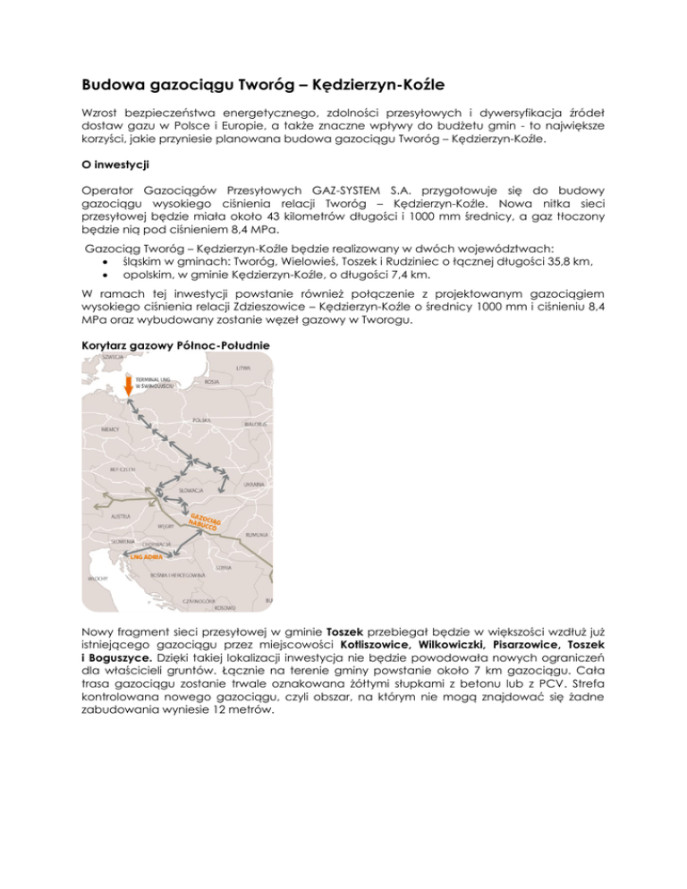 Budowa gazociągu Tworóg – Kędzierzyn-Koźle Wzrost bezpieczeństwa energetycznego, zdolności przesyłowych i dywersyfikacja źródeł dostaw gazu w Polsce i Europie, a także znaczne wpływy do budżetu gmin - to największe korzyści, jakie przyniesie planowana budowa gazociągu Tworóg – Kędzierzyn-Koźle. O inwestycji Operator Gazociągów Przesyłowych GAZ-SYSTEM S.A. przygotowuje się do budowy gazociągu wysokiego ciśnienia relacji Tworóg – Kędzierzyn-Koźle. Nowa nitka sieci przesyłowej będzie miała około 43 kilometrów długości i 1000 mm średnicy, a gaz tłoczony będzie nią pod ciśnieniem 8,4 MPa. Gazociąg Tworóg – Kędzierzyn-Koźle będzie realizowany w dwóch województwach: śląskim w gminach: Tworóg, Wielowieś, Toszek i Rudziniec o łącznej długości 35,8 km, opolskim, w gminie Kędzierzyn-Koźle, o długości 7,4 km. W ramach tej inwestycji powstanie również połączenie z projektowanym gazociągiem wysokiego ciśnienia relacji Zdzieszowice – Kędzierzyn-Koźle o średnicy 1000 mm i ciśnieniu 8,4 MPa oraz wybudowany zostanie węzeł gazowy w Tworogu. Korytarz gazowy Północ-Południe Nowy fragment sieci przesyłowej w gminie Toszek przebiegał będzie w większości wzdłuż już istniejącego gazociągu przez miejscowości Kotliszowice, Wilkowiczki, Pisarzowice, Toszek i Boguszyce. Dzięki takiej lokalizacji inwestycja nie będzie powodowała nowych ograniczeń dla właścicieli gruntów. Łącznie na terenie gminy powstanie około 7 km gazociągu. Cała trasa gazociągu zostanie trwale oznakowana żółtymi słupkami z betonu lub z PCV. Strefa kontrolowana nowego gazociągu, czyli obszar, na którym nie mogą znajdować się żadne zabudowania wyniesie 12 metrów. Trasa gazociągu Tworóg – Kędzierzyn-Koźle O inwestorze Inwestorem tego zadania jest Operator Gazociągów Przesyłowych GAZ-SYSTEM S.A., czyli jednoosobowa spółka akcyjna Skarbu Państwa o znaczeniu strategicznym dla polskiej gospodarki. Kluczowym zadaniem spółki jest transport paliw gazowych siecią przesyłową na terenie całego kraju do sieci dystrybucyjnych oraz do odbiorców końcowych podłączonych do systemu przesyłowego. Korzyści z realizacji inwestycji Budowa gazociągu wysokiego ciśnienia relacji Tworóg – Kędzierzyn-Koźle wpłynie na zwiększenie zdolności przesyłowych gazu w rejonie Górnego Śląska oraz Opolszczyzny. Inwestycja ta jest także kluczowym projektem dla wzmocnienia bezpieczeństwa energetycznego Polski i Europy. Nowy gazociąg będzie stanowił ważny element Korytarza Gazowego Północ-Południe łączącego terminal LNG w Świnoujściu z planowanym terminalem LNG w Chorwacji. O tym, jak ważna jest ta inwestycja może świadczyć fakt, że Komisja Europejska wpisała budowę gazociągu na listę projektów o znaczeniu wspólnotowym tzw. PCI („Project of Common Interest”). Ważną korzyścią dla gminy będzie corocznie odprowadzany przez spółkę GAZ-SYSTEM S.A. podatek od nieruchomości w wysokości 2% wartości odcinka gazociągu zlokalizowanego na jego terenie. Będzie to kwota regularnie wpływająca do budżetu, którą można będzie przeznaczyć na potrzeby społeczności lokalnych. Budowa sieci gazociągowej zwiększy też atrakcyjność terenów przeznaczonych pod nowe inwestycje. Wszyscy właściciele nieruchomości, na których zlokalizowany będzie nowy gazociąg otrzymają odszkodowanie z tytułu wybudowania inwestycji na tym terenie. Postępy w realizacji inwestycji Obecnie opracowywana jest przez konsorcjum firm MGGP S.A. z Tarnowa i MGGP PROJEKT Sp. z o.o. z Krakowa dokumentacja projektowa związana z inwestycją. Pozyskano potrzebne materiały geodezyjne i wytyczono wstępnie trasę gazociągu. Prowadzone są prace związane ze zmianą miejscowych planów zagospodarowania przestrzennego gminy w celu wprowadzenia do nich projektowanego gazociągu. Zakończenie realizacji inwestycji planowane jest na 2018 rok. Standardy realizacji inwestycji Warto podkreślić, że w trosce o bezpieczeństwo i niezawodność przesyłu gazu oraz wymagania ochrony środowiska spółka GAZ-SYSTEM S.A. podczas realizacji inwestycji stosuje nowoczesne i sprawdzone technologie. Wykorzystuje przy tym najlepszej jakości materiały oraz najnowocześniejsze systemy zabezpieczeń. Przy budowie gazociągu zastosowane zostaną rury stalowe o zwiększonej wytrzymałości i specjalna izolacja, spawanie wykonywane będzie automatycznie lub półautomatycznie, zaś sam gazociąg zostanie poddany hydraulicznym próbom specjalnym (stresowym), a każda spoina będzie kontrolowana przez specjalistyczne badania. Daje to gwarancję bezawaryjnej eksploatacji i zabezpiecza przed emisją gazu do środowiska, wód powierzchniowych czy podziemnych. Odpowiedzialne inwestycje Wszystkie inwestycje GAZ-SYSTEM S.A. są realizowane z poszanowaniem środowiska naturalnego oraz zgodnie z wymogami prawa polskiego i unijnego. Dla wszystkich budowanych gazociągów uzyskuje się decyzje środowiskowe, a realizacja inwestycji uwzględni zawarte w nich wytyczne. Ponadto prowadzony będzie stały monitoring zanieczyszczeń emitowanych do powietrza, wody i gleby, a materiały wykorzystywane do budowy gazociągów posiadają niezbędne atesty i certyfikaty. Kontakt Informacje na temat gazociągu można uzyskać na stronie internetowej http://www.gaz-system.pl/nasze-inwestycje/krajowy-system-przesylowy/tworog-kedzierzynkozle/ oraz w Oddziale Spółki Operator Gazociągów Przesyłowych GAZ-SYSTEM S.A. Oddział w Świerklanach ul. Wodzisławska 54, 44-266 Świerklany tel. 32 43 92 500 e-mail: [email protected]