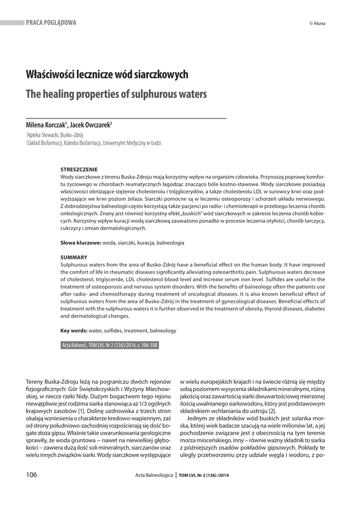 PRACA POGLĄDOWA © Aluna Właściwości lecznicze wód siarczkowych The healing properties of sulphurous waters Milena Korczak1, Jacek Owczarek2 Apteka Słowacki, Busko-Zdrój Zakład Biofarmacji, Katedra Biofarmacji, Uniwersytet Medyczny w Łodzi 1 2 STRESZCZENIE Wody siarczkowe z terenu Buska-Zdroju mają korzystny wpływ na organizm człowieka. Przynoszą poprawę komfortu życiowego w chorobach reumatycznych łagodząc znacząco bóle kostno-stawowe. Wody siarczkowe posiadają właściwości obniżające stężenie cholesterolu i trójglicerydów, a także cholesterolu LDL w surowicy krwi oraz podwyższające we krwi poziom żelaza. Siarczki pomocne są w leczeniu osteoporozy i schorzeń układu nerwowego. Z dobrodziejstwa balneologii często korzystają także pacjenci po radio- i chemioterapii w przebiegu leczenia chorób onkologicznych. Znany jest również korzystny efekt „buskich” wód siarczkowych w zakresie leczenia chorób kobiecych. Korzystny wpływ kuracji wodą siarczkową zauważono ponadto w procesie leczenia otyłości, chorób tarczycy, cukrzycy i zmian dermatologicznych. Słowa kluczowe: woda, siarczki, kuracja, balneologia SUMMARY Sulphurous waters from the area of Busko-Zdrój have a beneficial effect on the human body. It have improved the comfort of life in rheumatic diseases significantly alleviating osteoarthritis pain. Sulphurous waters decrease of cholesterol, triglyceride, LDL cholesterol blood level and increase serum iron level. Sulfides are useful in the treatment of osteoporosis and nervous system disorders. With the benefits of balneology often the patients use after radio- and chemiotherapy during treatment of oncological diseases. It is also known beneficial effect of sulphurous waters from the area of Busko-Zdrój in the treatment of gynecological diseases. Beneficial effects of treatment with the sulphurous waters it is further observed in the treatment of obesity, thyroid diseases, diabetes and dermatological changes. Key words: water, sulfides, treatment, balneology Acta Balneol., TOM LVI, Nr 2 (136)/2014, s. 106-108 Tereny Buska-Zdroju leżą na pograniczu dwóch rejonów fizjograficznych: Gór Świętokrzyskich i Wyżyny Miechowskiej, w niecce rzeki Nidy. Dużym bogactwem tego rejonu niewątpliwie jest rodzima siarka stanowiąca aż 1/3 ogólnych krajowych zasobów [1]. Dolinę uzdrowiska z trzech stron okalają wzniesienia o charakterze kredowo-wapiennym, zaś od strony południowo-zachodniej rozpościerają się dość bogate złoża gipsu. Właśnie takie uwarunkowania geologiczne sprawiły, że woda gruntowa − nawet na niewielkiej głębokości − zawiera dużą ilość soli mineralnych, siarczanów oraz wielu innych związków siarki. Wody siarczkowe występujące w wielu europejskich krajach i na świecie różnią się między sobą poziomem wysycenia składnikami mineralnymi, różną jakością oraz zawartością siarki dwuwartościowej mierzonej ilością uwalnianego siarkowodoru, który jest podstawowym składnikiem wchłaniania do ustroju [2]. Jednym ze składników wód buskich jest solanka morska, której wiek badacze szacują na wiele milionów lat, a jej pochodzenie związane jest z obecnością na tym terenie morza mioceńskiego. Inny − równie ważny składnik to siarka z późniejszych osadów pokładów gipsowych. Pokłady te uległy przetworzeniu przy udziale węgla i wodoru, z po- 106 TOM LVI, Nr 2 (136) /2014 Acta Balneologica Właściwości lecznicze wód siarczkowych mocą bakterii redukujących w warunkach beztlenowych. Siarka, która tą drogą powstała, kilkakrotnie zmieniała swoją wartościowość z VI i IV na II, przyjmując postać siarczków i wielosiarczków. To właśnie te ostatnie związki − przy odpowiednim pH wody – wydzielają leczniczy siarkowodór wchłaniany przez pacjentów podczas kąpieli, irygacji czy kuracji pitnych. Lecznicze właściwości wody siarczkowej wiążą się z wchłanianiem dwuwartościowej siarki przez skórę, drogi rodne, oddechowe i przewód pokarmowy. Przenikanie siarki do organizmu prowadzi do aktywizacji procesów biochemicznych, przeciwzapalnych, przeciwreumatycznych i „odtruwających”. Zawartość siarki w organizmie człowieka wynosi 0,14%, głównie w postaci połączeń organicznych. Jej źródłem są w pożywieniu organiczne związki siarki dwuwartościowej zawarte w białku zwierzęcym i w roślinach strączkowych. Nieorganiczne związki siarki są słabo przyswajalne. Wchłaniana siarka w czasie kąpieli stanowi ok. 4% wartości dostarczanej z pożywieniem. Siarka dwuwartościowa wykazuje największą przyswajalność. Najłatwiej wchłania się siarkowodór w środowisku kwaśnym. Jak wykazały badania izotopowe jonów SO4, wchłanialność siarki po jednogodzinnej kąpieli wynosi około 1 mg, podczas, gdy wchłanialność z kąpieli siarczkowej oceniana jest na 6-40 mg, a uwzględniając jednoczesne wchłanianie siarkowodoru drogą oddechową − około 58 mg [3]. Poza siarczkami, woda z terenu Buska-Zdroju zawiera też znaczne ilości mikroelementów takich jak: jod, brom, wapń, magnez, selen. W sumie ilość składników mineralnych stanowi 1,4%, wśród nich zdecydowanie najwięcej jest chlorku sodu. Podczas kuracji nie obserwowano wzrostu wartości ciśnienia tętniczego krwi [2]. Przeciwnie − jak wykazał Kazimierz Kucharski − u pacjentów po kuracji wodą siarczkową obserwuje się spadek ciśnienia tętniczego i poprawę ukrwienia kończyn. Kąpiele i kuracje pitne z użyciem wody siarczkowej są pomocne w rekonwalescencji po zatruciach grzybami lub środkami ochrony roślin. Wieloletnie obserwacje potwierdzają, że dzięki siarczkom zawartym w „buskiej wodzie” poprawia się stan zdrowia pacjentów z uszkodzeniem wątroby. Po kuracjach u pacjentów poprawia się apetyt i trawienie. Woda siarczkowa podawana w kuracji pitnej pomaga także w redukcji poziomu ołowiu we krwi pacjentów mieszkających w dużych aglomeracjach miejskich, 