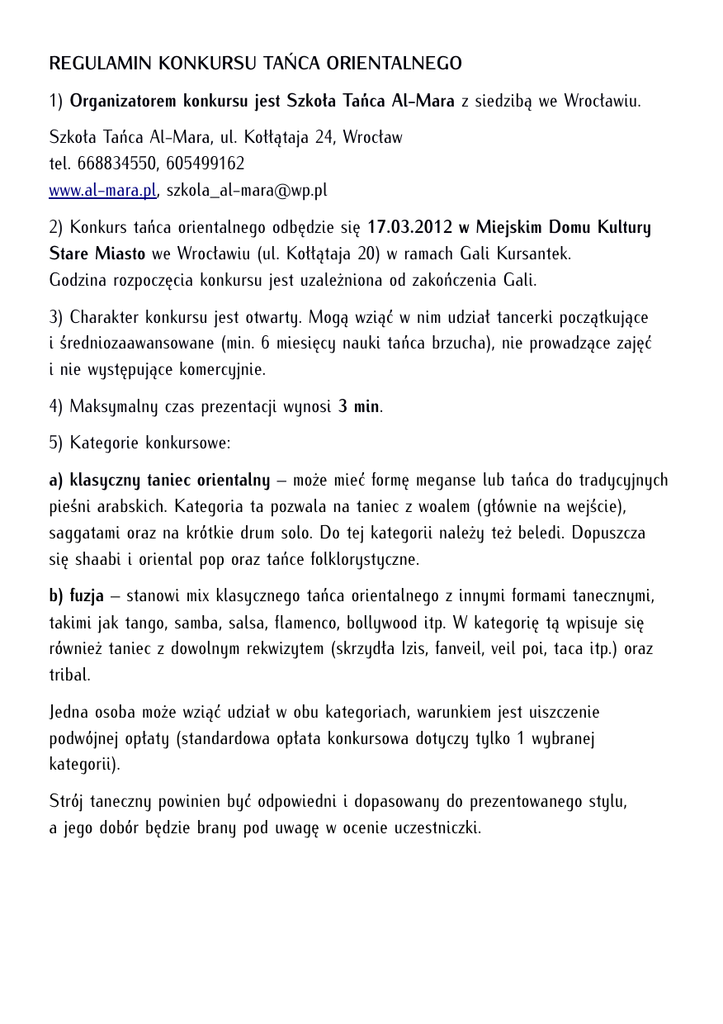 REGULAMIN KONKURSU TAŃCA ORIENTALNEGO 1) Organizatorem konkursu jest Szkoła Tańca Al-Mara z siedzibą we Wrocławiu. Szkoła Tańca Al-Mara, ul. Kołłątaja 24, Wrocław tel. 668834550, 605499162 www.al-mara.pl, [email protected] 2) Konkurs tańca orientalnego odbędzie się 17.03.2012 w Miejskim Domu Kultury Stare Miasto we Wrocławiu (ul. Kołłątaja 20) w ramach Gali Kursantek. Godzina rozpoczęcia konkursu jest uzależniona od zakończenia Gali. 3) Charakter konkursu jest otwarty. Mogą wziąć w nim udział tancerki początkujące i średniozaawansowane (min. 6 miesięcy nauki tańca brzucha), nie prowadzące zajęć i nie występujące komercyjnie. 4) Maksymalny czas prezentacji wynosi 3 min. 5) Kategorie konkursowe: a) klasyczny taniec orientalny – może mieć formę meganse lub tańca do tradycyjnych pieśni arabskich. Kategoria ta pozwala na taniec z woalem (głównie na wejście), saggatami oraz na krótkie drum solo. Do tej kategorii należy też beledi. Dopuszcza się shaabi i oriental pop oraz tańce folklorystyczne. b) fuzja – stanowi mix klasycznego tańca orientalnego z innymi formami tanecznymi, takimi jak tango, samba, salsa, flamenco, bollywood itp. W kategorię tą wpisuje się również taniec z dowolnym rekwizytem (skrzydła Izis, fanveil, veil poi, taca itp.) oraz tribal. Jedna osoba może wziąć udział w obu kategoriach, warunkiem jest uiszczenie podwójnej opłaty (standardowa opłata konkursowa dotyczy tylko 1 wybranej kategorii). Strój taneczny powinien być odpowiedni i dopasowany do prezentowanego stylu, a jego dobór będzie brany pod uwagę w ocenie uczestniczki. 6) Kryteria oceny. Ocenie podlegać będą: a) technika tańca, b) wizerunek sceniczny (strój, postawa, kontakt z publicznością), c) spójność stylistyczna (dobór figur i kroków do prezentowanego stylu, dobór rekwizytów, interpretacja muzyki), d) muzykalność (wrażliwość na rytm i tempo, dynamika, zdolność emocjonalnego przeżywania muzyki, ekspresja). Ocena tancerek odbędzie się w sposób tajny, co oznacza, że dopiero po ogłoszeniu wyników i zakończeniu konkursu uczestniczka będzie mieć szczegółowy wgląd w punkty przyznane przez Jurorów. Jury zastrzega sobie prawo do dyskwalifikacji uczestniczki, jeżeli: - występ odbiega znacząco od zasad kategorii konkursowej, - występ łamie ogólne zasady estetyczne i etyczne, bądź obraża poglądy religijne. Decyzje Jury są ostateczne. 7) Dla laureatów konkursu organizator ufundował nagrody rzeczowe. 8) Warunkiem wzięcia udziału w konkursie jest wypełnienie formularza zgłoszeniowego i dostarczenie go do siedziby szkoły tańca Al-Mara oraz uiszczenie opłaty startowej w wysokości 10 zł w terminie nie przekraczającym 03.03.2012. 9) Muzykę do występu należy dostarczyć na dwóch płytach CD: w formacie audio oraz w formacie mp3 do dnia 10.03.2012. Obie płyty powinny być podpisane imieniem i nazwiskiem uczestniczki oraz kategorią konkursową. 10) Jury/Jurorzy. W skład Jury wchodzą osoby związane z tańcem orientalnym, tancerze z wieloletnim doświadczeniem scenicznym i konkursowym. 11) Organizator zapewnia uczestnikom bezpłatne konsultacje w ramach przygotowań do konkursu. Wstępne terminy konsultacji zostaną podane przez Organizatora i mogą ulec zmianie. Aby skorzystać z bezpłatnych konsultacji należy wcześniej zgłosić swoją obecność telefonicznie lub drogą e-mailową na adres: [email protected] 12) We wszystkich sprawach dotyczących konkursu, które nie zostały zawarte w Regulaminie, rozstrzyga Organizator.