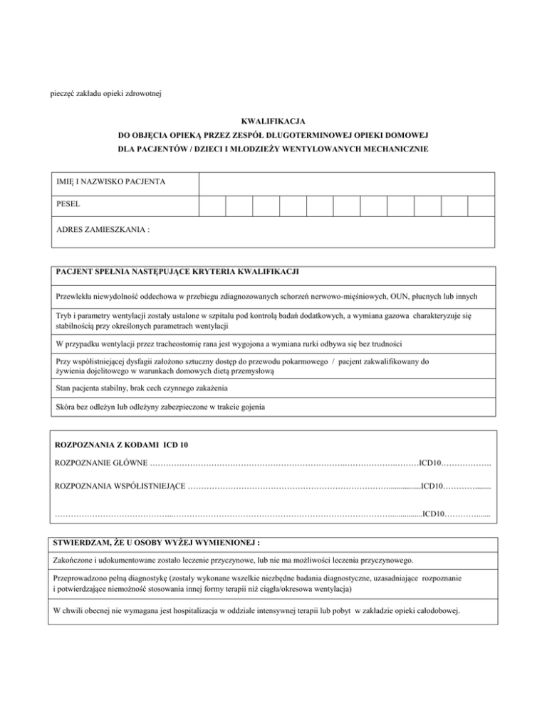 pieczęć zakładu opieki zdrowotnej KWALIFIKACJA DO OBJĘCIA OPIEKĄ PRZEZ ZESPÓŁ DŁUGOTERMINOWEJ OPIEKI DOMOWEJ DLA PACJENTÓW / DZIECI I MŁODZIEŻY WENTYLOWANYCH MECHANICZNIE IMIĘ I NAZWISKO PACJENTA PESEL ADRES ZAMIESZKANIA : PACJENT SPEŁNIA NASTĘPUJĄCE KRYTERIA KWALIFIKACJI Przewlekła niewydolność oddechowa w przebiegu zdiagnozowanych schorzeń nerwowo-mięśniowych, OUN, płucnych lub innych Tryb i parametry wentylacji zostały ustalone w szpitalu pod kontrolą badań dodatkowych, a wymiana gazowa charakteryzuje się stabilnością przy określonych parametrach wentylacji 1. W przypadku wentylacji przez tracheostomię rana jest wygojona a wymiana rurki odbywa się bez trudności 2. Przy współistniejącej dysfagii założono sztuczny dostęp do przewodu pokarmowego / pacjent zakwalifikowany do 3. żywienia dojelitowego w warunkach domowych dietą przemysłową 4. Stan pacjenta stabilny, brak cech czynnego zakażenia 5. Skóra bez odleżyn lub odleżyny zabezpieczone w trakcie gojenia ROZPOZNANIA Z KODAMI ICD 10 ROZPOZNANIE GŁÓWNE ……………………………………………………………….……………….………ICD10………………. ROZPOZNANIA WSPÓŁISTNIEJĄCE …………………………………………………………………................ICD10…………........ ……………………………………...………………………………………………………………………................ICD10…………....... STWIERDZAM, ŻE U OSOBY WYŻEJ WYMIENIONEJ : Zakończone i udokumentowane zostało leczenie przyczynowe, lub nie ma możliwości leczenia przyczynowego. Przeprowadzono pełną diagnostykę (zostały wykonane wszelkie niezbędne badania diagnostyczne, uzasadniające rozpoznanie i potwierdzające niemożność stosowania innej formy terapii niż ciągła/okresowa wentylacja) W chwili obecnej nie wymagana jest hospitalizacja w oddziale intensywnej terapii lub pobyt w zakładzie opieki całodobowej. IMIĘ I NAZWISKO PACJENTA PESEL 1. UKŁAD ODDECHOWY NIEWYDOLNY – WYMAGA WENTYLACJI MECHANICZNEJ □ STAŁEJ 24 H / DOBĘ □ OKRESOWEJ ……………..……...H / DOBĘ , 2. □ WENTYLACJA INWAZYJNA ROZMIAR RURKI TRACHEOSTOMIJNEJ ………………………………………………. KONIECZNE MECHANICZNE ODSYSANIE WYDZIELINY OSKRZELOWEJ : □ TAK □ NIE □ WENTYLACJA NIEINWAZYJNA PARAMETRY WENTYLACJI TRYB WENTYLACJI….……………….....………, PEEP: …..……….…….…………… cm H2O, Fi O2 ………..……….…..…..…%, Vt …..…….…….…….…... ml, CZĘSTOŚĆ ODDECHÓW ..……….…………………../min, PS ………..…..………..…… cm H2O □ NIE DODATKOWY O2: □ TAK ….….… l/min….. ….….godz./dobę 3. 4. UKŁAD KRĄŻENIA: WYDOLNY , CIŚNIENIE TĘTNICZE ………….. /……..………mmHg, TĘTNO :………….…..…. /min, □ ŻYWIONY DOUSTNIE □ GASTROSTOMIA □ ZGŁĘBNIK NOSOWY □ JEJUNOSTOMIA UKŁAD MOCZOWO- PŁCIOWY: □ STAN PRAWIDŁOWY □ NIETRZYMANIE MOCZU □ CEWNIK DO PĘCHERZA 5. UKŁAD POKARMOWY : UKŁAD RUCHU ORAZ OCENA STOPNIA SAMODZIELNOŚCI W SAMOOBSŁUDZE I SAMOPIELĘGNACJI □ CHODZĄCY □ PORUSZAJĄCY SIĘ Z POMOCĄ OSÓB DRUGICH / PRZEDMIOTÓW ORTOPEDYCZNYCH □ SIADAJĄCY W ŁÓŻKU □ LEŻĄCY □ PEŁNA SAMOOBSŁUGA □ CZĘŚCIOWA SAMOOBSŁUGA □ SAMOOBSŁUGA NIEMOŻLIWA UKŁAD NERWOWY I NARZĄDY ZMYSŁÓW : □ PRZYTOMNY □ NIEPRZYTOMNY □ W KONTAKCIE □ BEZ KONTAKTU PACJENT ZAKWALIFIKOWANY DO OBJĘCIA OPIEKĄ PRZEZ ZESPÓŁ DŁUGOTERMINOWEJ OPIEKI DOMOWEJ DLA PACJENTÓW / DZIECI I MŁODZIEŻY WENTYLOWANYCH MECHANICZNIE ……………………………….. Data ............................................................................. Pieczątka i podpis lekarza specjalisty anestezjologii i intensywnej terapii lub chorób płuc (tylko dla wentylacji nieinwazyjnej)