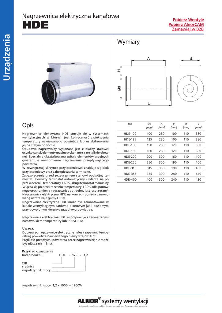 Nagrzewnica elektryczna kanałowa Pobierz Wentyle Pobierz AlnorCAM Zamawiaj w B2B Urządzenia HDE Wymiary B H A L Opis Nagrzewnice elektryczne HDE stosuje się w systemach wentylacyjnych w których jest konieczność zwiększenia temperatury nawiewanego powietrza lub ustabilizowania jej na stałym poziomie. Obudowa nagrzewnicy wykonana jest z blachy stalowej ocynkowanej, elementy grzejne wykonane są ze stali nierdzewnej. Specjalnie ukształtowana spirala elementów grzejnych gwarantuje równomierne nagrzewanie przepływającego powietrza. W zewnętrznej skrzynce przyłączeniowej znajduje się blok przyłączeniowy oraz zabezpieczenia termiczne. Zabezpieczenie przed przegrzaniem stanowi podwójny termostat. Pierwszy termostat automatyczny - włącza się po przekroczeniu temperatury +60oC, drugi termostat manualny - włącza się po przekroczeniu temperatury +90oC (dla ponownego uruchomienia nagrzewnicy potrzebny jest reset ręczny). Nagrzewnica elektryczna HDE na końcach posiada zamocowaną uszczelką z gumy EPDM. Nagrzewnica elektryczna HDE może być zamontowana w kanale wentylacyjnym zarówno pionowym jak i poziomym przy dowolonym kierunku przepływu powietrza. typ d [mm] A [mm] B [mm] H [mm] L [mm] HDE-100 100 280 100 110 380 HDE-125 125 280 100 110 380 HDE-150 150 280 120 110 380 HDE-160 160 280 120 110 380 HDE-200 200 300 160 110 400 HDE-250 250 300 190 110 400 HDE-315 315 300 190 110 400 HDE-355 355 300 240 110 430 HDE-400 400 300 240 110 430 Nagrzewnica elektryczna HDE współpracuje z zewnętrznym nastawnikiem temperatury lub PULSEREM. Uwaga: Dobierając nagrzewnice elektryczne należy zapewnić temperaturę powietrza nawiewanego niewyższą niż 40oC. Prędkość przepływu powietrza przez nagrzewnicę nie może być niższa niz 1,5m/s. Przykład oznaczenia Kod produktu: HDE - 125 - 1,2 typ średnica współczynnik mocy współczynnik mocy: 1,2 x 1000 = 1200W ALNOR® systemy wentylacji jest prawnie chronionym znakiem i technicznym patentem. Prawo do zmian zastrzeżone. Nagrzewnica elektryczna kanałowa HDE moc [W] napięcie [V] ilość el. grz. [szt.] HDE-100-0,3 300 1 x 230 1 HDE-100-0,6 600 1 x 230 2 HDE-100-0,9 900 1 x 230 3 HDE-100-1,2 1200 1 x 230 4 HDE-125-0,3 300 1 x 230 1 HDE-125-0,6 600 1 x 230 2 HDE-125-0,9 900 1 x 230 3 HDE-125-1,2 1200 1 x 230 4 HDE-125-1,5 1500 1 x 230 3 HDE-150-0,5 500 1 x 230 1 HDE-150-1,0 1000 1 x 230 2 HDE-150-1,5 1500 1 x 230 3 HDE-150-2,0 2000 1 x 230 4 HDE-160-0,5 500 1 x 230 1 HDE-160-1,0 1000 1 x 230 2 HDE-160-1,5 1500 1 x 230 3 HDE-160-2,0 2000 1 x 230 4 HDE-200-0,5 500 1 x 230 1 HDE-200-1,0 1000 1 x 230 2 HDE-200-1,5 1500 1 x 230 3 HDE-200-2,0 2000 1 x 230 4 HDE-200-3,0 3000 1 x 230 2 HDE-200-4,5 4500 3 x 400 3 HDE-250-0,5 500 1 x 230 1 HDE-250-1,0 1000 1 x 230 2 HDE-250-1,5 1500 1 x 230 3 HDE-250-2,0 2000 1 x 230 4 HDE-250-3,0 3000 1 x 230 2 HDE-250-4,5 4500 3 x 400 3 HDE-315-3,0 3000 1 x 230 2 HDE-315-4,5 4500 3 x 400 3 HDE-315-9,0 9000 3 x 400 6 hde-355-4,5 4500 3 X 400 3 HDE-355-9,0 9000 3 x 400 3 HDE-400-4,5 4500 3 X 400 3 HDE-400-9,0 9000 3 x 400 3 HDE-400-18,0 18000 3 x 400 6 ALNOR® systemy wentylacji jest prawnie chronionym znakiem i technicznym patentem. Prawo do zmian zastrzeżone. Urządzenia typ Pobierz Wentyle Pobierz AlnorCAM Zamawiaj w B2B Nagrzewnica elektryczna kanałowa Schematy połączeń Nagrzewnica elektryczna HDE zasilana jednofazowo o mocy całkowitej ≤ 2000W 230V zasilanie TA L N PE TR R1 R2 Rn L, N - zasilanie jednofazowe 1 x 230V, 50Hz PE - przewód ochronny R1, R2…Rn - elementy grzejne TA - automatyczny ogranicznik temperatury do +60°C (samoczynne ponowne załączenie) TR - ogranicznik temperatury z odblokowaniem ręcznym do +90°C (niesamoczynny) 230V Nagrzewnica elektryczna HDE zasilana jednofazowo o mocy całkowitej 3000W zasilanie Urządzenia HDE L, N - zasilanie jednofazowe 1 x 230V, 50Hz PE - przewód ochronny R1, R2…Rn - elementy grzejne Z-Z - zaciski ograniczników temperaturowych TA - automatyczny ogranicznik temperatury do +60°C (samoczynne ponowne załączenie) TR - ogranicznik temperatury z odblokowaniem ręcznym do +90°C (niesamoczynny) ALNOR® systemy wentylacji jest prawnie chronionym znakiem i technicznym patentem. Prawo do zmian zastrzeżone. Nagrzewnica elektryczna kanałowa Pobierz Wentyle Pobierz AlnorCAM Zamawiaj w B2B HDE 3 x 400V zasilanie Nagrzewnica elektryczna HDE zasilana trzyfazowo o mocy całkowitej 4500W, 9000W L1, L2, L3, N - zasilanie trójfazowe 3 x 400V, 50Hz PE - przewód ochronny R1, R2…Rn - elementy grzejne Z-Z - zaciski ograniczników temperaturowych TA - automatyczny ogranicznik temperatury do +60°C (samoczynne ponowne załączenie) TR - ogranicznik temperatury z odblokowaniem ręcznym do +90°C (niesamoczynny) 3 x 400V zasilanie Nagrzewnica elektryczna HDE zasilana trzyfazowo o mocy całkowitej 9000W, 18000W L1, L2, L3, N - zasilanie trójfazowe 3 x 400V, 50Hz PE - przewód ochronny R1, R2…Rn - elementy grzejne Z-Z - zaciski ograniczników temperaturowych TA - automatyczny ogranicznik temperatury do +60°C (samoczynne ponowne załączenie) TR - ogranicznik temperatury z odblokowaniem ręcznym do +90°C (niesamoczynny) ALNOR® systemy wentylacji jest prawnie chronionym znakiem i technicznym patentem. Prawo do zmian zastrzeżone. Urządzenia Schematy połączeń Nagrzewnica elektryczna kanałowa Dane Techniczne Wykres doboru nagrzewnic elektrycznych HDE dla mocy do 2000W 30 25 dT [K] Temperatura 20 2000W 15 1200W 1500W 900W 10 1000W 500W 600W 5 300W 0 100 200 300 400 500 600 700 800 900 1000 1100 1200 1300 1400 1500 1400 1500 Q [m3/h] Przepływ Wykres doboru nagrzewnic elektrycznych HDE dla mocy do 3000W, 4500W, 9000W, 18000W 60 55 50 9000W 45 18000W 40 dT [K] Temperatura Urządzenia HDE 4500W 35 30 3000W 25 20 15 10 5 0 100 200 300 400 500 600 700 800 900 1000 Przepływ Charakterystyki są graficznym przedstawieniem poniższej zależności: P = Q x cw x dT x p gdzie P - moc grzewcza nagrzewnicy elektrycznej [W] Q - wydatek powietrza przepływającego prz