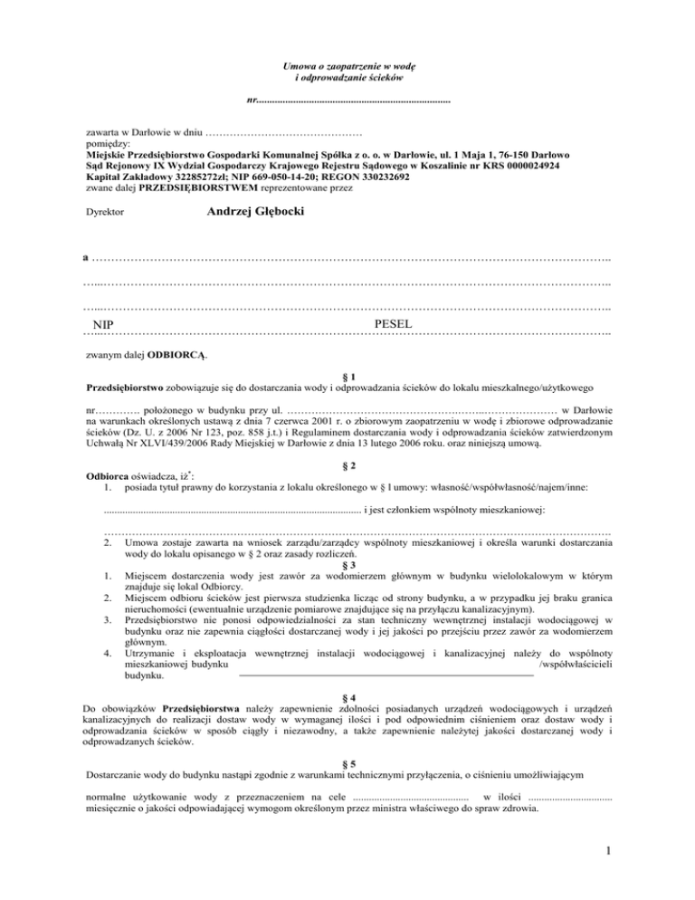 Umowa o zaopatrzenie w wodę i odprowadzanie ścieków nr.......................................................................... zawarta w Darłowie w dniu ……………………………………… pomiędzy: Miejskie Przedsiębiorstwo Gospodarki Komunalnej Spółka z o. o. w Darłowie, ul. 1 Maja 1, 76-150 Darłowo Sąd Rejonowy IX Wydział Gospodarczy Krajowego Rejestru Sądowego w Koszalinie nr KRS 0000024924 Kapitał Zakładowy 32285272zł; NIP 669-050-14-20; REGON 330232692 zwane dalej PRZEDSIĘBIORSTWEM reprezentowane przez Dyrektor Andrzej Głębocki a …………………………………………………………………………………………………………………….. …...………………………………………………………………………………………………………………….. …...………………………………………………………………………………………………………………….. NIP PESEL …...………………………………………………………………………………………………………………….. zwanym dalej ODBIORCĄ. §1 Przedsiębiorstwo zobowiązuje się do dostarczania wody i odprowadzania ścieków do lokalu mieszkalnego/użytkowego nr…………. położonego w budynku przy ul. ………………………………………….……..………………… w Darłowie na warunkach określonych ustawą z dnia 7 czerwca 2001 r. o zbiorowym zaopatrzeniu w wodę i zbiorowe odprowadzanie ścieków (Dz. U. z 2006 Nr 123, poz. 858 j.t.) i Regulaminem dostarczania wody i odprowadzania ścieków zatwierdzonym Uchwałą Nr XLVI/439/2006 Rady Miejskiej w Darłowie z dnia 13 lutego 2006 roku. oraz niniejszą umową. §2 Odbiorca oświadcza, iż*: 1. posiada tytuł prawny do korzystania z lokalu określonego w § l umowy: własność/współwłasność/najem/inne: .................................................................................................. i jest członkiem wspólnoty mieszkaniowej: ………………………………………………………………………………………………………………………………. 2. Umowa zostaje zawarta na wniosek zarządu/zarządcy wspólnoty mieszkaniowej i określa warunki dostarczania wody do lokalu opisanego w § 2 oraz zasady rozliczeń. §3 1. Miejscem dostarczenia wody jest zawór za wodomierzem głównym w budynku wielolokalowym w którym znajduje się lokal Odbiorcy. 2. Miejscem odbioru ścieków jest pierwsza studzienka licząc od strony budynku, a w przypadku jej braku granica nieruchomości (ewentualnie urządzenie pomiarowe znajdujące się na przyłączu kanalizacyjnym). 3. Przedsiębiorstwo nie ponosi odpowiedzialności za stan techniczny wewnętrznej instalacji wodociągowej w budynku oraz nie zapewnia ciągłości dostarczanej wody i jej jakości po przejściu przez zawór za wodomierzem głównym. 4. Utrzymanie i eksploatacja wewnętrznej instalacji wodociągowej i kanalizacyjnej należy do wspólnoty mieszkaniowej budynku ...................................................................................................................../współwłaścicieli budynku. §4 Do obowiązków Przedsiębiorstwa należy zapewnienie zdolności posiadanych urządzeń wodociągowych i urządzeń kanalizacyjnych do realizacji dostaw wody w wymaganej ilości i pod odpowiednim ciśnieniem oraz dostaw wody i odprowadzania ścieków w sposób ciągły i niezawodny, a także zapewnienie należytej jakości dostarczanej wody i odprowadzanych ścieków. §5 Dostarczanie wody do budynku nastąpi zgodnie z warunkami technicznymi przyłączenia, o ciśnieniu umożliwiającym normalne użytkowanie wody z przeznaczeniem na cele ............................................ w ilości ................................ miesięcznie o jakości odpowiadającej wymogom określonym przez ministra właściwego do spraw zdrowia. 1 §6 Przedsiębiorstwo zobowiązuje się do ciągłego odbioru z budynku ścieków. 1. 2. 3. 4. §7 Naprawa, remont oraz konserwacja instalacji wodociągowych i przyłącza wodociągowego z wyłączeniem wodomierza głównego należy do wspólnoty mieszkaniowej/współwłaścicieli budynku. Naprawa, remont, konserwacja instalacji kanalizacyjnych od pierwszej studzienki licząc od strony budynku, a w przypadku jej braku od granicy nieruchomości należy do wspólnoty mieszkaniowej/współwłaścicieli budynku. Wodomierz główny jest własnością Przedsiębiorstwa, a urządzenia pomiarowe własnością wspólnoty mieszkaniowej/współwłaścicieli budynku. Koszty zainstalowania i utrzymania wodomierza głównego pokrywa Przedsiębiorstwo, a urządzenia pomiarowego wspólnota mieszkaniowa/współwłaściciele budynku. §8 Odbiorca zobowiązuje się do: 1. utrzymania właściwego stanu technicznego należących do niego instalacji i urządzeń wodociągowych i kanalizacyjnych, 2. umożliwienia przedstawicielom Przedsiębiorstwa po okazaniu legitymacji służbowej i pisemnego upoważnienia wstępu wraz z niezbędnym sprzętem do lokalu w celu wykonania czynności związanych z plombowaniem oraz odczytem wodomierza (podlicznika) zainstalowanego w lokalu , 3. powierzenia budowy lub dokonania zmian w instalacji oraz urządzeniach wodociągowych i kanalizacyjnych należących do Odbiorcy, osobom posiadającym odpowiednie uprawnienia i kwalifikacje, 4. utrzymania użytkowanego lokalu w sposób nie powodujący utrudnień w prawidłowym funkcjonowaniu sieci i przyłączy wodociągowych i kanalizacyjnych w budynku, , 5. wprowadzania ścieków o stanie i składzie nie zagrażającym prawidłowej eksploatacji urządzeń kanalizacyjnych określonych w ustawie o zbiorowym zaopatrzeniu w wodę i zbiorowym odprowadzaniu ścieków oraz aktach wykonawczych do ustawy, 1. 2. 3. 1. 2. 3. 4. 5. 6. §9 Przedsiębiorstwo nie ponosi odpowiedzialności za ograniczenie albo wstrzymanie dostaw wody bądź ograniczenie lub w