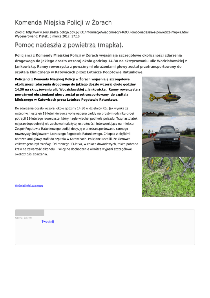 Komenda Miejska Policji w Żorach Źródło: http://www.zory.slaska.policja.gov.pl/k31/informacje/wiadomosci/74693,Pomoc-nadeszla-z-powietrza-mapka.html Wygenerowano: Piątek, 3 marca 2017, 17:10 Pomoc nadeszła z powietrza (mapka). Policjanci z Komendy Miejskiej Policji w Żorach wyjaśniają szczegółowe okoliczności zdarzenia drogowego do jakiego doszło wczoraj około godziny 14.30 na skrzyżowaniu ulic Wodzisławskiej z Jankowicką. Ranny rowerzysta z poważnymi obrażeniami głowy został przetransportowany do szpitala klinicznego w Katowicach przez Lotnicze Pogotowie Ratunkowe. Policjanci z Komendy Miejskiej Policji w Żorach wyjaśniają szczegółowe okoliczności zdarzenia drogowego do jakiego doszło wczoraj około godziny 14.30 na skrzyżowaniu ulic Wodzisławskiej z Jankowicką. Ranny rowerzysta z poważnymi obrażeniami głowy został przetransportowany do szpitala klinicznego w Katowicach przez Lotnicze Pogotowie Ratunkowe. Do zdarzenia doszło wczoraj około godziny 14.30 w dzielnicy Rój. Jak wynika ze wstępnych ustaleń 19-letni kierowca volkswagena caddy na prostym odcinku drogi potrącił 13-letniego rowerzystę, który nagle wjechał pod koła pojazdu. Trzynastolatek najprawdopodobniej nie zachował należytej ostrożności. Interweniujący na miejscu Zespół Pogotowia Ratunkowego podjął decyzję o przetransportowaniu rannego rowerzysty śmigłowcem Lotniczego Pogotowia Ratunkowego. Chłopak z ciężkimi obrażeniami głowy trafił do szpitala w Katowicach. Policjanci ustalili, że kierowca volkswagena był trzeźwy. Od rannego 13-latka, w celach dowodowych, także pobrano krew na zawartość alkoholu. Policyjne dochodzenie wkrótce wyjaśni szczegółowe okoliczności zdarzenia. Wyświetl większą mapę Ocena: 0/5 (0) Tweetnij