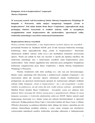 Kampania „Grut to bezpieczeństwo” rozpoczęta! Mariusz Podymniak W uroczystej scenerii Auli Kryształowej Szkoły Głównej Gospodarstwa Wiejskiego 29 listopada w Warszawie, miała miejsce inauguracja kampanii „Grunt to bezpieczeństwo”. Pod takim hasłem firma Bayer CropScience, zapoczątkowała akcję promującą właściwe korzystanie ze środków ochrony roślin ze szczególnym uwzględnieniem zasad bezpieczeństwa dla użytkowników, uprawianych roślin, środowiska naturalnego i oczywiście ostatecznych konsumentów. Bezpieczeństwo dotyczy wszystkich Wszyscy jesteśmy konsumentami, a więc bezpieczeństwo żywności dotyczy nas wszystkich – powiedziała Prorektor ds. Dydaktyki SGGW, prof. dr hab. Krystyna Gutkowska otwierając konferencję, która zapoczątkowała akcję „Grunt to bezpieczeństwo”. Stosowanie chemicznych środków ochrony roślin (ś.o.r.) jest niezbędnym elementem nowoczesnej uprawy. Ważne jest jednak by były one używane w sposób jak najmniej szkodliwy dla środowiska naturalnego oraz z zachowaniem wszelkich zasad bezpieczeństwa przez użytkowników. Takie właśnie zagadnienia były omawiane przez prelegentów listopadowej konferencji zorganizowanej przez Bayer CropScience i Szkołę Główną Gospodarstwa Wiejskiego w Warszawie. Niestety świadomość osób, które użytkują ś.o.r. cały czas jest niewystarczająca. Bardzo często zapominają (lub lekceważą) o podstawowych zasadach związanych z ich stosowaniem takich jak używanie rękawic ochronnych, masek, kombinezonów czy posługiwanie się sprawnym (atestowanym) sprzętem do wykonywania zabiegów środkami ochrony roślin. Kampania „Grunt to bezpieczeństwo”, ma o tym przypominać i uczulać rolników na podstawowe, ale jak ważne dla nich, środki ochrony osobistej – powiedział dr Manfred Weiser dyrektor Bayer CropScience – Szczególnie ważna jest edukacja ludzi młodych, którzy zaczynają lub wkrótce zaczną pracę w gospodarstwach. Dlatego też naszą kampanię zaczynamy w środowisku akademickim, jakim jest SGGW. Oprócz samych zasad bezpiecznego stosowania ś.o.r. bardzo ważna jest ochrona bioróżnorodności w uprawach rolniczych. Według profesora Ettore Capri z Università Cattolica del Sacro Cuore w Milano (Włochy) ekosystemy są podstawą dobrobytu ludzi, dlatego tak istotna i potrzebna jest ich ochrona. Intensyfikacja produkcji rolniczej, z czym często związane jest niewłaściwe wykorzystanie naturalnych zasobów środowiska, powoduje zaburzenia w funkcjonowaniu 1 wielu ekosystemów i znikaniu typowych dla nich gatunków. Dlatego potrzebne są pragmatyczne rozwiązania, które pozwolą na praktycznie wdrażanie informacji o potrzebie zachowania bioróżnorodności w środowisku rolniczym. Najlepiej zacząć je lokalnie, poczynając od danego pola, gospodarstwa i rozszerzać coraz bardziej, zgodnie z hasłem „Myśl lokalnie, działaj globalnie” – mówił prof. Ettore Capri. Programy odpowiadające potrzebom Kolejny z prelegentów Bruno Flodrops od 33 lat pracujący w Bayer CropScience, przedstawił działania jakie firma Bayer podejmuje na rzecz bezpiecznego stasowania środków ochrony roślin. Podstawą w produkcji żywności są rolnicy, bo u nich produkowane są surowce lub gotowe produkty do spożycia. To oni są też filarem bezpiecznej żywności. Dlatego firma Bayer CropScience, stara się cały czas edukować użytkowników ś.o.r. oraz przekazywać im narzędzia pomagające w racjonalny i bezpieczny dla wszystkich sposób chronić uprawy. W tym zakresie w ostatnich latach dużo się zmieniło. Współcześnie stosowane i wprowadzane na rynek pestycydy, nie są już tak szkodliwe dla użytkowników i środowiska naturalnego, jak jeszcze kilkadziesiąt lat temu, a ich skuteczność zapewniają coraz niższe dawki. Cały czas prowadzone są też działania informacyjne o właściwym stosowaniu środków ochrony roślin (DressCode – program, który pomaga dobrać odpowiednie środki ochrony osobistej podczas stosowania produktów z portfolio firmy Bayer CropScience) i ograniczaniu ich negatywnego wpływu na środowisko (przez chociażby właściwy dobór sprzętu do zabiegów). Kolejny element to ochrona środowiska naturalnego, czemu ma służyć chociażby opracowany przez Bayer CropScience system utylizacji pozostałości po myciu sprzętu używanego do zabiegów ochrony roślin pod nazwą Phytobac®. Prof. dr hab. Ryszard Hołownicki z Instytutu Ogrodnictwa w Skierniewicach mówił z kolei o technicznych rozwiązaniach, pozwalających prowadzić ochronę roślin w sposób bezpieczny i skuteczny. Takich rozwiązań jest coraz więcej, ale nie każdego na nie stać. Dlatego jest już miejsce, również na polskim rynku, dla firm usługowych, które posługując się profesjonalnym sprzętem mogłyby wykonywać zabiegi ochrony roślin. Poważnym utrudnieniem we wdrażaniu prawideł związanych ze stosowaniem ś.o.r. jest brak niezależnych specjalistów w tym zakresie. Z wyliczeń prelegenta wynika, że jest ich w Polsce tylko 12 (w tym 8 pracowników naukowych i 4 terenowych pracowników ODR-ów), a programy kształcenia studentów coraz mniej czasu poświęcają przekazywaniu wiedzy o technice ochrony roślin. 2 Zapotrzebowanie na żywność będzie rosło Jak informował prof. dr hab. Stefan Pruszyński z Instytutu Ochrony Roślin Poznaniu, ludności na świecie ciągle przybywa, a wiec zapotrzebowanie na żywność również stale rośnie. To stawia coraz wyższą poprzeczkę całej branży ochrony roślin, od której w dużej mierze uzależniona jest wielkość uzyskiwanych plonów. Bez ochrony roślin możliwe byłoby uzyskanie około 50% obecnych plonów, a nawet ich stosowanie nie zapewnia całkowitej ochrony plonów i średnio na świecie agrofagi (szkodniki, choroby i chwaty) niszczą około 30% zbiorów. Zdaniem prof. S. Pruszyńskiego prawidłowo prowadzona ochrona roślin ma niewielki wpływ na bioróżnorodność, co zostało