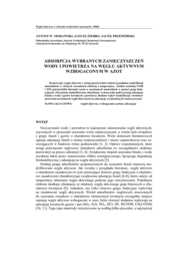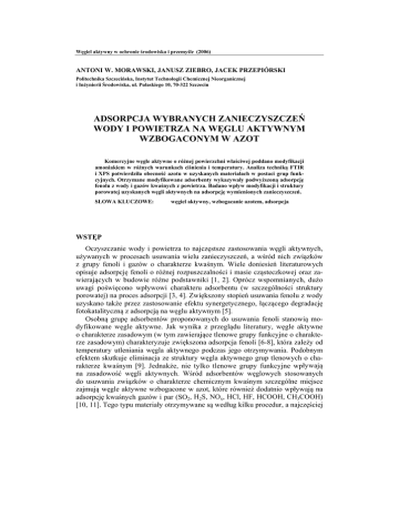 Węgiel aktywny w ochronie środowiska i przemyśle (2006) ANTONI W. MORAWSKI, JANUSZ ZIEBRO, JACEK PRZEPIÓRSKI Politechnika Szczecińska, Instytut Technologii Chemicznej Nieorganicznej i Inżynierii Środowiska, ul. Pułaskiego 10, 70-322 Szczecin ADSORPCJA WYBRANYCH ZANIECZYSZCZEŃ WODY I POWIETRZA NA WĘGLU AKTYWNYM WZBOGACONYM W AZOT Komercyjne węgle aktywne o różnej powierzchni właściwej poddano modyfikacji amoniakiem w różnych warunkach ciśnienia i temperatury. Analiza techniką FTIR i XPS potwierdziła obecność azotu w uzyskanych materiałach w postaci grup funkcyjnych. Otrzymane modyfikowane adsorbenty wykazywały podwyższoną adsorpcję fenolu z wody i gazów kwaśnych z powietrza. Badano wpływ modyfikacji i struktury porowatej uzyskanych węgli aktywnych na adsorpcję wymienionych zanieczyszczeń. SŁOWA KLUCZOWE: węgiel aktywny, wzbogacanie azotem, adsorpcja WSTĘP Oczyszczanie wody i powietrza to najczęstsze zastosowania węgli aktywnych, używanych w procesach usuwania wielu zanieczyszczeń, a wśród nich związków z grupy fenoli i gazów o charakterze kwaśnym. Wiele doniesień literaturowych opisuje adsorpcję fenoli o różnej rozpuszczalności i masie cząsteczkowej oraz zawierających w budowie różne podstawniki [1, 2]. Oprócz wspomnianych, dużo uwagi poświęcono wpływowi charakteru adsorbentu (w szczególności struktury porowatej) na proces adsorpcji [3, 4]. Zwiększony stopień usuwania fenolu z wody uzyskano także przez zastosowanie efektu synergetycznego, łączącego degradację fotokatalityczną z adsorpcją na węglu aktywnym [5]. Osobną grupę adsorbentów proponowanych do usuwania fenoli stanowią modyfikowane węgle aktywne. Jak wynika z przeglądu literatury, węgle aktywne o charakterze zasadowym (w tym zawierające tlenowe grupy funkcyjne o charakterze zasadowym) charakteryzuje zwiększona adsorpcja fenoli [6-8], która zależy od temperatury utleniania węgla aktywnego podczas jego otrzymywania. Podobnym efektem skutkuje eliminacja ze struktury węgla aktywnego grup tlenowych o charakterze kwaśnym [9]. Jednakże, nie tylko tlenowe grupy funkcyjne wpływają na zasadowość węgli aktywnych. Wśród adsorbentów węglowych stosowanych do usuwania związków o charakterze chemicznym kwaśnym szczególne miejsce zajmują węgle aktywne wzbogacone w azot, które również dodatnio wpływają na adsorpcję kwaśnych gazów i par (SO2, H2S, NOx, HCl, HF, HCOOH, CH3COOH) [10, 11]. Tego typu materiały otrzymywane są według kilku procedur, a najczęściej Adsorpcja wybranych zanieczyszczeń wody i powietrza na węglu aktywnym wzbogaconym w azot 49 poprzez modyfikację adsorbentu gazowym amoniakiem. Alternatywnym popularnym sposobem prowadzącym do otrzymania węgla aktywnego wzbogaconego w azot jest klasyczna karbonizacja i aktywacja polimerów zawierających w swoim składzie azot [12, 13]. W przypadku modyfikacji amoniakiem proces prowadzi się w podwyższonej temperaturze (700900°C) i pod ciśnieniem atmosferycznym, a produktem jest adsorbent zawierający powierzchniowe grupy funkcyjne typu: C-N i C=N, grupy amidowe (cykliczne) oraz nitrylowe (C≡N) [14]. Możliwe jest również tworzenie powierzchniowych grup N-H typu pirolowego [15]. Z racji braku doniesień na temat możliwości modyfikacji węgla aktywnego amoniakiem w warunkach niskiej temperatury podjęto takie próby, utrzymując temperaturę na poziomie 300°C przy jednoczesnym zastosowaniu zwiększonego ciśnienia. 1. CZĘŚĆ DOŚWIADCZALNA 1.1. Materiały Węgle aktywne badane w tej pracy (CWZ-11, CWZ-30 i CWZ-35), wyprodukowane przez GRYFSKAND, sp. z o.o., charakteryzuje różna objętość mikroporów i powierzchnia właściwa BET (rys. 1). 0,19 CWZ30 Objętość porów d < 2 nm, [cm3/g] 0,18 0,17 0,16 0,15 CWZ35 0,14 0,13 0,12 CWZ11 0,11 0,10 680 982 1323 BET SSA, [m2/g] Rys. 1. Powierzchnia właściwa BET węgli aktywnych użytych w badaniach i odpowiadająca im objętość mikroporów Węgle te poddawano odpowiedniej modyfikacji w kierunku zwiększenia zawartości azotu w ich strukturze. Modyfikację prowadzono z użyciem gazowego amoniaku w różnych temperaturach pod ciśnieniem atmosferycznym oraz z użyciem mieszaniny pary wodnej i amoniaku pod zwiększonym ciśnieniem. Modyfikacja gazowym amoniakiem prowadzona była w piecu z możliwością programowania temperatury. Próbkę ok. 100 mg węgla aktywnego przemywano argonem i ogrze- 50 A.W. Morawski, J. Ziebro, J. Przepiórski wano w zadanej temperaturze (od 400 do 800°C) przez 2 h w atmosferze przepływającego amoniaku. W drugim wariancie węgle aktywne poddawano działaniu mieszaniny NH4Cl i NaOH w małym (poj. 7 cm3) reaktorze ciśnieniowym. Używane reagenty dobrano tak, aby spowodować w reaktorze reakcję chemiczną, produktem której byłby amoniak, a dodatkowym efektem wzrost ciśnienia. Z racji braku możliwości pomiaru ciśnienia w reaktorze parametr ten ustalano jedynie poprzez stosowanie różnych ilości reagentów. Proces modyfikacji prowadzono w 300°C przez 3 h, a po jego zakończeniu uzyskaną mieszaninę przemywano wodą i suszono w 105°C. 1.2. Metodyka pomiarów Pomiary zawartości azotu na powierzchni węgli aktywnych prowadzono z użyciem spektroskopu XPS (Perkin-Elmer PHI ESCA-5600 ze źródłem promieniowania Mg K). Do obliczeń powierzchni właściwej BET wykorzystano izotermy adsorpcji azotu w 77 K, zmierzone przy użyciu aparatu Micromeritics ASAP 2000. W celu wyznaczenia stężeń fenolu naważki węgli aktywnych zalewano odpowiednim roztworem i termostatowano w 298 K przez 2 h, po czym mierzono absorbancję (max = 269 nm) z użyciem spektrofotometru UV-VIS (Jasco V-530). Ilości fenolu zaadsorbowanego na węglach aktywnych obliczano wg równania xv (c0 ce ) m (1) gdzie: x - ilość zaadsorbowanego fenolu, mg/g, v - objętość roztworu fenolu używanego do pomiarów, dm3, c0 - stężenie początkowe fenolu, mg/dm3, ce - stężenie fenolu po 2 h, mg/dm3, m - masa węgla aktywnego u