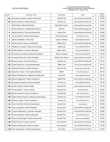 LISTA STARTOWA Lp. NR Kierowca / Pilot 1. Nowogardzki Rajd Samochodowy 4 runda Rajdowych Mistrzostw Polski Zachodniej Nowogard, 20-21 czerca 2015r. Samochód Klub Kl. Godz. Startu 1 41 Radosław Lisowski / Daniel Frąckowiak MG ZR 160 Automobilklub Koszaliński G 10:00 2 42 Marcin Stencel / Henryk Stencel Citroen C2 Automobilklub RallyLand G 10:01 Mitsubishi Lancer Automobilklub Koszaliński 5 10:02 Audi S4 Automobilklub Stargardzki 5 10:03 3 1 Rafał Gałka / Michał Sowiński 4 2 Łukasz Zbrzeźny / Aleksandra Zbrzeźna 5 4 Michał Iwańcio / Krzysztof Brodziński Honda Civic Automobilklub Koszaliński 3 10:04 6 6 Tomasz Buńka / Marceli Stankiewicz Audi A4 Quattro Auto Klub Szczecin 5 10:05 7 7 Mariusz Rybiński / Anna Elek Subaru Impreza Automobilklub Morski 5 10:06 8 8 Marek Walas / Mariusz Jażdżewski BMW 323 ti Automobilklub Stargardzki 5 10:07 9 9 Waldemar Dziedzic / Bartosz Piotrowski BMW E36 Automobilklub Morski 5 10:08 BMW 323 ti niezrzeszony (Dębno) 5 10:09 Subaru Impreza niezrzeszony (Chodzież) 5 10:10 Honda Civic Type-R Automobilklub Koszaliński 4 10:11 Honda Civic Automobilklub Stargardzki 4 10:12 BMW 320 niezrzeszony (Dargomyśl) 4 10:13 Renault Clio niezrzeszony (Koszalin) 4 10:14 BMW Auto Klub Szczecin 4 10:15 10 10 Paweł Kiełbasa / Jarosław Bezpalko 11 11 Przemysław Kamiński / Marek Cerajewski 12 15 Krzysztof Mazurek / Kamil Początek 13 19 Mariusz Kumor / Krzysztof Kumor 14 20 Leszek Dobrucki / Krzysztof Bezpalko 15 21 Andrzej Dubnicki / Adam Szewczyk 16 22 Sebastian Tessar / Przemysław Motyka 17 23 Adam Grześkowiak / Angelina Grześkowiak Kia Cee'd Automobilklub Morski 4 10:16 18 24 Bartosz Dębowski / Albert Kuklewski BMW E36 Automobilklub Stargardzki 4 10:17 19 25 Krzysztof Listewnik / Damian Macholl Ford Focus Automobilklub Morski 4 10:18 20 26 Łukasz Zupnik / Paulina Pałka Renault Clio Automobilklub Koszaliński 4 10:19 21 27 Tomasz Bilski / Tomasz Kozicki Honda Civic KM Winogrady 3 10:20 22 28 Karol Lemański / Dariusz Chałupnik Honda CRX Auto Klub Szczecin 3 10:21 23 29 Robert Wielochowski / Malwina Górgurewicz Honda Civic Automobilklub Morski 3 10:22 24 30 Damian Czekan / Karol Turkiewicz Citroen C2 Auto Klub Szczecin 3 10:23 25 31 Oscar Schmidt / Marta Korszyłowska Honda Civic niezrzeszony 3 10:24 26 34 Dariusz Pękalski / Daniel Pękalski Honda Civic Automobilklub Stargardzki 2 10:25 27 35 Tomasz Piątkowski / Jarosław Wszelaki Honda Civic Automobilklub Stargardzki 2 10:26 28 37 Kamil Szulborski / Alicja Szulborska Honda Civic Auto Klub Szczecin 2 10:27 29 38 Dariusz Szarawaga / Tomasz Brzozowski Honda Civic niezrzeszony (Dębno) 2 10:28 30 39 Paweł Horanin / Łukasz Horanin Fiat Seicento Automobilklub Koszaliński 1 10:29 31 40 Mateusz Milczarek / Damian Pakosz Fiat Seicento Automobilklub RallyLand 1 10:30 32 18 Piotr Frąckowiak / Monika Frąckowiak Fiat 126p Automobilklub Koszaliński 1 10:31