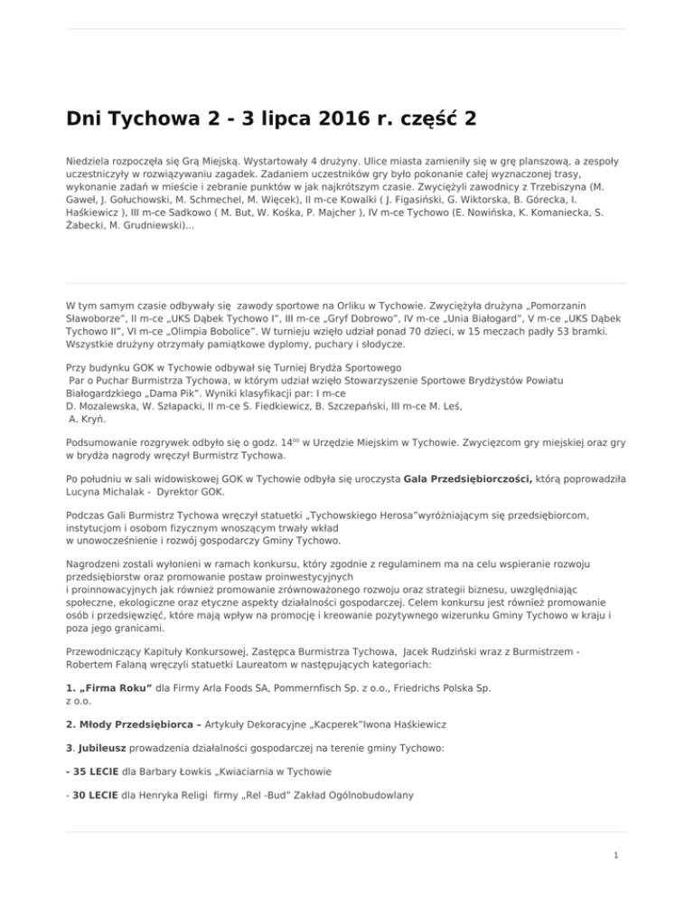 Dni Tychowa 2 - 3 lipca 2016 r. część 2 Niedziela rozpoczęła się Grą Miejską. Wystartowały 4 drużyny. Ulice miasta zamieniły się w grę planszową, a zespoły uczestniczyły w rozwiązywaniu zagadek. Zadaniem uczestników gry było pokonanie całej wyznaczonej trasy, wykonanie zadań w mieście i zebranie punktów w jak najkrótszym czasie. Zwyciężyli zawodnicy z Trzebiszyna (M. Gaweł, J. Gołuchowski, M. Schmechel, M. Więcek), II m-ce Kowalki ( J. Figasiński, G. Wiktorska, B. Górecka, I. Haśkiewicz ), III m-ce Sadkowo ( M. But, W. Kośka, P. Majcher ), IV m-ce Tychowo (E. Nowińska, K. Komaniecka, S. Żabecki, M. Grudniewski)... W tym samym czasie odbywały się zawody sportowe na Orliku w Tychowie. Zwyciężyła drużyna „Pomorzanin Sławoborze”, II m-ce „UKS Dąbek Tychowo I”, III m-ce „Gryf Dobrowo”, IV m-ce „Unia Białogard”, V m-ce „UKS Dąbek Tychowo II”, VI m-ce „Olimpia Bobolice”. W turnieju wzięło udział ponad 70 dzieci, w 15 meczach padły 53 bramki. Wszystkie drużyny otrzymały pamiątkowe dyplomy, puchary i słodycze. Przy budynku GOK w Tychowie odbywał się Turniej Brydża Sportowego Par o Puchar Burmistrza Tychowa, w którym udział wzięło Stowarzyszenie Sportowe Brydżystów Powiatu Białogardzkiego „Dama Pik”. Wyniki klasyfikacji par: I m-ce D. Mozalewska, W. Szłapacki, II m-ce S. Fiedkiewicz, B. Szczepański, III m-ce M. Leś, A. Kryń. Podsumowanie rozgrywek odbyło się o godz. 1400 w Urzędzie Miejskim w Tychowie. Zwycięzcom gry miejskiej oraz gry w brydża nagrody wręczył Burmistrz Tychowa. Po południu w sali widowiskowej GOK w Tychowie odbyła się uroczysta Gala Przedsiębiorczości, którą poprowadziła Lucyna Michalak - Dyrektor GOK. Podczas Gali Burmistrz Tychowa wręczył statuetki „Tychowskiego Herosa”wyróżniającym się przedsiębiorcom, instytucjom i osobom fizycznym wnoszącym trwały wkład w unowocześnienie i rozwój gospodarczy Gminy Tychowo. Nagrodzeni zostali wyłonieni w ramach konkursu, który zgodnie z regulaminem ma na celu wspieranie rozwoju przedsiębiorstw oraz promowanie postaw proinwestycyjnych i proinnowacyjnych jak również promowanie zrównoważonego rozwoju oraz strategii biznesu, uwzględniając społeczne, ekologiczne oraz etyczne aspekty działalności gospodarczej. Celem konkursu jest również promowanie osób i przedsięwzięć, które mają wpływ na promocję i kreowanie pozytywnego wizerunku Gminy Tychowo w kraju i poza jego granicami. Przewodniczący Kapituły Konkursowej, Zastępca Burmistrza Tychowa, Jacek Rudziński wraz z Burmistrzem Robertem Falaną wręczyli statuetki Laureatom w następujących kategoriach: 1. „Firma Roku” dla Firmy Arla Foods SA, Pommernfisch Sp. z o.o., Friedrichs Polska Sp. z o.o. 2. Młody Przedsiębiorca – Artykuły Dekoracyjne „Kacperek”Iwona Haśkiewicz 3. Jubileusz prowadzenia działalności gospodarczej na terenie gminy Tychowo: - 35 LECIE dla Barbary Łowkis „Kwiaciarnia w Tychowie - 30 LECIE dla Henryka Religi firmy „Rel -Bud” Zakład Ogólnobudowlany 1 - 25 LECIE dla Lilli Marczyk Sklep Spożywczo-Przemysłowy „LILLA”, Konrada Ciasia Gabinet Weterynaryjny, Mariana Kowalczyka - Sklep Spożywczo-Przemysłowy, Ryszarda Joba Usługowy Zakład Ślusarski, Marii Stelmach „MasterPOL”, - 20 LECIE dla Ryszarda Olendra Usługi Leśne, Ryszarda Grubalskiego Zakład Usług Leśnych, Bernarda Kłosowskiego „Trans-Żwir”, dr Marka Brzuchacza Niepubliczny Zakład Opieki Zdrowotnej MEDJOL II, dr Genowefy Kozłowskiej-Brzuchacz Indywidualna Specjalistyczna Praktyka Lekarska, Henryka Turka Zakład Ogólnobudowlany, 4. Mecenas Kultury : Friedrichs Polska Sp. z o.o., Arla Foods S.A. , Trend Meble Sp. z o.o., Bank Spółdzielczy w Białogardzie, Nadleśnictwo Tychowo, Pommernfisch Sp. z o.o. 5. Działalność Społeczna osobom aktywnie działającym na rzecz społeczności lokalnej służąc rozwojowi kultury, oświaty i sportu: Zespołowi Ludowemu Dobrowianki, Zespołowi Ludowemu Radość, Zofii Jarzębskiej prezes Stowarzyszenia AMICUS, Wiktorowi Rakoczemu, Iwonie Haśkiewicz Sołtys Sołectwa Kowalki, Annie Sokołowskiej Sołtys Sołectwa Wicewo, Zdzisławowi Polkowi, Marii Stelmach Sołtys Sołectwa Dobrowo, Bogdanowi Brzozowskiemu oraz Czesławowi Możdżyńskiemu. Burmistrz Tychowa przyznał nagrodę specjalną „Tychowskiego Herosa” Krzysztofowi Pluskocie, mieszkańcowi Sadkowa, który jest absolwentem Szkoły Podstawowej w Tychowie, osiąga znaczące sukcesy zawodowe w dziedzinie kultury. Jest aktorem filmowym i teatralnym, artystą kabaretowym, absolwentem Państwowej Szkoły Teatralnej w Krakowie. Od 2016 jest dyrektorem krakowskiego Teatru Scena STU. Nagrodę specjalną otrzymał również Peter Böhm, Burmistrz partnerskiej Gminy Neverin z Niemiec za wzorową współpracę transgraniczną. Podczas Gali wręczona została również nagroda i podziękowanie za udział w I Konkursie Amatorskich Filmów Dokumentalnych „Z kamerą po Gminie Tychowo” Otrzymała ją Ewelina Budzińska, która jako jedyna przygotowała film promocyjny o gminie Tychowo. Atrakcją wieczoru był spektakl „Grupy Rafała Kmity” pt: „Wszyscyśmy z jednego szynela”. Z aktorami specjalnie przybyłymi z Krakowa wystąpił Krzysztof Pluskota. Na zakończenie Burmistrz zaprosił wszystkich uczestników Gali na poczęstunek. Bardzo dziękujemy wszystkim, którzy byli z nami podczas obchodów Dni Miasta Tychowa oraz tym którzy pracowali i pomagali podczas organizacji imprezy. Dziękujemy sponsorom: Gminnej Komisji Profilaktyki i Rozwiązywania Problemów Alkoholowych, która ufundowała nagrody dla zawodników Gry Miejskiej, panu Grzegorzowi Giedrojć, panu Maciejowi Danowskiemu „Sklep Sportowy Fan Sport 24”, Klubowi Fitness Forma Białogard, który wsparł turniej siłaczy, Robertowi Radziuk, Aurelii i Eugeniuszowi Duczyńskim, Sandrze i Krzysztofowi Gryga za współorganizację rozgrywek piłkarskich, Firmie TREND MEBLE za p