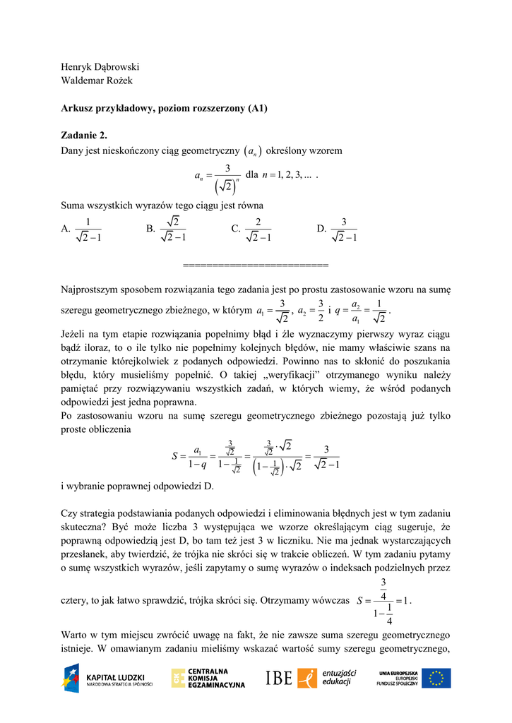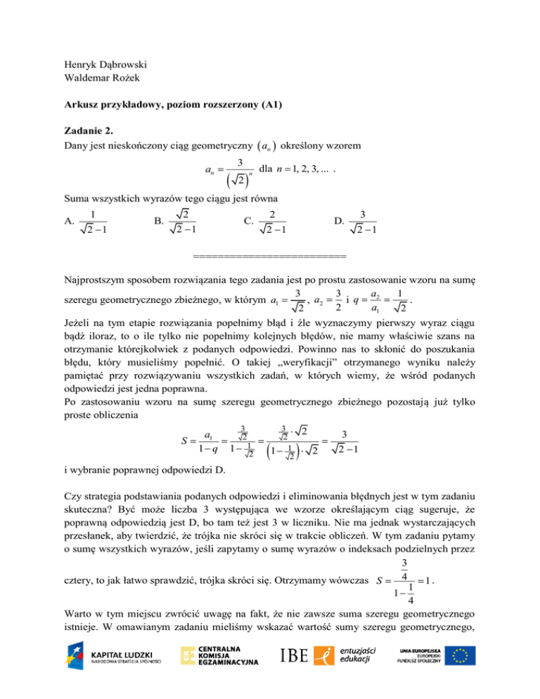 Henryk Dąbrowski Waldemar Rożek Arkusz przykładowy, poziom rozszerzony (A1) Zadanie 2. Dany jest nieskończony ciąg geometryczny an określony wzorem an 3 2 n dla n 1, 2, 3, ... . Suma wszystkich wyrazów tego ciągu jest równa A. 1 2 1 B. 2 2 1 C. 2 2 1 D. 3 2 1 ========================= Najprostszym sposobem rozwiązania tego zadania jest po prostu zastosowanie wzoru na sumę a 1 3 3 szeregu geometrycznego zbieżnego, w którym a1 , a2 i q 2 . a1 2 2 2 Jeżeli na tym etapie rozwiązania popełnimy błąd i źle wyznaczymy pierwszy wyraz ciągu bądź iloraz, to o ile tylko nie popełnimy kolejnych błędów, nie mamy właściwie szans na otrzymanie którejkolwiek z podanych odpowiedzi. Powinno nas to skłonić do poszukania błędu, który musieliśmy popełnić. O takiej „weryfikacji” otrzymanego wyniku należy pamiętać przy rozwiązywaniu wszystkich zadań, w których wiemy, że wśród podanych odpowiedzi jest jedna poprawna. Po zastosowaniu wzoru na sumę szeregu geometrycznego zbieżnego pozostają już tylko proste obliczenia 3 3 2 a1 3 2 2 S 1 q 1 1 2 1 1 1 2 2 2 i wybranie poprawnej odpowiedzi D. Czy strategia podstawiania podanych odpowiedzi i eliminowania błędnych jest w tym zadaniu skuteczna? Być może liczba 3 występująca we wzorze określającym ciąg sugeruje, że poprawną odpowiedzią jest D, bo tam też jest 3 w liczniku. Nie ma jednak wystarczających przesłanek, aby twierdzić, że trójka nie skróci się w trakcie obliczeń. W tym zadaniu pytamy o sumę wszystkich wyrazów, jeśli zapytamy o sumę wyrazów o indeksach podzielnych przez 3 cztery, to jak łatwo sprawdzić, trójka skróci się. Otrzymamy wówczas S 4 1 . 1 1 4 Warto w tym miejscu zwrócić uwagę na fakt, że nie zawsze suma szeregu geometrycznego istnieje. W omawianym zadaniu mieliśmy wskazać wartość sumy szeregu geometrycznego, a więc w ogóle nie musieliśmy zastanawiać się, czy ta suma ma wartość skończoną, ani czy w ogóle istnieje. Natomiast w zadaniu, w którym jest dany jest szereg geometryczny, a zadanie polega na obliczeniu sumy tego szeregu należy sprawdzić warunek konieczny i wystarczający zbieżności szeregu, a więc czy iloraz q 1 (zakładamy przy tym, że ciąg 0,0,0,... jest geometryczny i jego ilorazem jest q 0 ). Aby zilustrować, jak ważne jest sprawdzenie warunku q 1 , przedstawimy rozwiązania następujących dwóch zadań. Zadanie 2a. Dany jest nieskończony ciąg geometryczny an określony wzorem an 3 2 1 n dla n 1, 2, 3, ... . Oblicz sumę wszystkich wyrazów tego ciągu. ========================= Rozwiązanie Pierwszy wyraz ciągu an jest równy a1 3 1 , iloraz tego ciągu jest równy q . 2 1 2 1 a1 na sumę wszystkich wyrazów nieskończonego 1 q ciągu geometrycznego, to otrzymalibyśmy Gdybyśmy teraz zastosowali wzór S S 3 2 1 1 1 2 1 3 2 1 3 . 2 1 2 1 1 2 2 Mogłoby się więc wydawać, że rozwiązaliśmy zadanie. Jednak, wystarczy spojrzeć na otrzymaną liczbę, żeby zauważyć, że jest ona ujemna (mianownik otrzymanego ułamka jest ujemny, a licznik dodatni). W takim razie nie może to być suma wszystkich wyrazów ciągu, gdyż wszystkie te wyrazy są liczbami dodatnimi. Co więc zrobiliśmy źle? Otóż nie sprawdziliśmy, czy suma wszystkich wyrazów naszego ciągu jest skończona. Liczba 1 1 q jest większa od 1, gdyż ułamek jest dodatni, a jego mianownik jest 2 1 2 1 mniejszy od licznika. Oznacza to, że ciąg an , którego wyrazy są dodatnie, co zauważyliśmy już wcześniej, jest rosnący. Sumując więc kolejne wyrazy ciągu dodawalibyśmy coraz większe liczby dodatnie. Zatem suma nieskończenie wielu takich liczb nie może być liczbą skończoną. Jest ona nieskończenie wielka, co możemy zapisać a1 a2 a3 ... . Możemy zatem zapisać, że suma wszystkich wyrazów nieskończonego ciągu geometrycznego 1 nie jest liczbą rzeczywistą. Dlatego po obliczeniu q wystarczyło stwierdzić, że 2 1 1 1 , a więc nie istnieje skończona suma wszystkich wyrazów tego ciągu. 2 1 Zadanie 2b. Dany jest nieskończony ciąg geometryczny an określony wzorem an 3 2 3 n dla n 1, 2, 3, ... . Oblicz sumę wszystkich wyrazów tego ciągu. ========================= Rozwiązanie Pierwszy wyraz ciągu an jest równy a1 3 1 . Iloraz tego ciągu jest równy q . 2 3 2 3 Łatwo zauważyć, że jest to liczba ujemna, ale większa od 1 . Zatem spełnia warunek q 1 . Wobec tego istnieje skończona suma wszystkich wyrazów nieskończonego an i jest ona równa 3 a 3 2 3 3 . S 1 2 13 1 q 1 2 3 2 3 2 3 1 2 4 Jak widać, wzór na sumę wszystkich wyrazów nieskończonego ciągu geometrycznego należy stosować rozważnie, upewniając się wcześniej, że taka suma jest skończona.