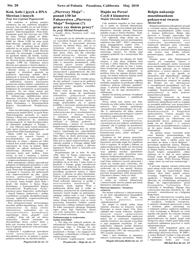 Str. 20 News of Polonia Koń, koło i język a DNA Słowian i innych Prof. Iwo Cyprian Pogonowski Jak wiadomo w polskiej pamięci narodowej nie ma wędrówki przodków naszych, nim osiedlili się oni nad Wisłą i mówili językiem należącym do rodziny języków Indo-Europejskich. Proto-IndoEuropejski język był używany już 5,500 lat temu. Istnieje pogląd, że BałtoSłowianie byli nad Bałtykiem od blisko 4,000 lat. Około 3,500 lat temu język Bałto-Słowian oddzielił się od języka Arian, a 500 lat później język Bałtów oddzielił się od języka Słowian, poczym przez następne 1,500 lat języki Słowian rozwijały się równolegle z pokrewnymi im językami takimi jak Grecki, Łacina, Perski, Kurdyjski, Celtycki, Germański etc. Rozwój języka polskiego trwał przez następne 1,500 lat. Natomiast nazwa Słowian jest zapisana w historii dopiero w pierwszym milenium ery chrześcijańskiej. Obecnie stoimy u progu wielkich osiągnięć w dziedzinie genetyki na podstawie datowania próbek DNA pobranych w kościach ludzi zmarłych w dalekiej przeszłości. Jak wiemy najbliższe i najbardziej intymne powiązania genetyczne między ludźmi z pokolenia na pokolenie są łatwo zrozumiałe, natomiast trudniejsze do zrozumienia są powiązania językowe. Na ten temat ważna jest książka archeologa angielskiego, David’a W. Anthony’ego, opublikowana przez Princeton University Press pod tytułem „Koń, Koło i Język: Jak Jeźdźcy w Epoce Brązu Pochodzący z Euroazjatyckich Stepów Ukształtowali Współczesny Świat,” Autor ten udowadnia za pomocą bardzo gruntownych ustaleń DNA, że język Proto -Indo-Europejski pochodzi ze stepów Ukrainy i Rosji oraz wymienia kluczowe zdarzenia podstawowe do zaistnienia wystarczających sił Indo-Europejczyków do dokonania podbojów w Europie i w Azji. Obecnie około trzech miliardów ludzi mówi językami pochodzącymi od języka Proto-Indo-Europejskiego. Około 4,800 lat temu koń został oswojony na stepach Eurazji i prawdopodobnie na początku był hodowany na mięso i dopiero po kilku wiekach koń został osiodłany a następnie zaprzężony do wozu na kołach. Ślady wędzidła na zębach kiełzanych koni umożliwiają określenie postępu w używaniu konia pod siodłem. Autor uważa, że koń i związany z koniem wynalazek koła miały kluczowe znaczenie w rozpowszechnianiu języka. Brak umiejętności pisania spowodował poleganie na deklamacji poematów w celu przekazywania informacji, dzięki czemu język Proto-Indo-Europerjski rozwijał się i pomagał w tworzeniu elit społecznych oraz rozpowszechniał się jako „język awansu społecznego” najbardziej rozpowszechniony ze wszystkich języków na świecie. Autor książki „Koń, Koło i Język: Jak Jeźdźcy w Epoce Brązu Pochodzący z Euroazjatyckich Stepów Ukształtowali Współczesny Świat,” przytacza prace lingwistów, archeologów i innych badaczy naukowych i podaje czytelnikom szczegóły skomplikowanego rozwoju najbardziej rozpowszechnionej rodziny języków na świecie. Przy przygotowywaniu uniwersalnego słownika polsko-angielskiego, który jest zamieszczony na mojej stronie internetowej, natknąłem się na starosłowiańskie pochodzenie angielskiego słowa „pogoda” czyli „weather,” które tak jak też słowo niemieckie „Wetter” pochodzi od słowiańskiego słowa „wetru,” które z kolei jest wczesną formą słowa „wiatr.” Jest to logiczne ponieważ wiatr powoduje zmiany pogody. Ciekawym i wyjątkowym zjawiskiem wśród nowoczesnych języków słowiańskich jest to, że jedynie w języku polskim zachowały się starosłowiańskie Pogonowski do str. 23 Pasadena, California „Pierwszy Maja” ponad 130 lat Fałszerstwa „Pierwszy Maja” Świętem (?) pracy czy dniem pracy? ks. prof. Michał Poradowski, z książki „Nowy Światowy Ład”, wyd. Wers, 1994 Od przeszło stu lat obchodzi się prawie we wszystkich krajach tzw. „Święto (?) Pracy”, która to uroczystość powinna nazywać się Dniem Pracy, jako że ze świętością niewiele ma wspólnego. Słusznym jest, że uwagę skupia się na tym dniu pracy, który jest dla człowieka charak¬terystyczny, bowiem tylko człowiek pracuje, w ścisłym tego słowa znaczeniu (zwierzęta i maszyny „pracują” tylko w znaczeniu przenośnym), tylko człowiek używa swoich zdolności twórczym dla powiększenia i polepszenia dóbr kulturalnych, intelektualnych, artystycznych i gospodarczych, aby móc żyć lepiej i dostatniej, aby samego siebie doskonalić przez pracę. Kościół zawsze chwalił wszelką pracę, do niej zachęcał i wynosi ją do godności cnoty (pracowitość). Papież, Jan Paweł II poświęcił pracy specjalną encyklikę, Laborem exercens. Przez wiele lat obchody Dnia Pracy były często okazją do manifestacji robotników, połączonych nieraz z gwałtem i zajściami, co powodowało interwencje policji, bowiem zajścia te mogły przekształcić się w groźne konflikty i niszczenie mienia prywatnego i publicznego. Niejednokrotnie obchodzenie Dnia Pracy było wykorzystywane przez rewolucjonistów i terror ys tów i d la tego b ywa ły w niektórych okresach zakazywane. Dopiero po drugiej wojnie światowej obchody te nabrały godności i umiarkowania, i prawie we wszystkich krajach zostały zalegalizowane. Niektórzy występujący przy tej okazji mówcy, wspominają tzw. „męczenników z Chicago” i przypisują ustalenie obchodu Dnia Pracy na dzień pierwszego maja, jako rzekomą datę zajść w tym mieście. Otóż jest to jakieś nieporozumienie, gdyż odnośny pomnik w Chicago oddaje hołd nie robotnikom, lecz policji, a głównie kapitanowi Ward, który w zajściach tych stracił życie. Przypomnijmy jak to było. W roku 1886, dnia 16 lutego, rozpoczyna się strajk robotników w fabryce maszyn rolniczych MacCormik. Strajk ten przedłuża się aż do dnia 3 maja, kiedy to przybyła z Europy grupa zawodowych terrorystów i dołączyła do strajkujących, n